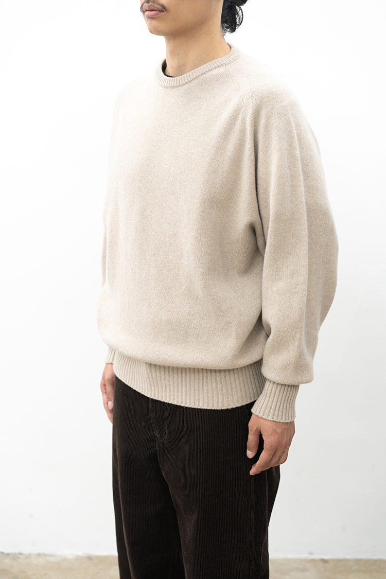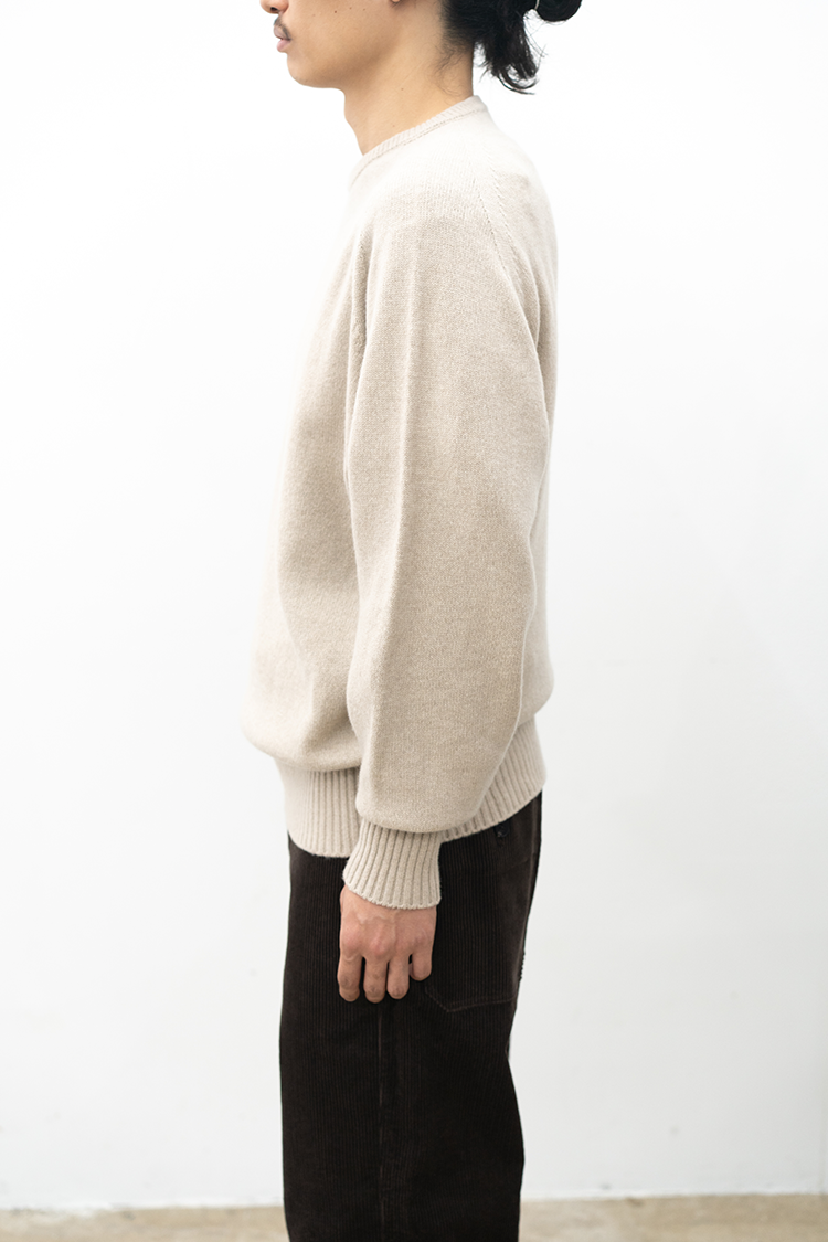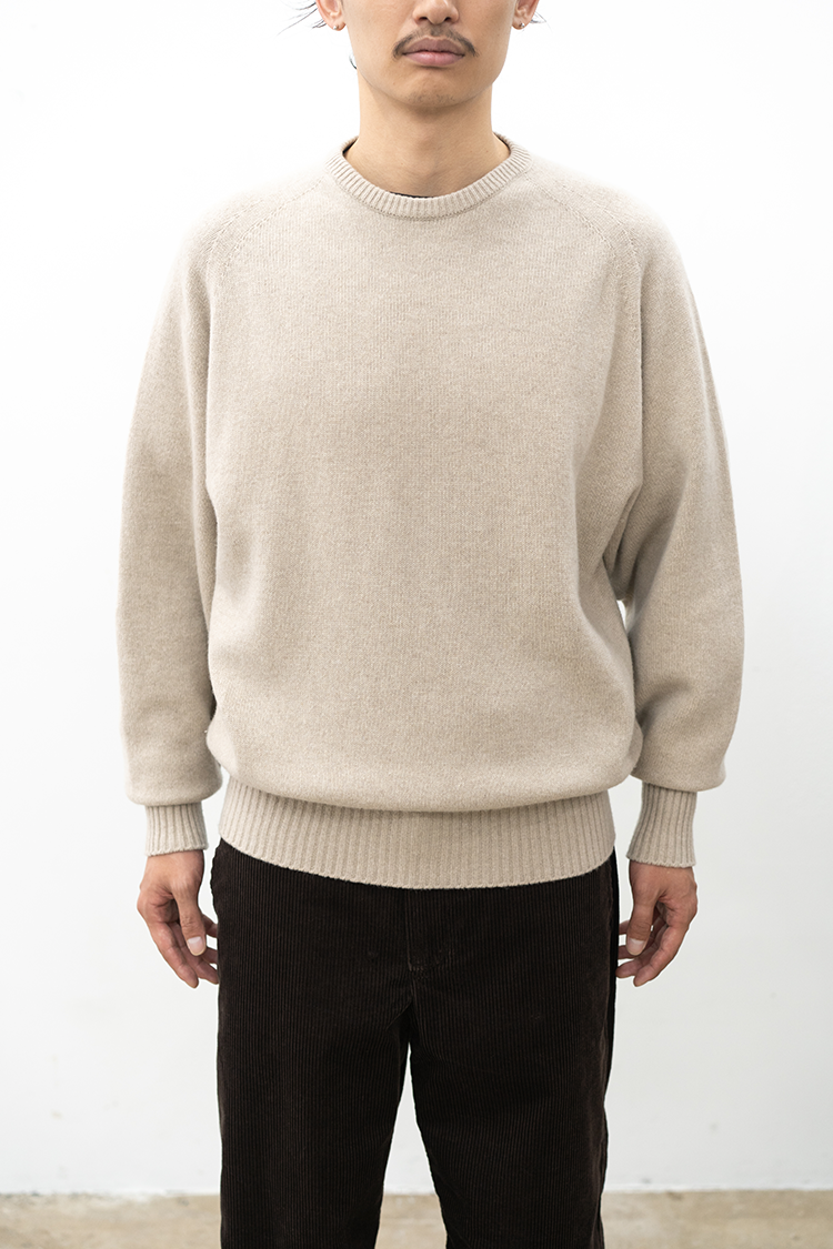 ラグランの大きなアームホール、長めのリブ、コンパクトなクルーネックというバランスでベーシックでありながらサイズバランスで普通過ぎない、飽きの来ないバランスに仕上げています。ウールの繊維の持つ適度なハリ感が快適な着心地に。