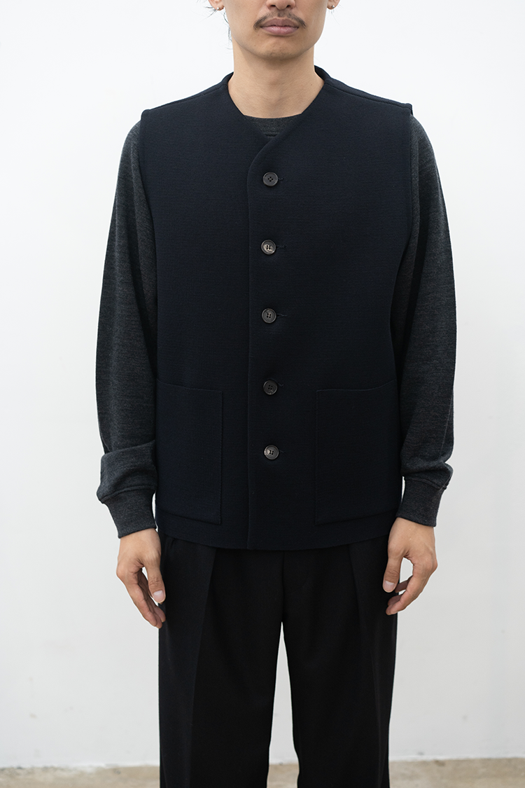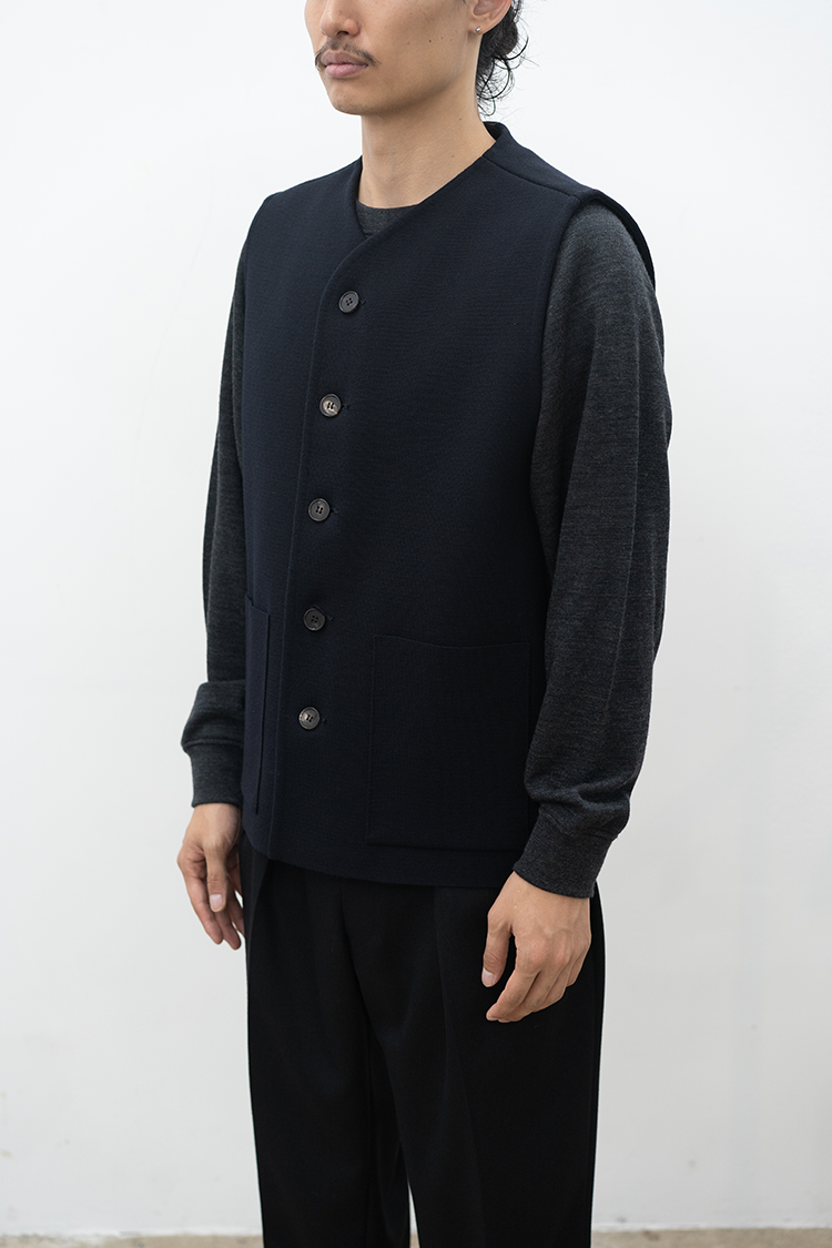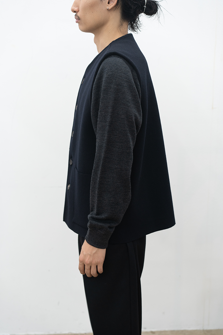 BATONERとしても新たに挑戦をしたアイテム。成形編みの技術を用いてパターンを作り、縫製をすることで織物で作ったような洋服を製作しました。スペインを起源とするメリノ種の持つドライな風合いと膨らみを生かした糸を使用。超度詰めしたミラノリブ組織で編み立てました。構築的なフォルムと耐久性に優れニットアウターの可能性を探った新たな商品です。 素材 WOOL 100% ※着用詳細 173cm / NAVY / SIZE 2 サイズスペック 【2】着丈‐67.0cm 身幅‐58.0cm 肩幅-41.0cm