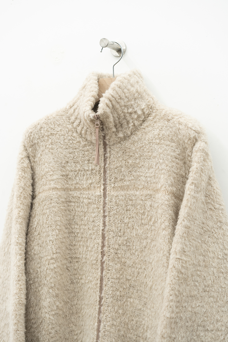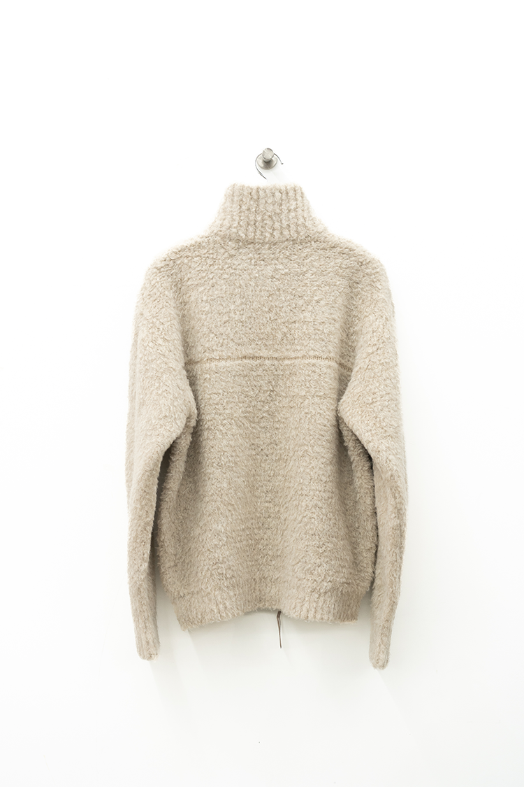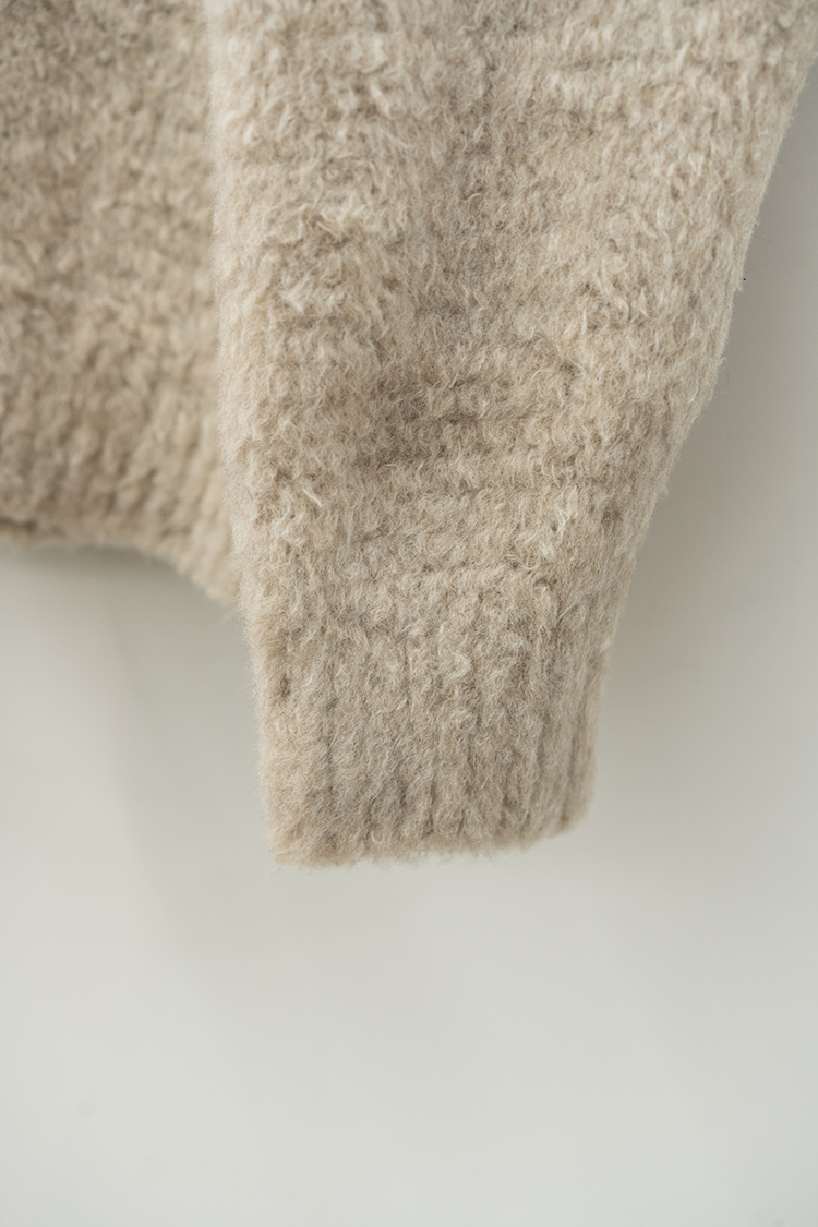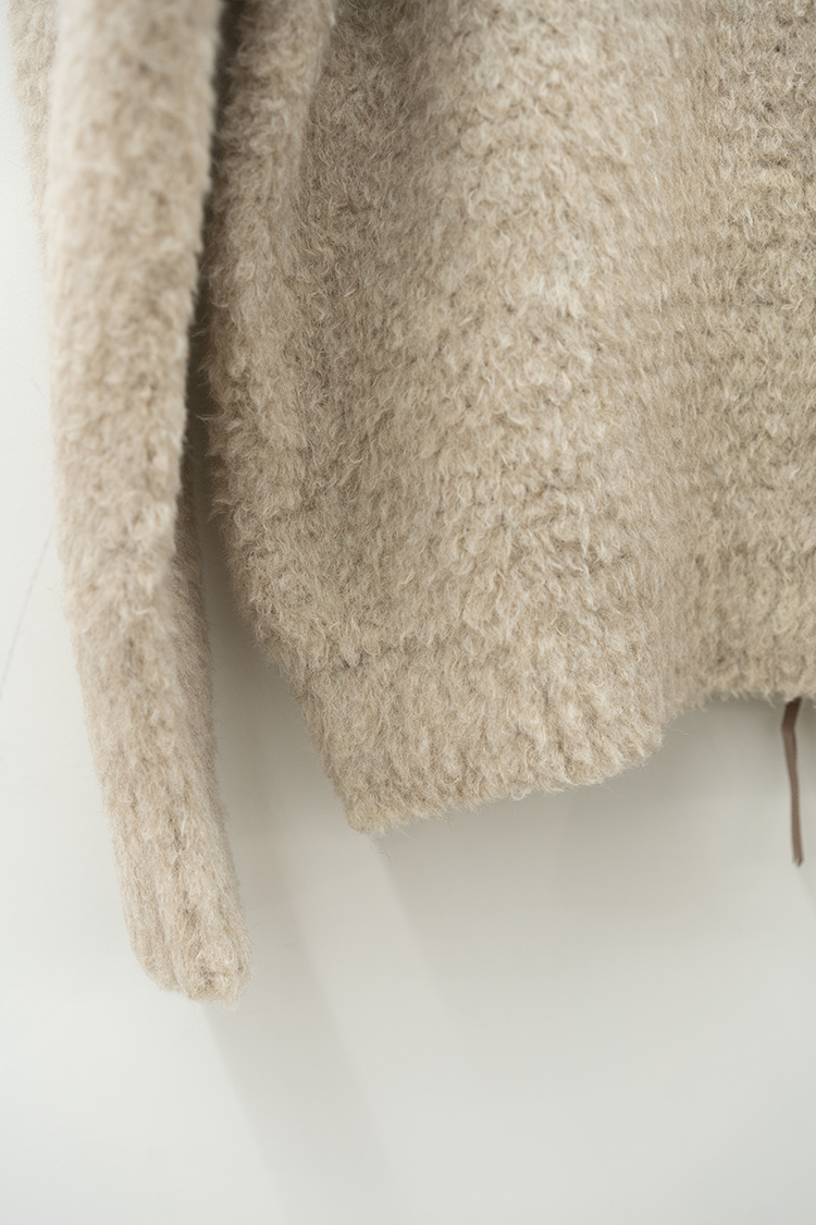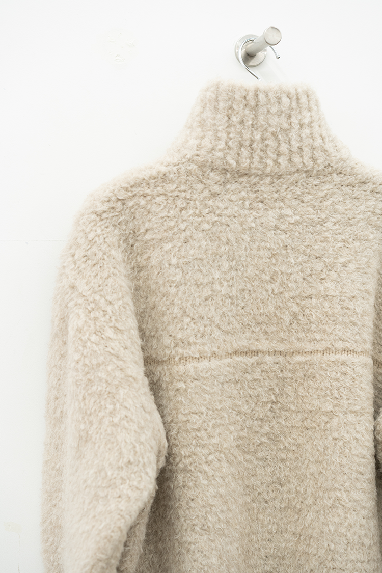毛質がもたらすカサ高性のあるシェットランドウールでボア用の糸を作り、ボアフリースをニットで表現したウールボアの商品。通常ポリエステルや化繊で作られるボアを天然のウール素材で製作しました。ローゲージで編み立てし、ボアの膨らみと軽さが特徴の迫力のある商品です。 素材 WOOL 85% POLYESTER 15% ※着用詳細 175cm / BEIGE / SIZE 3 サイズスペック 【3】着丈‐65.0cm 身幅‐58.0cm 肩幅-54.0cm 袖丈-62.0cm