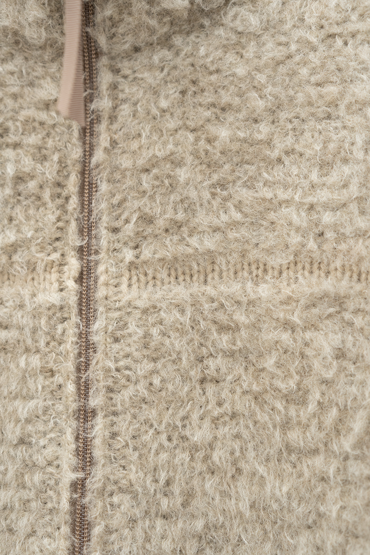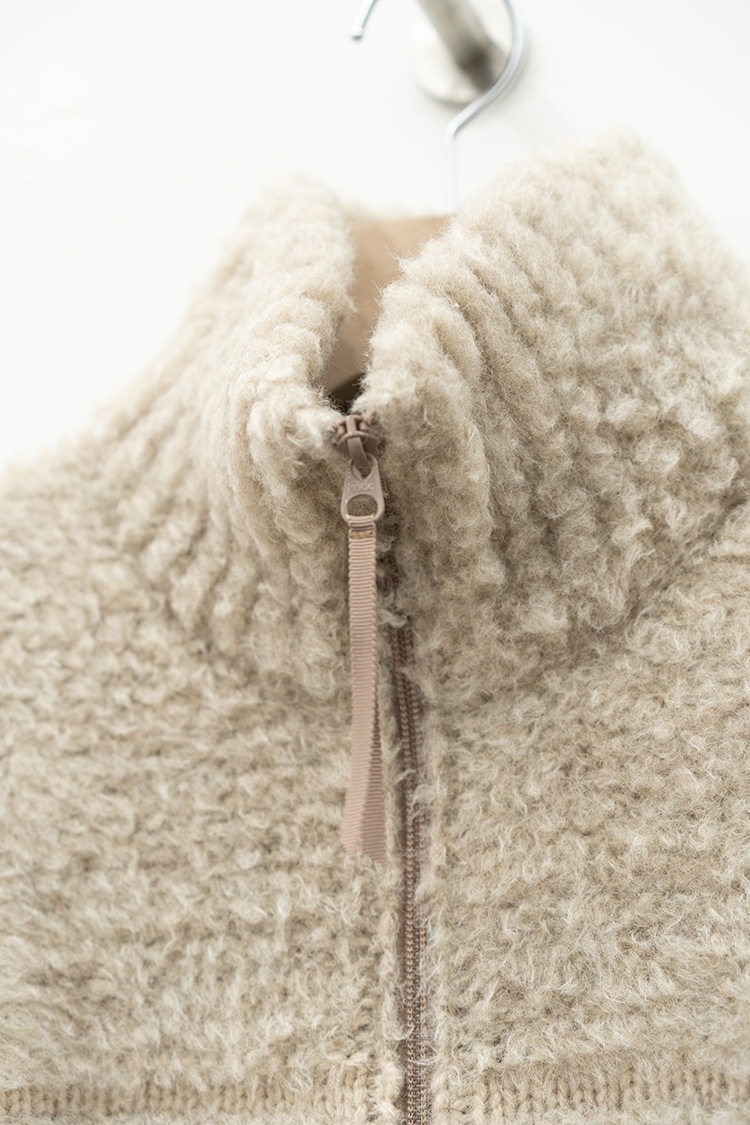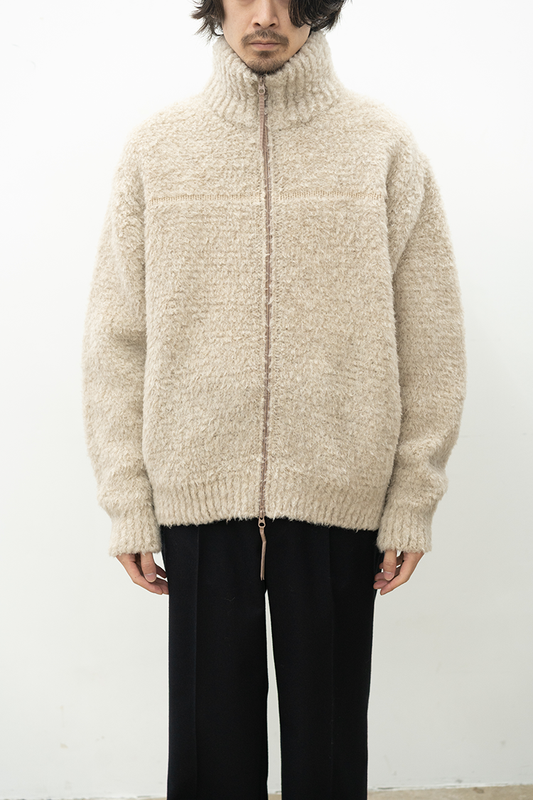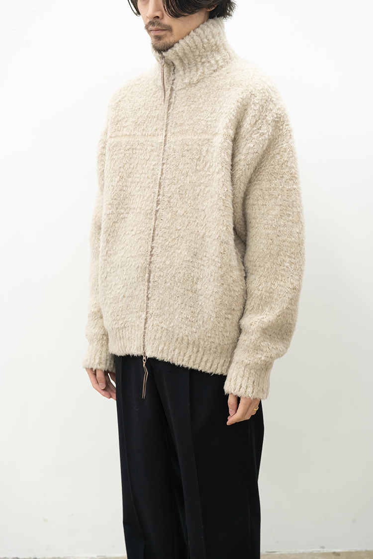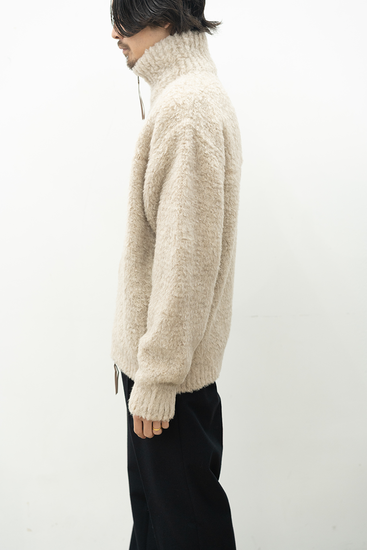 毛質がもたらすカサ高性のあるシェットランドウールでボア用の糸を作り、ボアフリースをニットで表現したウールボアの商品。通常ポリエステルや化繊で作られるボアを天然のウール素材で製作しました。ローゲージで編み立てし、ボアの膨らみと軽さが特徴の迫力のある商品です。 素材 WOOL 85% POLYESTER 15% ※着用詳細 175cm / BEIGE / SIZE 3 サイズスペック 【3】着丈‐65.0cm 身幅‐58.0cm 肩幅-54.0cm 袖丈-62.0cm