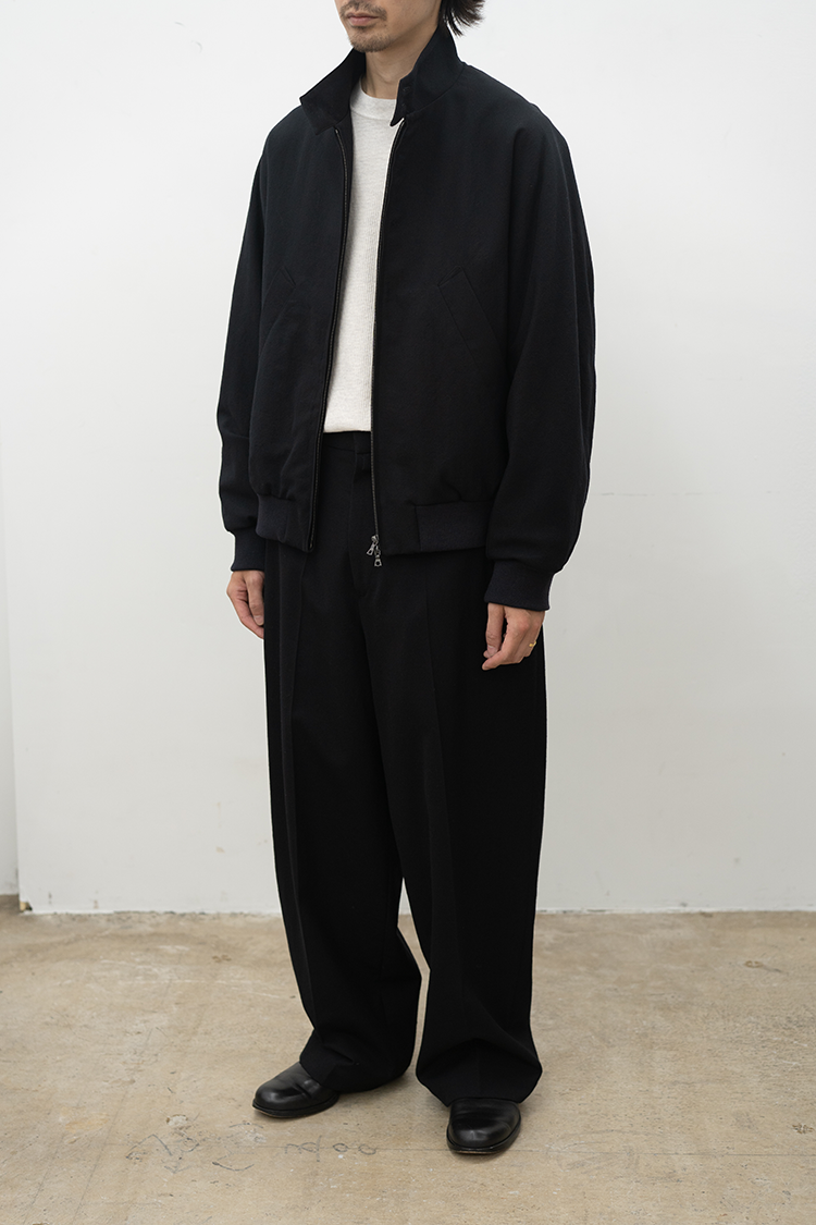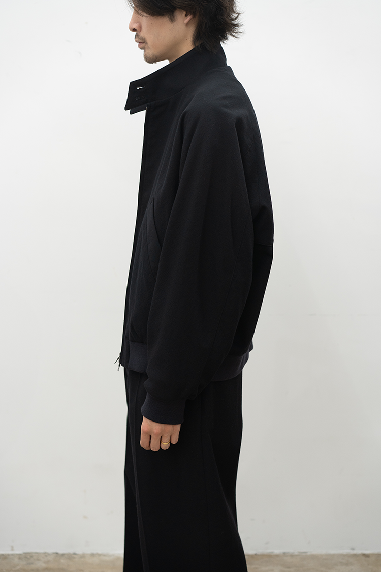 通常のハリントンよりも身幅を広くし、肩周りは前見頃はドルマンスリーブ、後見頃はラグランスリーブで設計することで不揃いな表面感と上品な落ち感を活かしつつ、着用者の腕周りの可動域を増やすことで着心地も軽やかな仕立てに。