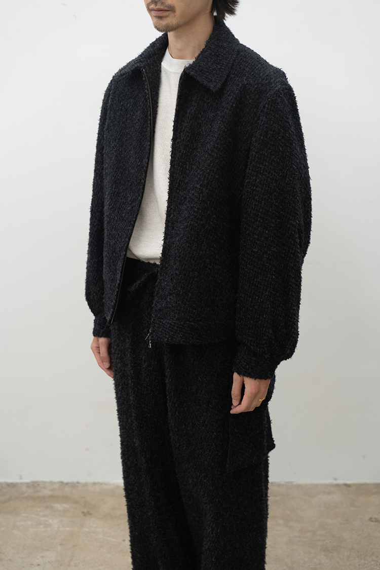 表面にウールを使用し、細かくカットしてその後に洗いをかけてウールを縮めることで不揃いな表面感を出した素材です。肌に当たる面はウールのチクチク感が出ないように仕上げています。