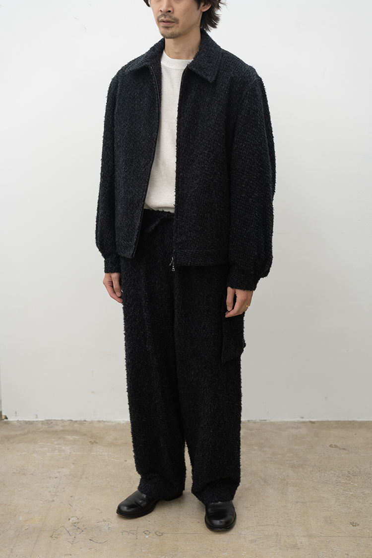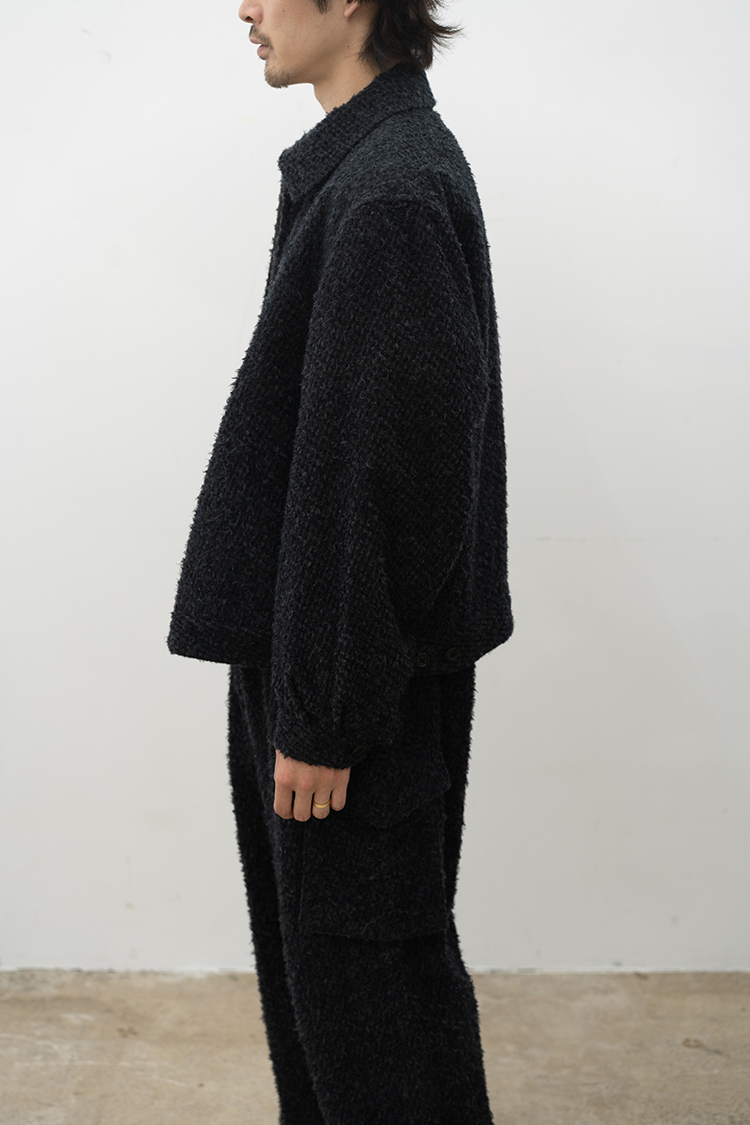表面にウールを使用し、細かくカットしてその後に洗いをかけてウールを縮めることで不揃いな表面感を出した素材です。肌に当たる面はウールのチクチク感が出ないように仕上げています。
