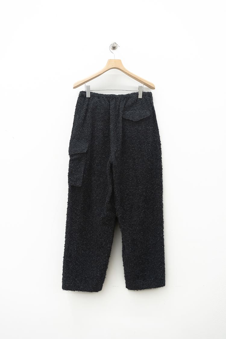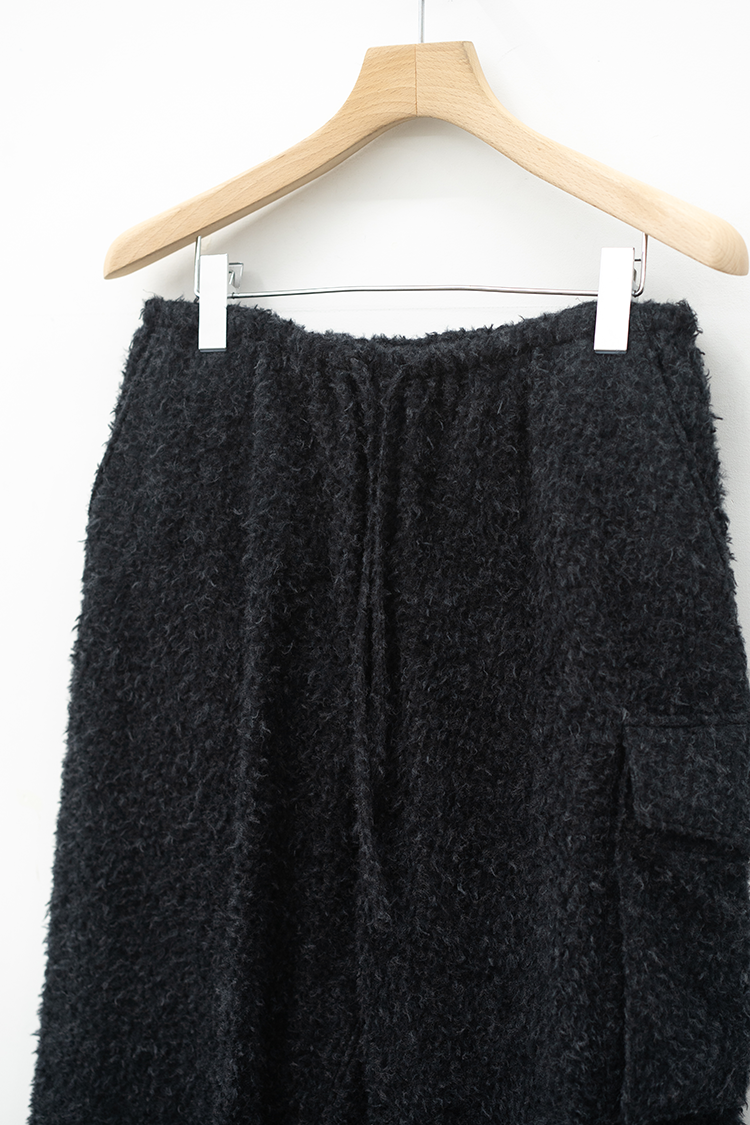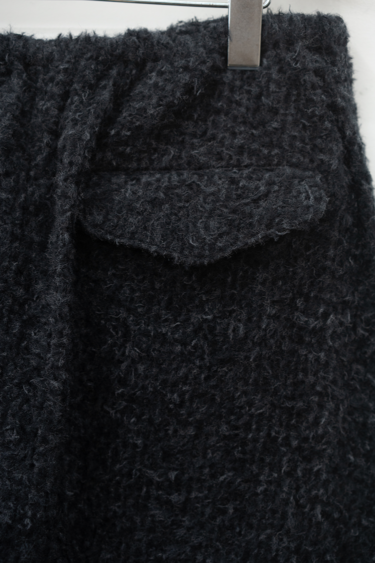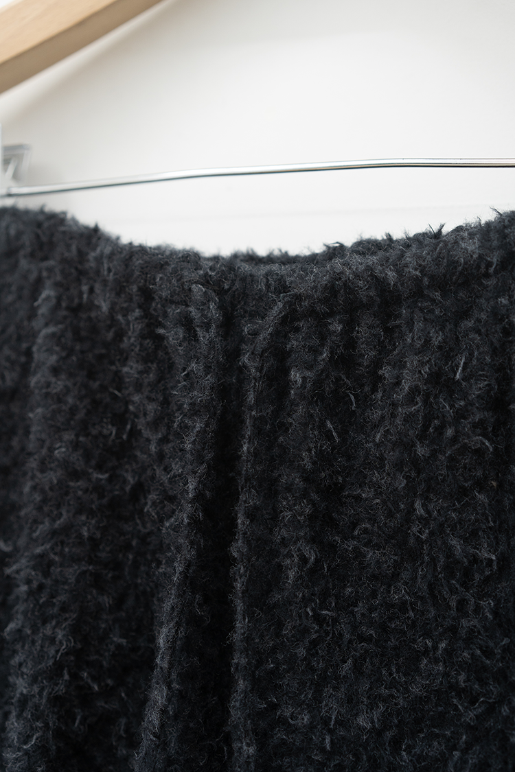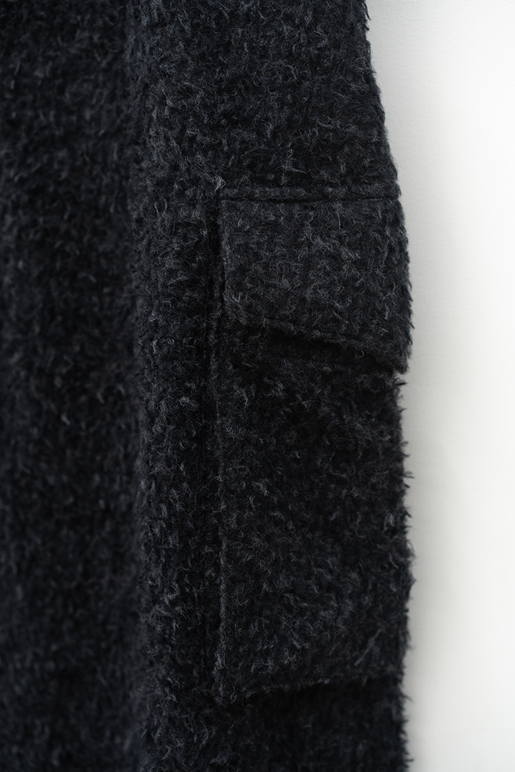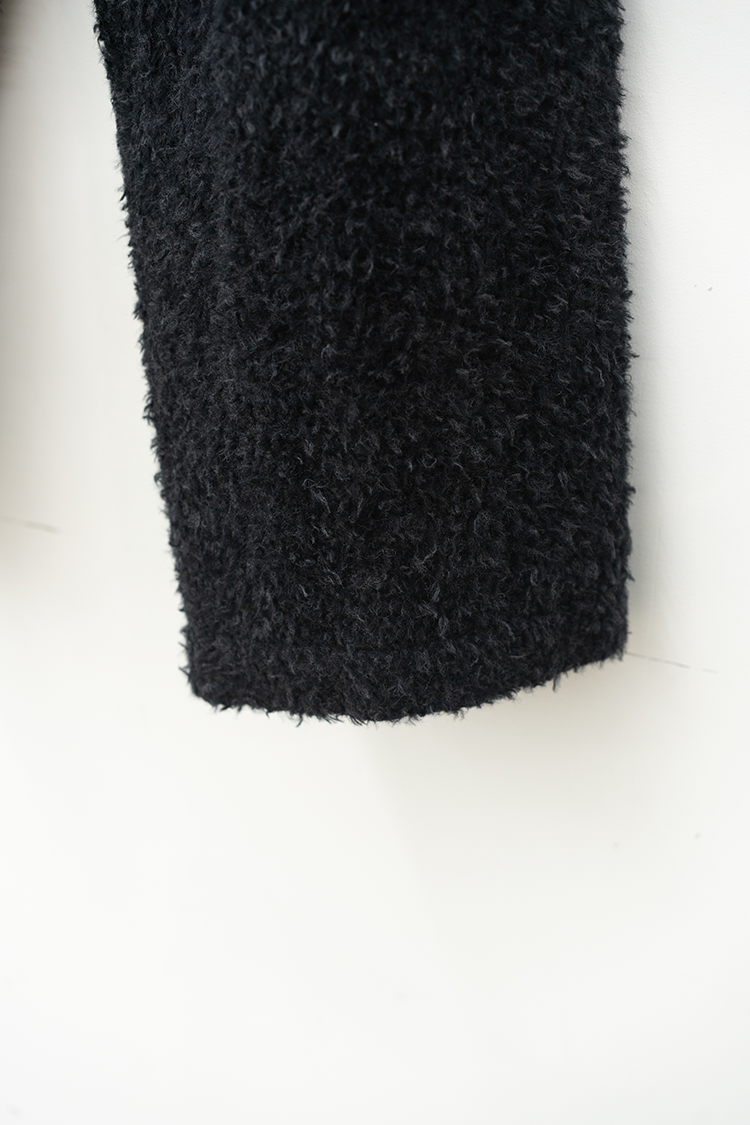 表面にウールを使用し、細かくカットしてその後に洗いをかけてウールを縮めることで不揃いな表面感を出した素材です。肌に当たる面はウールのチクチク感が出ないように仕上げています。