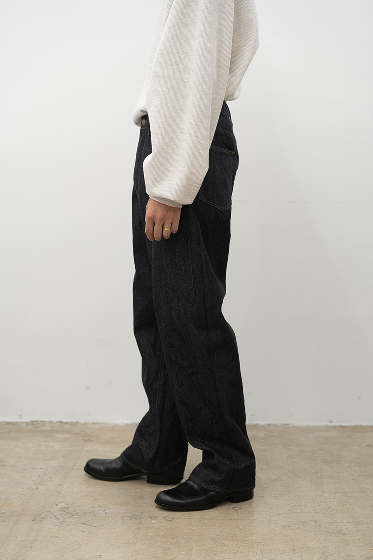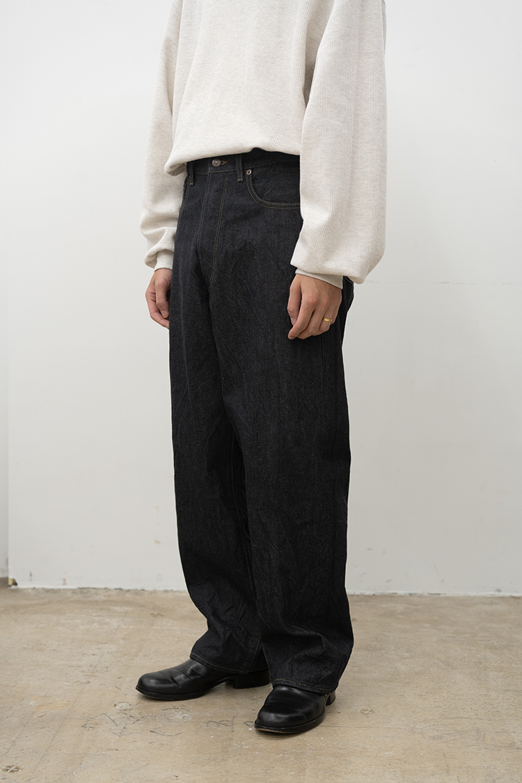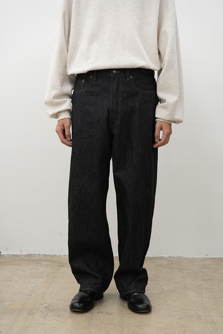 拘り抜かれた美しいシルエットが魅力のワイドストレートデニム 履き心地を考え、ワタリとヒップに少しだけ立体感とゆとりをもたせストレートに見えるシルエットでバランスを取って仕立てています。打ち込み本数と糸を選定し、自然なムラ感や毛羽立ち、綺麗で自然な色落ちがでるように設定。 徐々に柔らかく馴染むように少し硬めに仕上げています。 生地はやや厚みのある13.5ozを採用、幅広い季節で着用が可能です。 素材 COTTON 100% ※着用詳細 175cm / SULFUR BLACK / size 3 サイズスペック 【2】ウエスト‐76.0cm 股上‐28.0cm 股下-72.0cm 裾幅-23.0cm 【3】ウエスト‐82.0cm 股上‐29.0cm 股下-73.0cm 裾幅-23.5cm