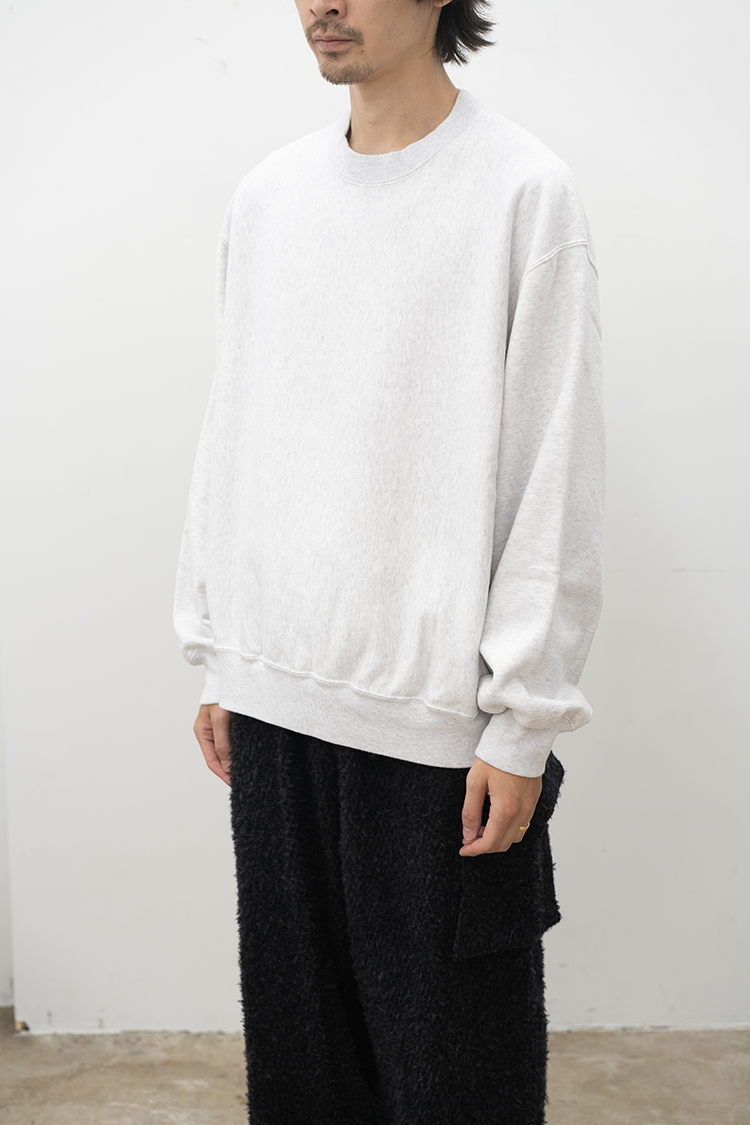 裏のループに無撚糸を使用して肌触りをソフトに、表面は毛羽を抑え光沢が出るようにしっかりと限界まで度詰めをして、ハードな風合いで仕げたクルーネックスウェット。