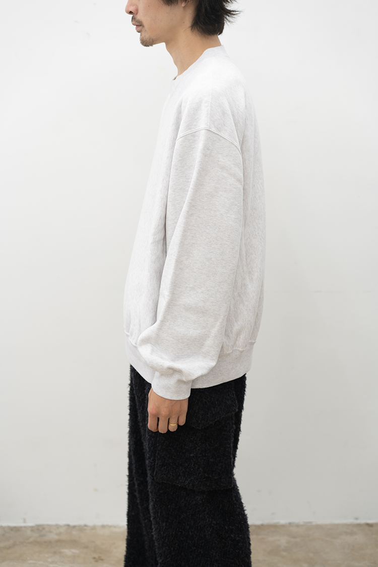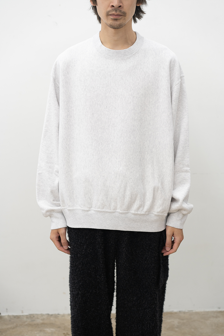 裏のループに無撚糸を使用して肌触りをソフトに、表面は毛羽を抑え光沢が出るようにしっかりと限界まで度詰めをして、ハードな風合いで仕げたクルーネックスウェット。
