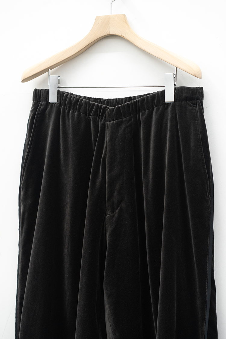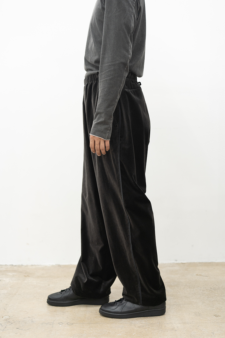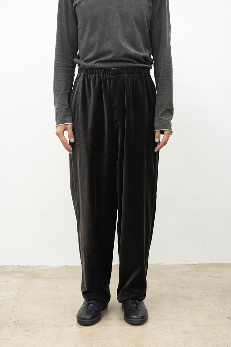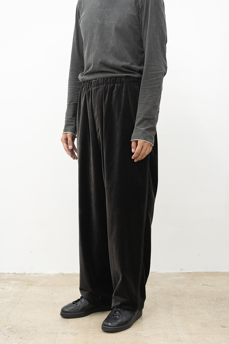 2025年秋冬シーズンの新作、コットンベルベット素材の上品な光沢が醸し出す、洗練された印象を与えるイージーパンツ。