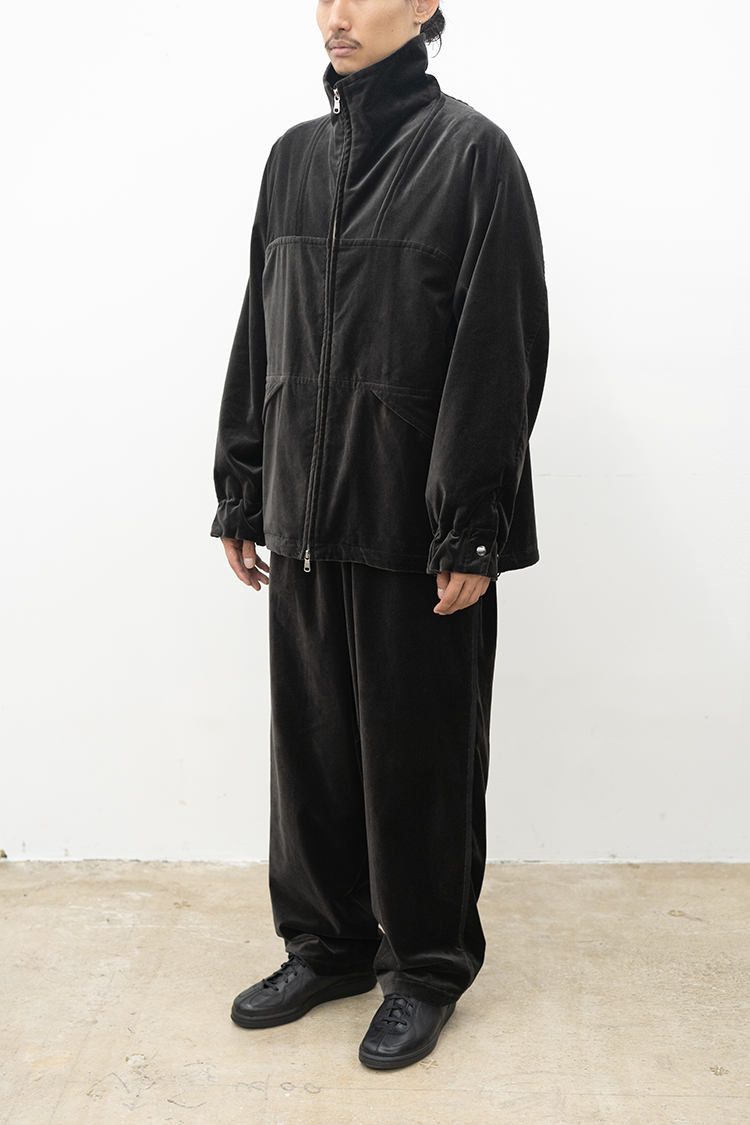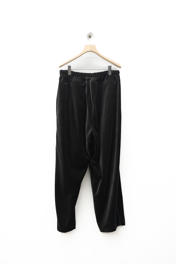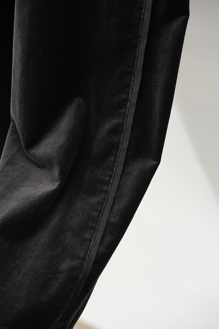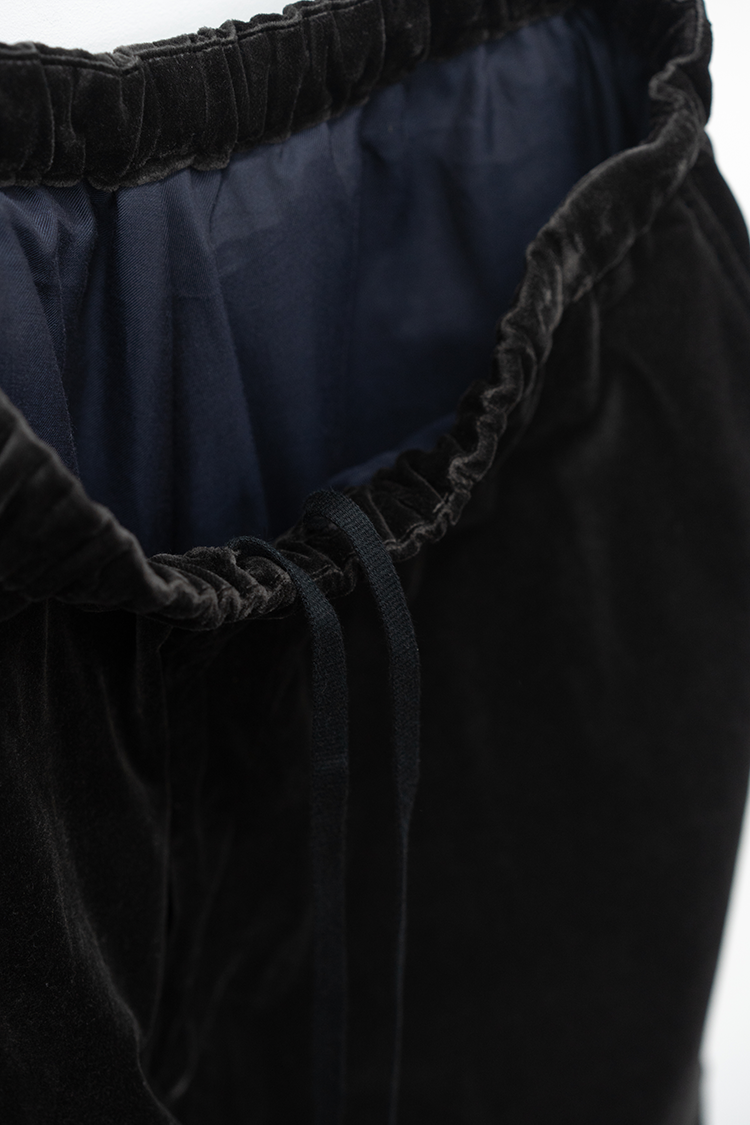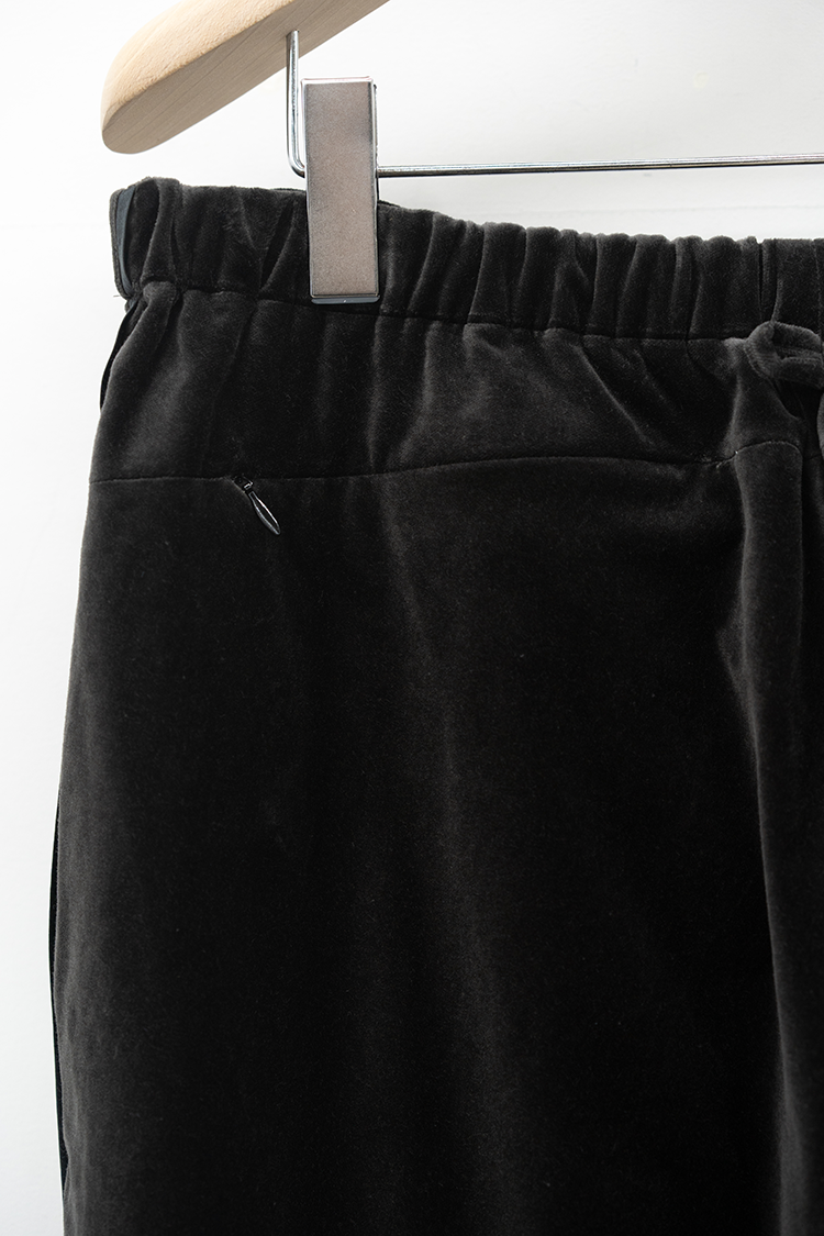 2025年秋冬シーズンの新作、コットンベルベット素材の上品な光沢が醸し出す、洗練された印象を与えるイージーパンツ。