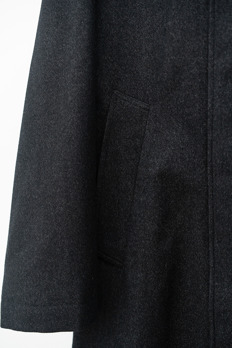 柔らかく温かみのあるバージンウールをベースに、コシを出すために少量のコットンを混紡した綾織りのツイル生地で作られています。生地の風合いを引き立てるため、経糸と緯糸は異なる色で織り上げられています。