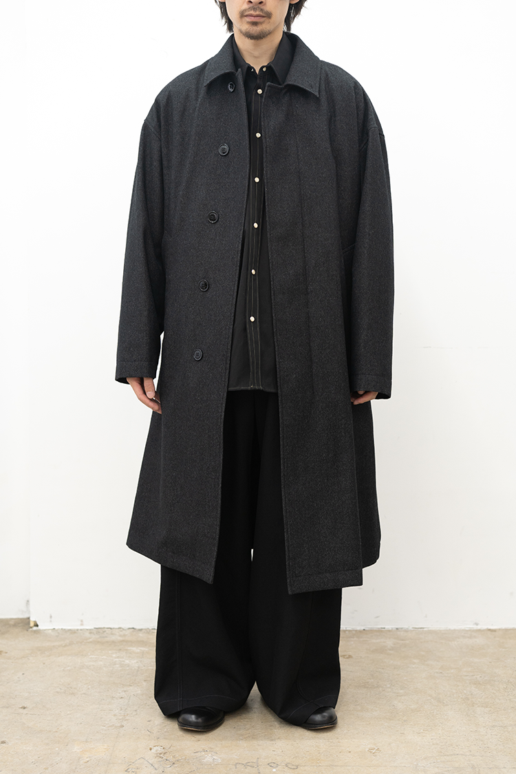 伝統的なテーラード構造を持つ、クラシックなオーバーサイズカットのシングルブレストコート。