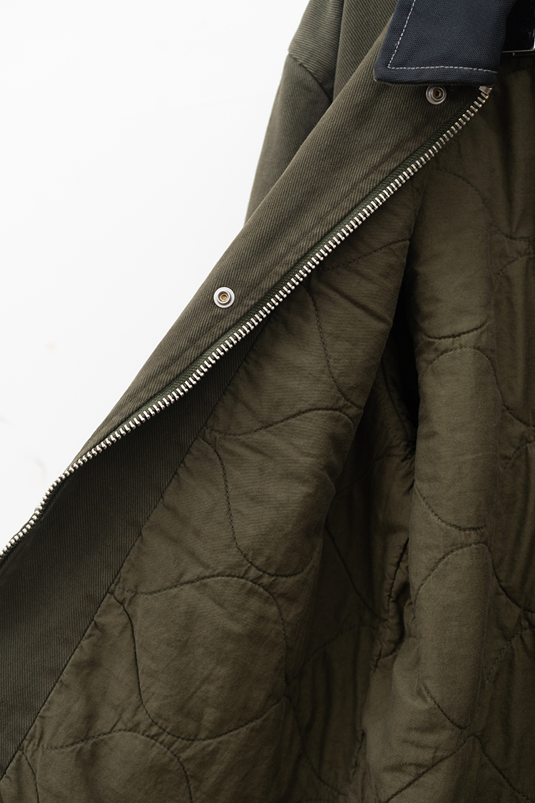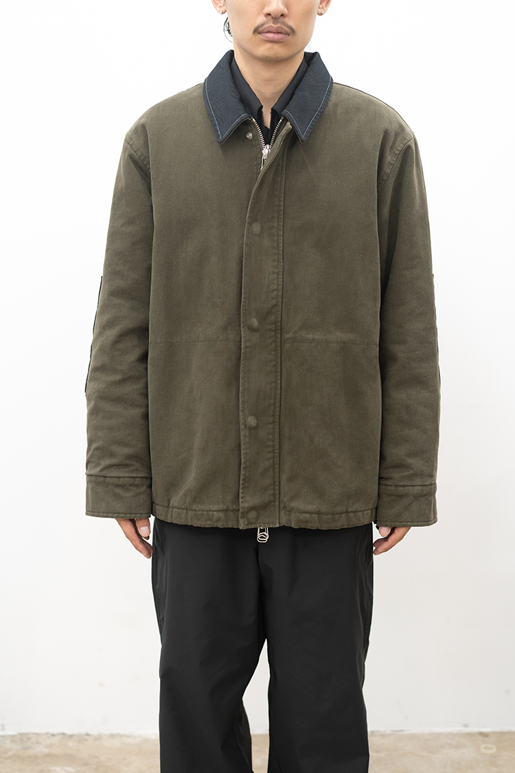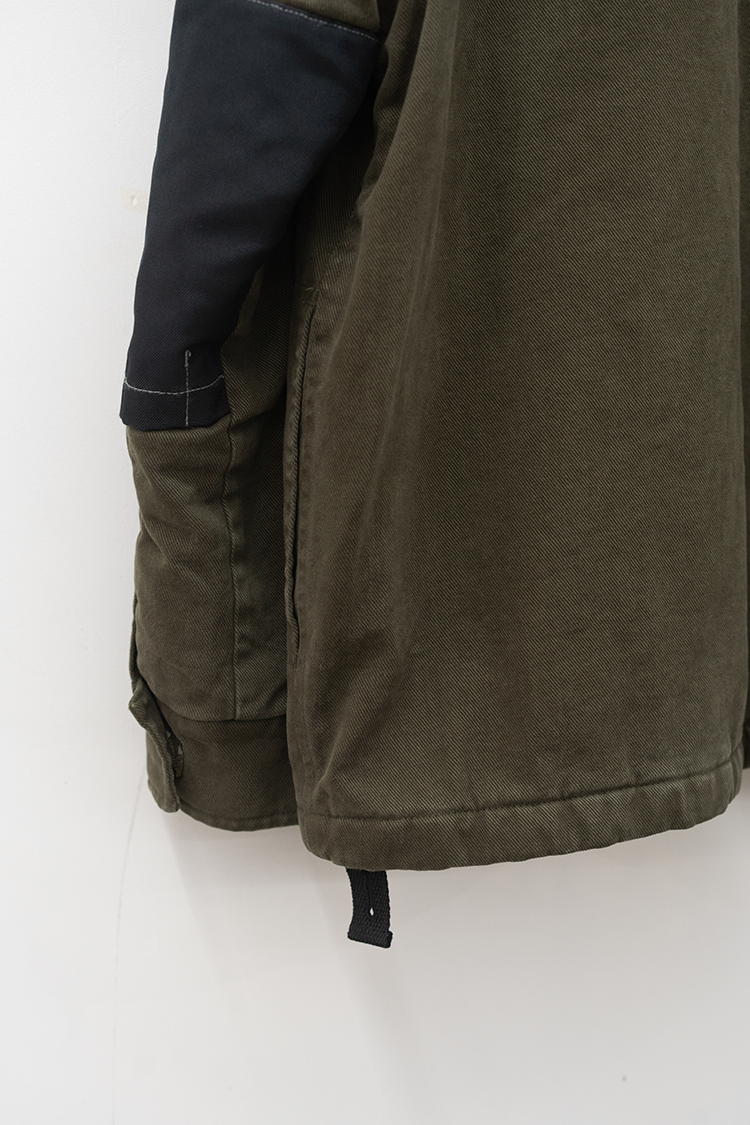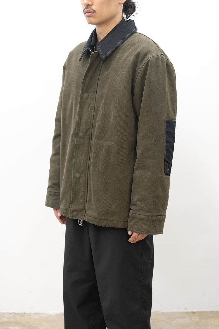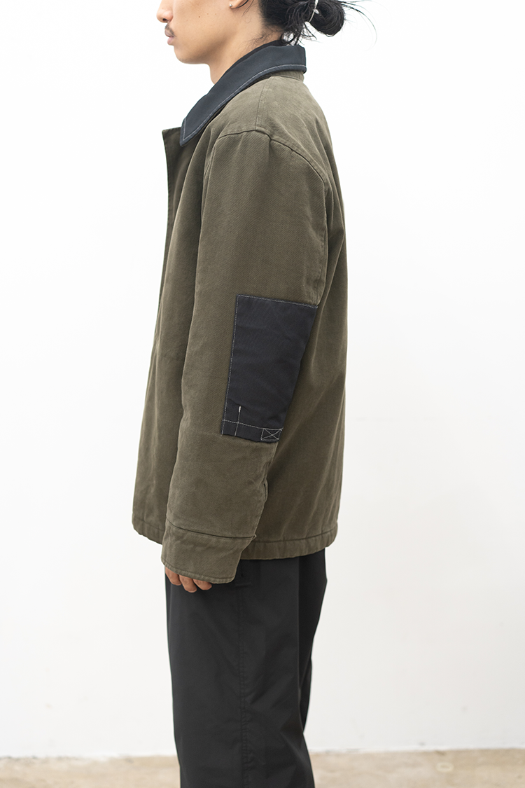 切り替え配色のチョアジャケット。 タフな素材ながらシルエットが美しく出るよう 製品加工が施され馴染ませております。 内側にはキルティングが配され保温性も確保できる仕様に。 襟、肘部分には切り替えデザイン。 素材 COTTON 100% 着用詳細 173cm / MILITARY GREEN / size S サイズ 【S】着丈-71.0cm 身幅-63.0cm 肩幅-51.0cm 袖丈-62.0cm 【M】着丈-75.0cm 身幅-65.0cm 肩幅-53.0cm 袖丈-64.0cm