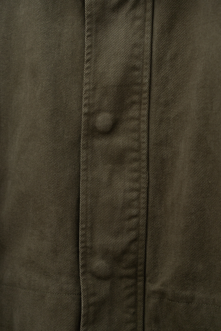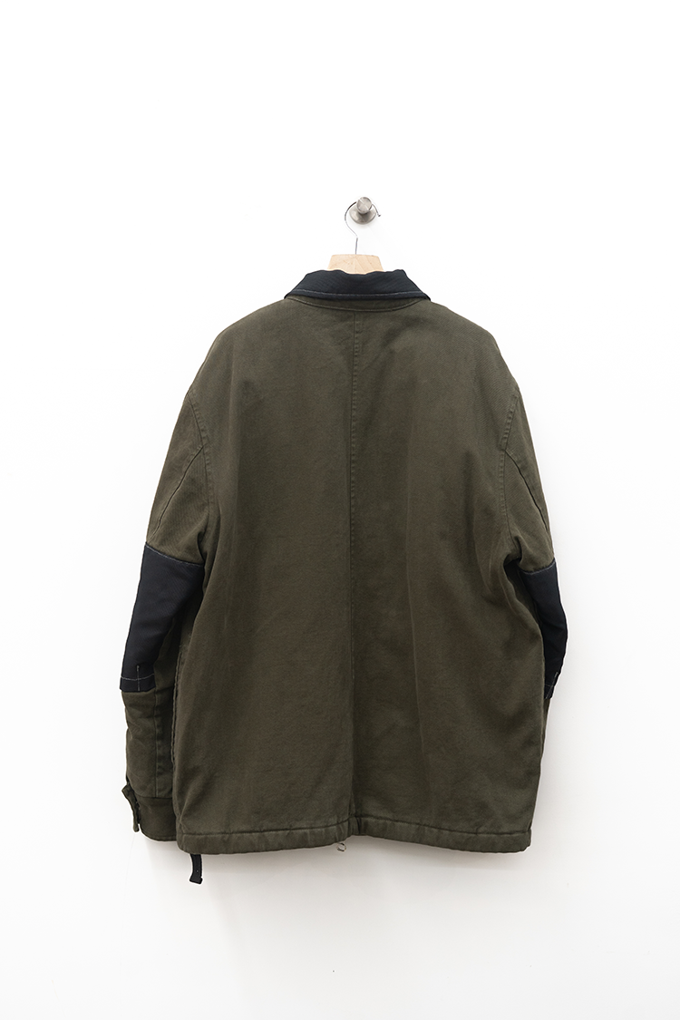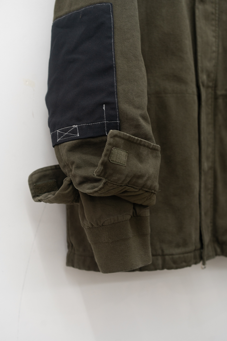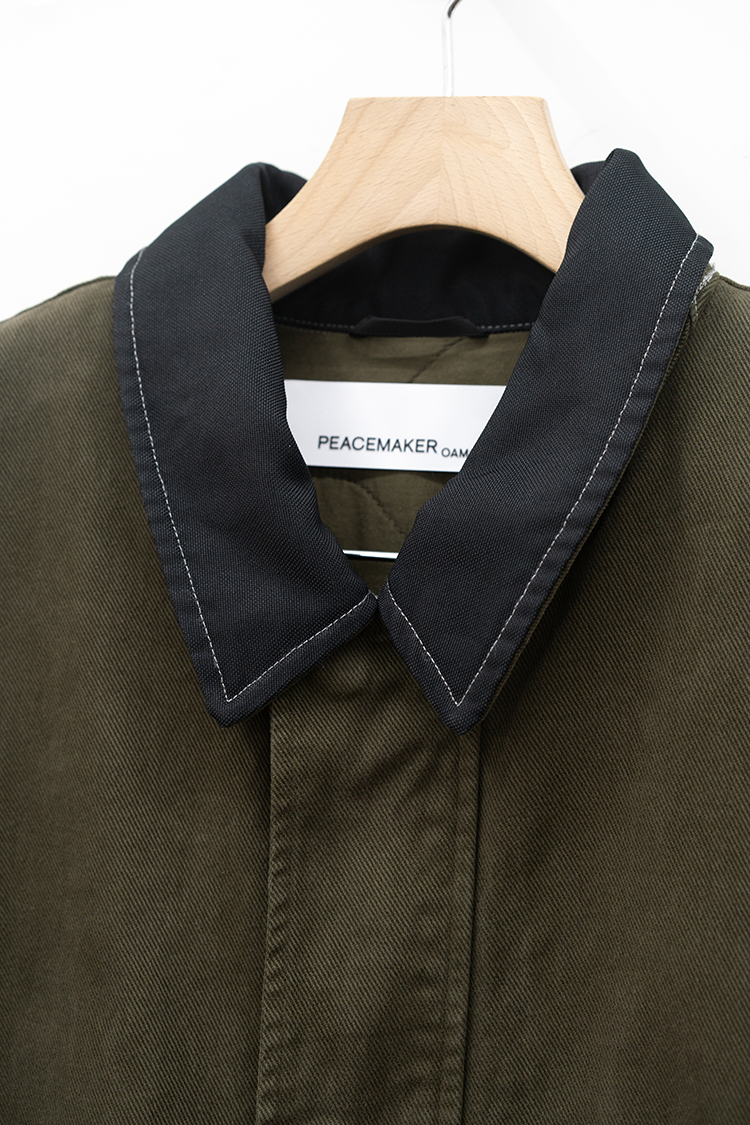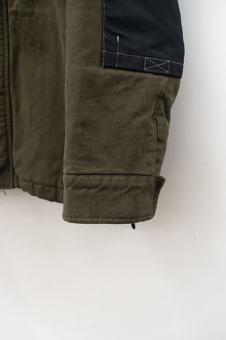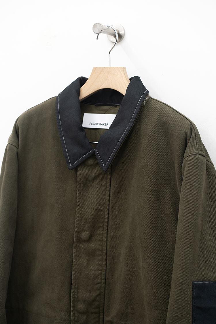 切り替え配色のチョアジャケット。 タフな素材ながらシルエットが美しく出るよう 製品加工が施され馴染ませております。 内側にはキルティングが配され保温性も確保できる仕様に。 襟、肘部分には切り替えデザイン。 素材 COTTON 100% 着用詳細 173cm / MILITARY GREEN / size S サイズ 【S】着丈-71.0cm 身幅-63.0cm 肩幅-51.0cm 袖丈-62.0cm 【M】着丈-75.0cm 身幅-65.0cm 肩幅-53.0cm 袖丈-64.0cm