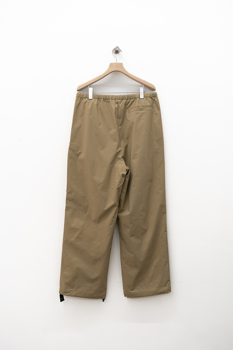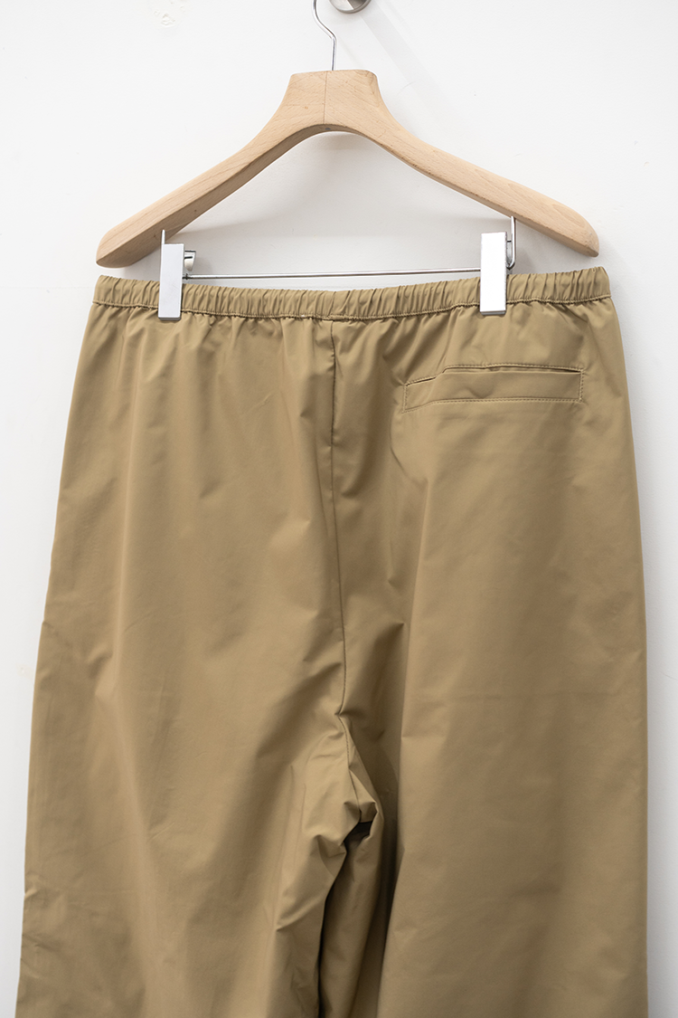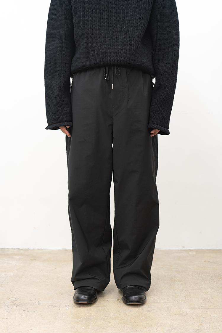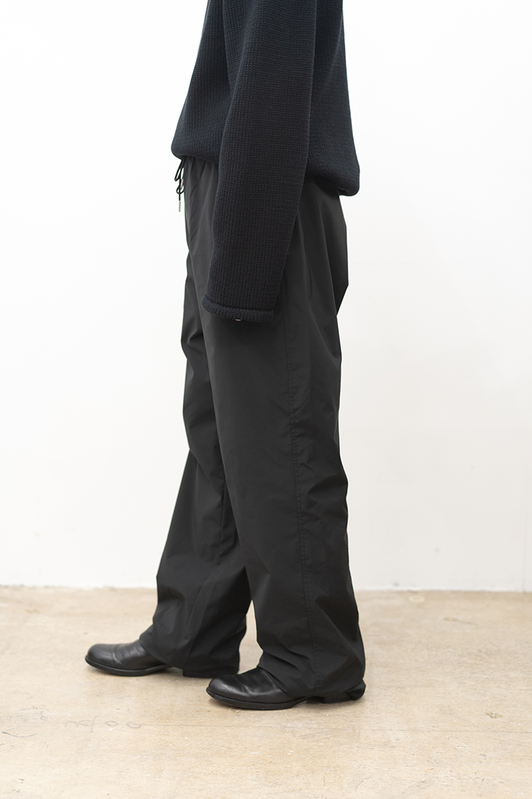 ワイドストレートシルエットのイージーパンツ。 撥水機能を持つ素材ながら、スラックスのような面持ちでクリーンに仕上がっています。 裾部分にはドローコードが配され、カジュアルなニュアンスを作り出すことも可能です。 素材 POLYESTER 100% 着用詳細 173cm / BLACK / size S サイズスペック 【M】ウエスト-~86.0~cm 股上-36.0cm 股下-75.0cm 裾幅-~25.5cm