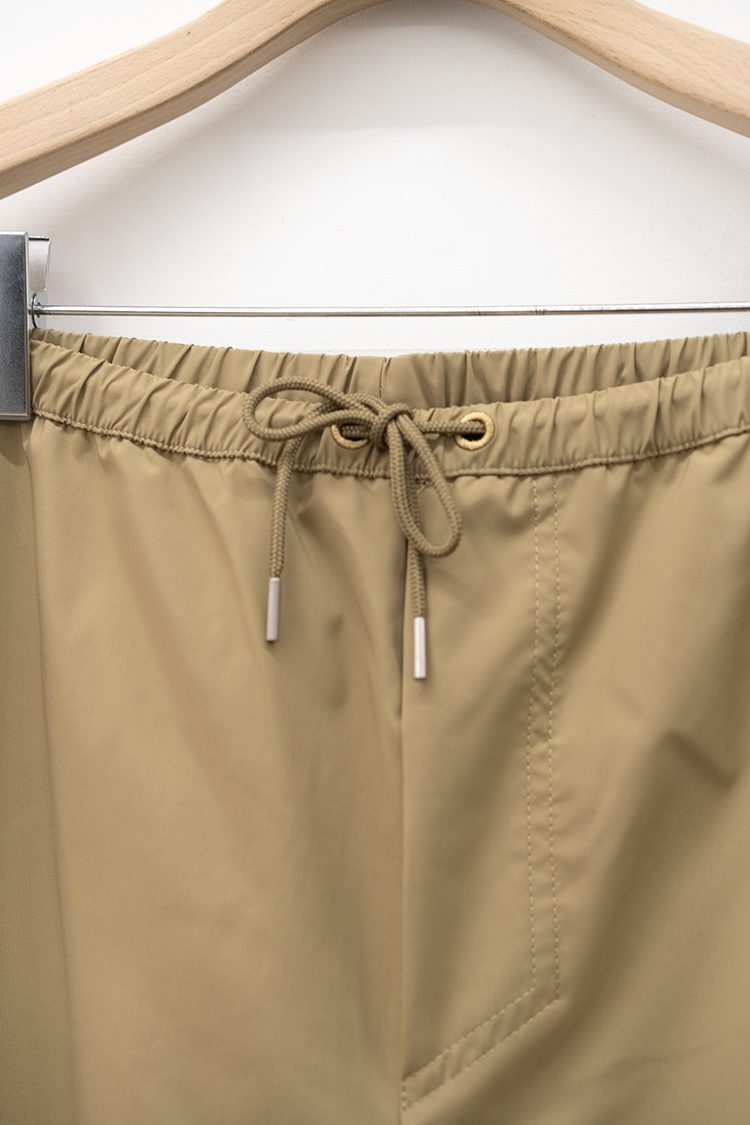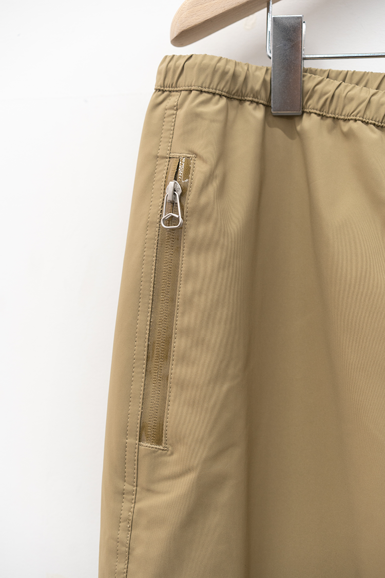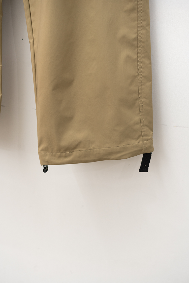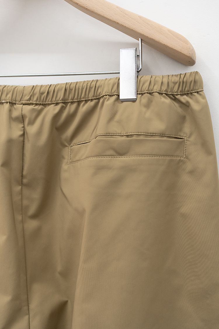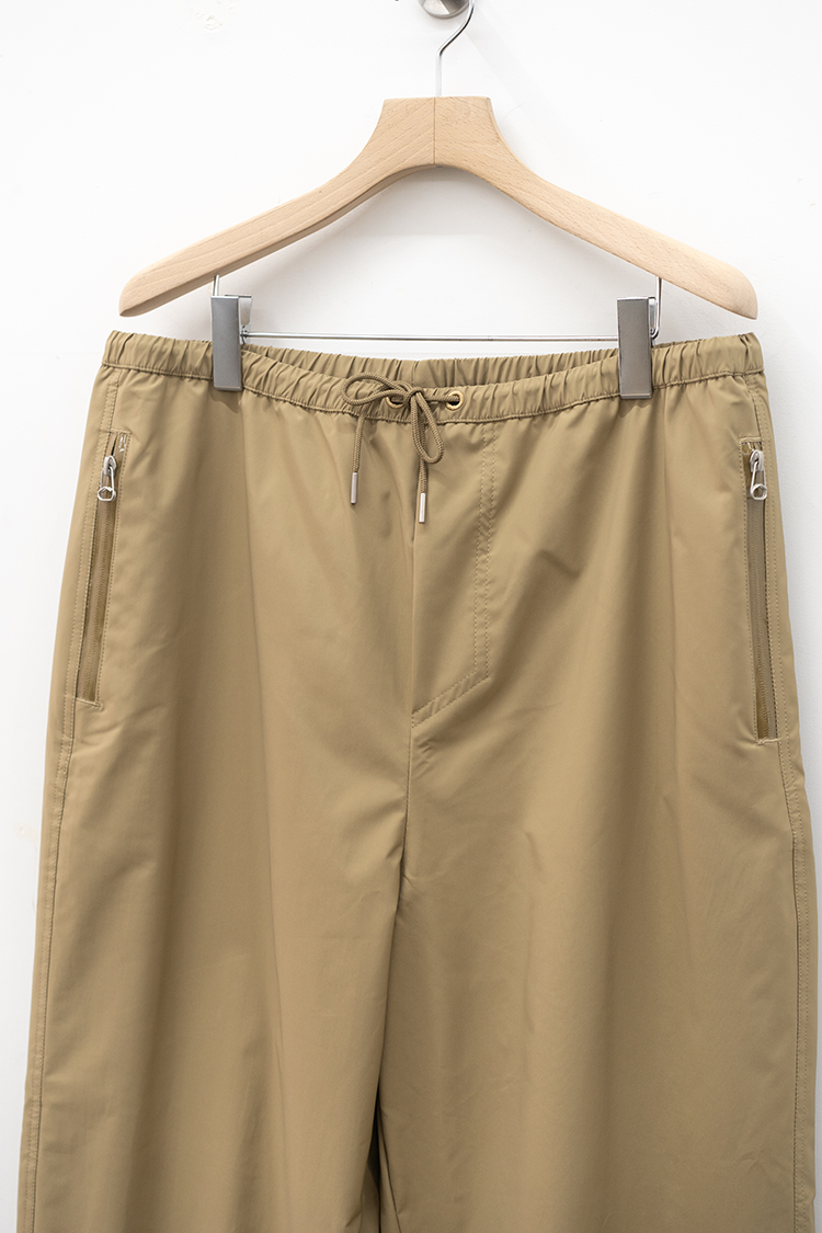ワイドストレートシルエットのイージーパンツ。 撥水機能を持つ素材ながら、スラックスのような面持ちでクリーンに仕上がっています。 裾部分にはドローコードが配され、カジュアルなニュアンスを作り出すことも可能です。 素材 POLYESTER 100% 着用詳細 173cm / BLACK / size S サイズスペック 【M】ウエスト-~86.0~cm 股上-36.0cm 股下-75.0cm 裾幅-~25.5cm