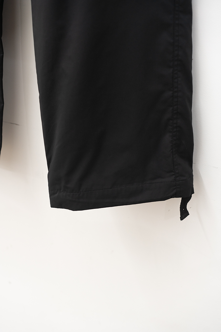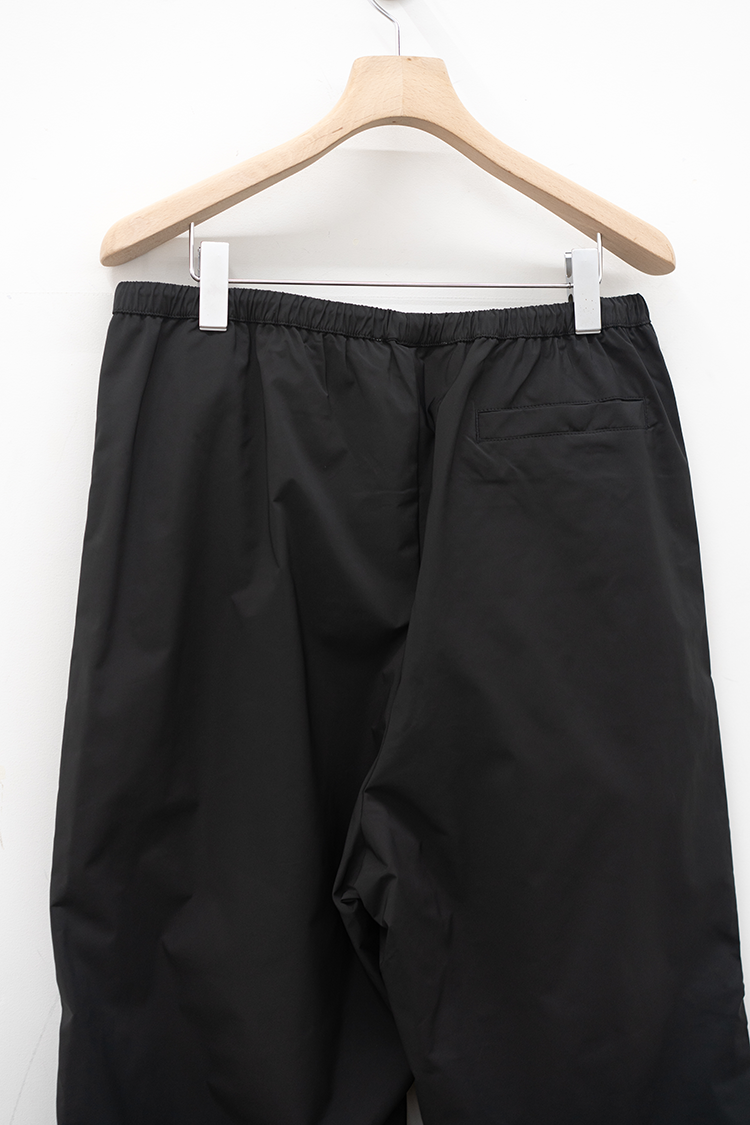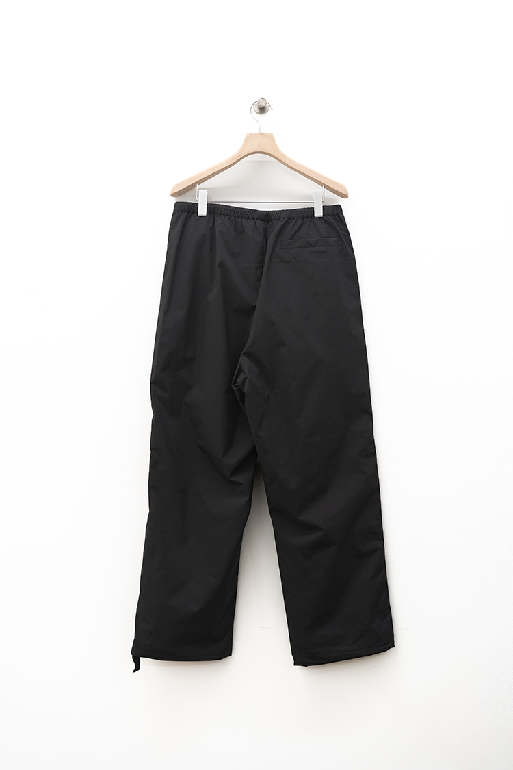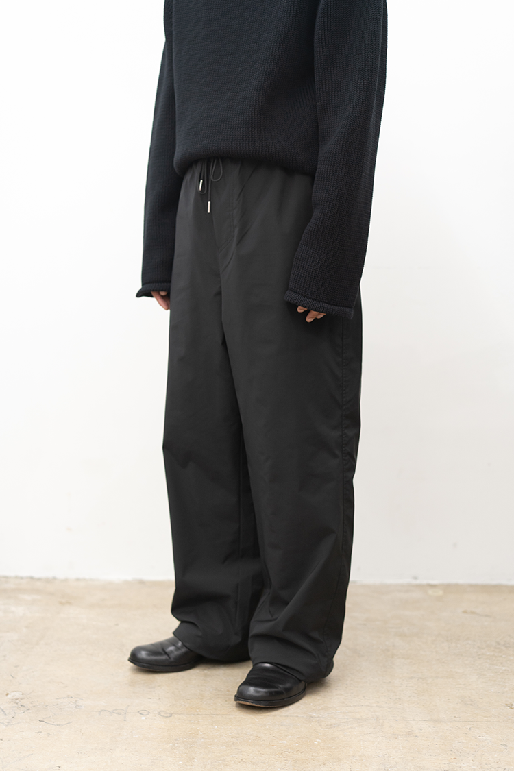 ワイドストレートシルエットのイージーパンツ。 撥水機能を持つ素材ながら、スラックスのような面持ちでクリーンに仕上がっています。 裾部分にはドローコードが配され、カジュアルなニュアンスを作り出すことも可能です。 素材 POLYESTER 100% 着用詳細 173cm / BLACK / size S サイズスペック 【XS】ウエスト-~80.0~cm 股上-33.0cm 股下-74.0cm 裾幅-~24.5cm 【S】ウエスト-~84.0~cm 股上-34.0cm 股下-74.0cm 裾幅-~25.0cm 【M】ウエスト-~86.0~cm 股上-36.0cm 股下-75.0cm 裾幅-~25.5cm