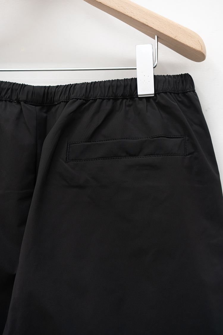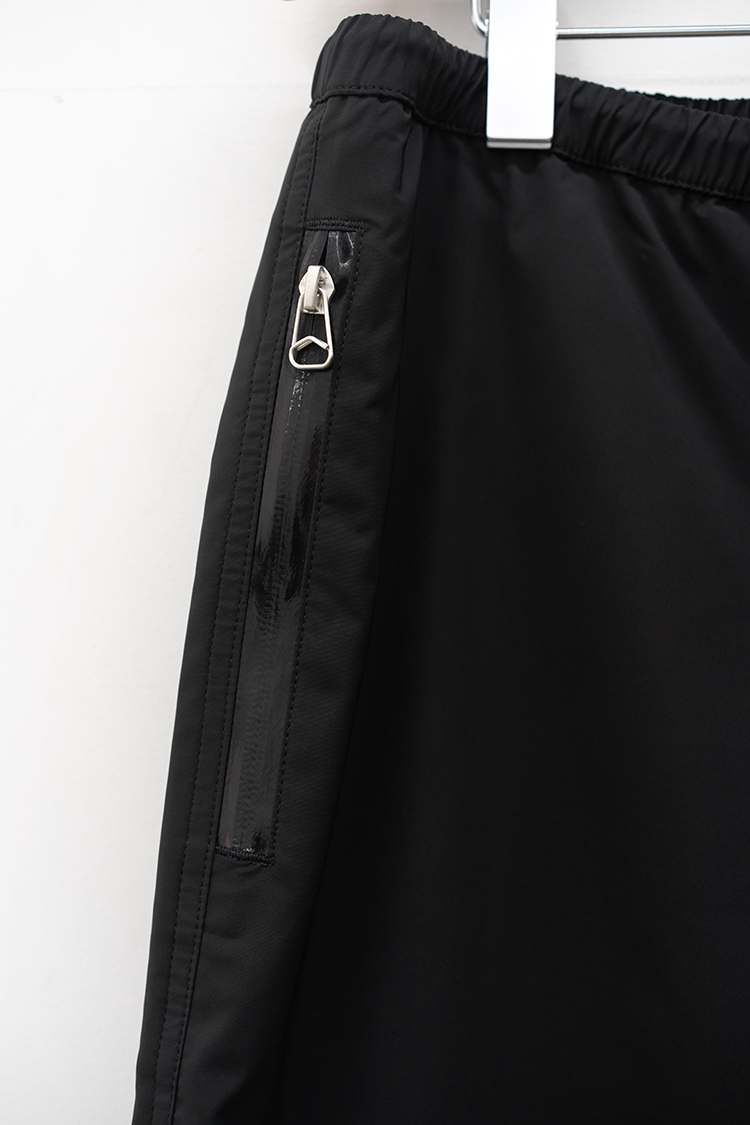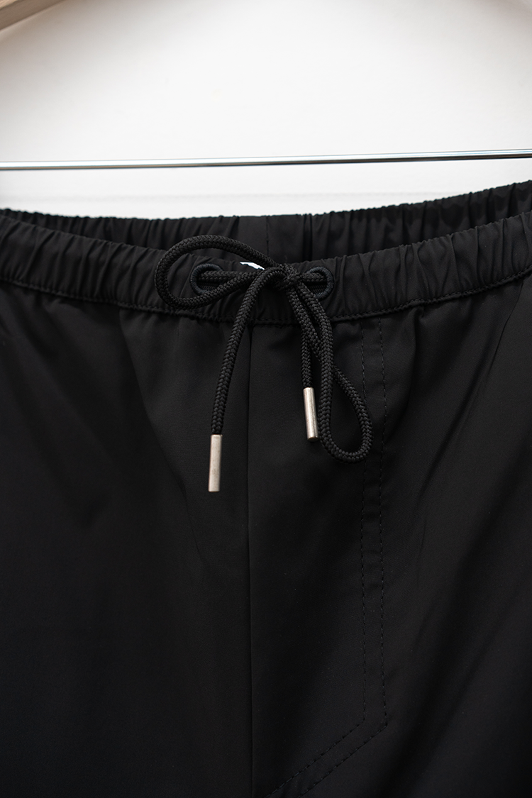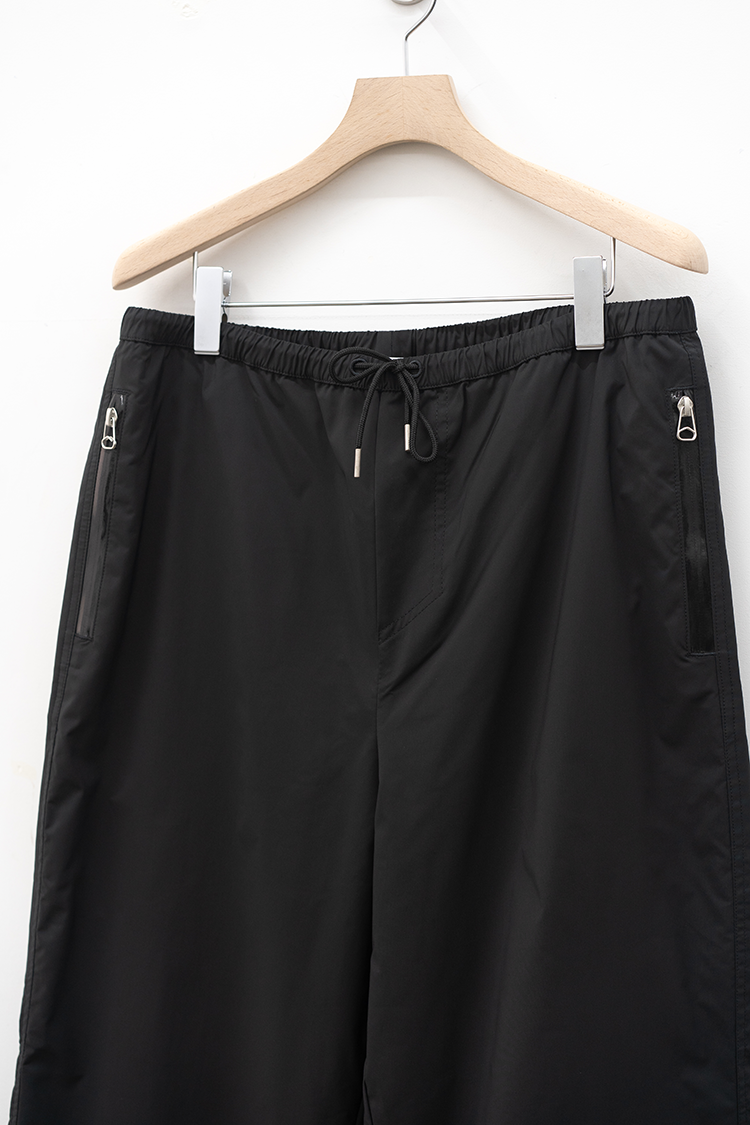 ワイドストレートシルエットのイージーパンツ。 撥水機能を持つ素材ながら、スラックスのような面持ちでクリーンに仕上がっています。 裾部分にはドローコードが配され、カジュアルなニュアンスを作り出すことも可能です。 素材 POLYESTER 100% 着用詳細 173cm / BLACK / size S サイズスペック 【XS】ウエスト-~80.0~cm 股上-33.0cm 股下-74.0cm 裾幅-~24.5cm 【S】ウエスト-~84.0~cm 股上-34.0cm 股下-74.0cm 裾幅-~25.0cm 【M】ウエスト-~86.0~cm 股上-36.0cm 股下-75.0cm 裾幅-~25.5cm