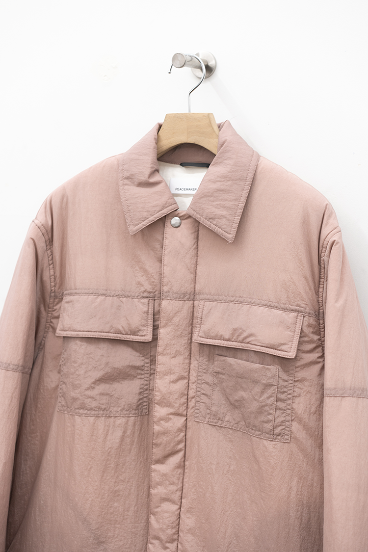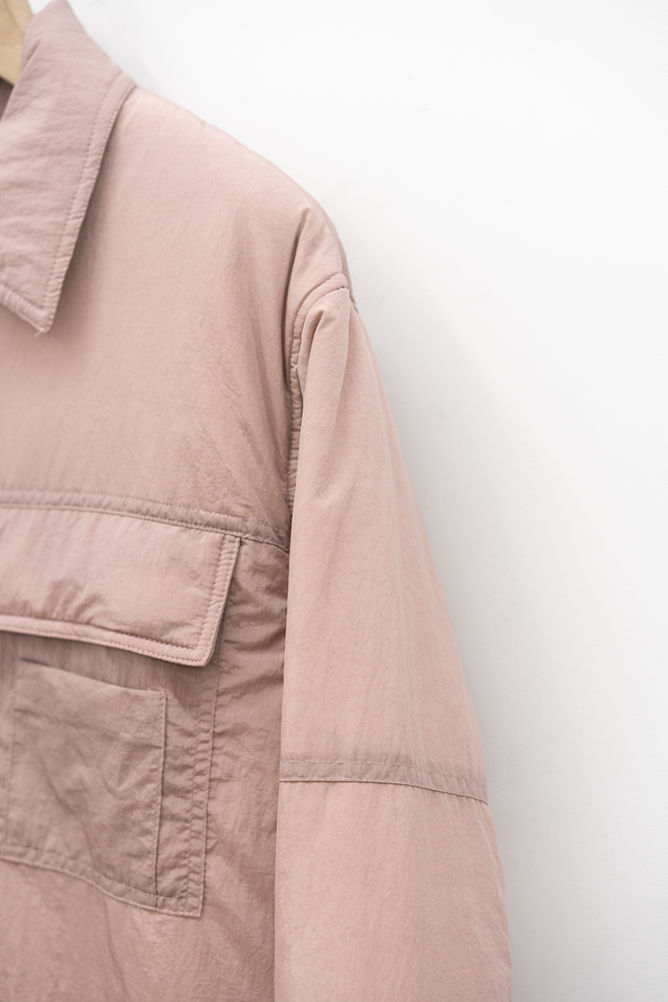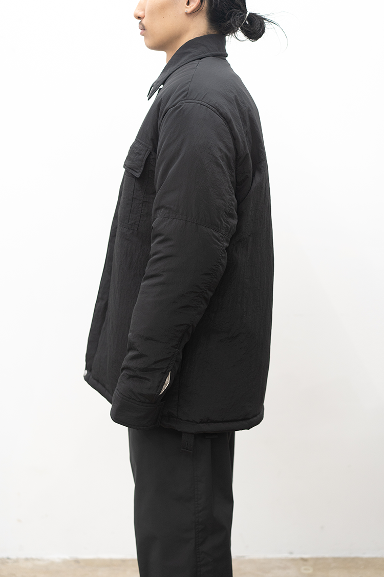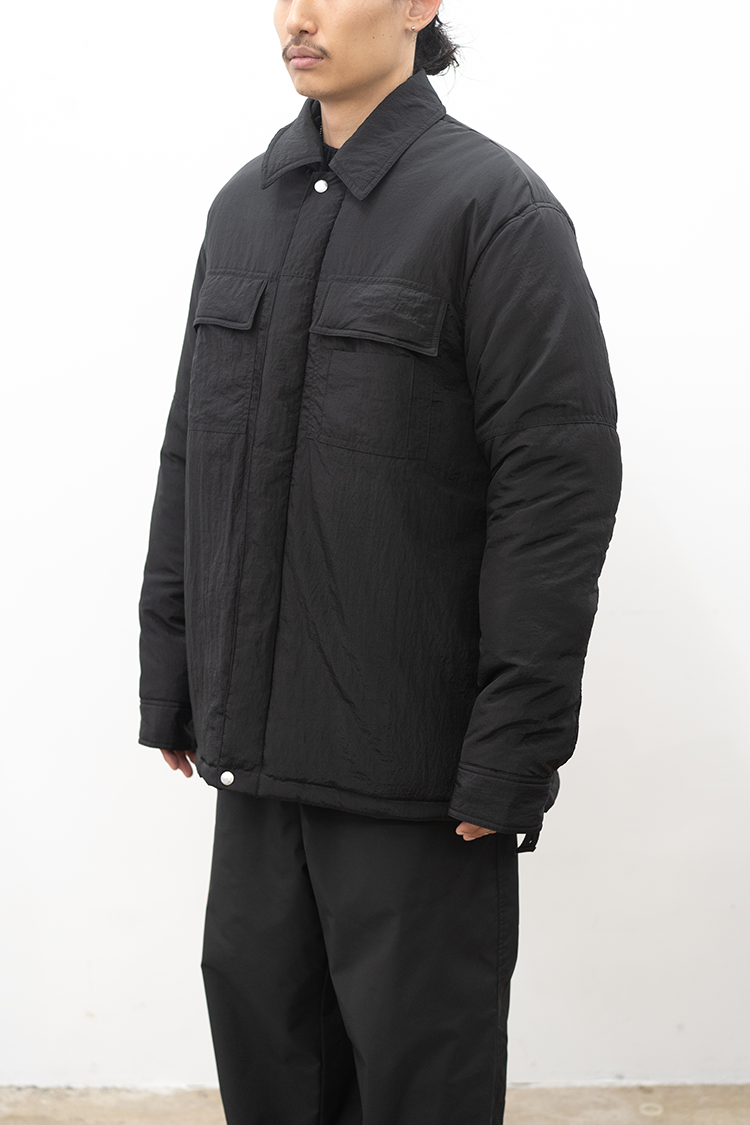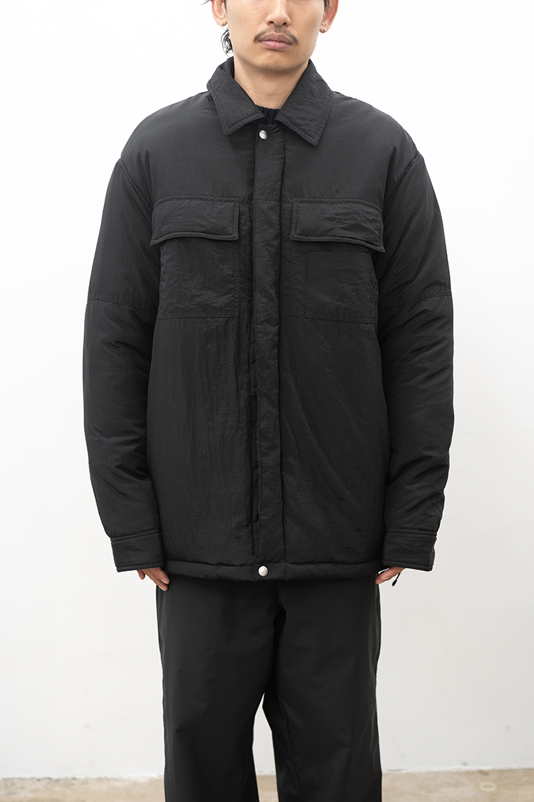 OAMCで人気を博したZIP UP SHIRTの ポリアミド素材の中綿入りモデル。 両胸にユーティリティポケットを配し、 アウター感覚で着用頂ける上 軽量で機動力に富んだ一枚。 素材の特性上、褪色、劣化が少なく 汎用性の高いプロダクト。 素材 POLYAMIDE 100% 着用詳細 173cm / BLACK / size M サイズ 【S】着丈-80.0cm 身幅-61.0cm 肩幅-51.0cm 袖丈-65.0cm 【M】着丈-82.0cm 身幅-65.0cm 肩幅-54.0cm 袖丈-66.0cm