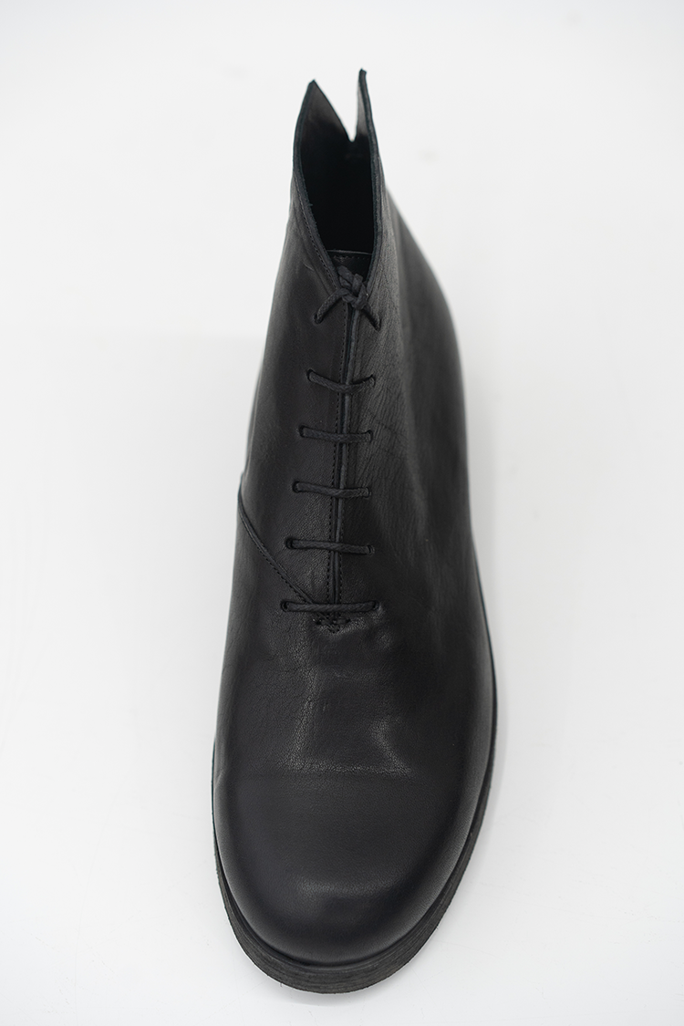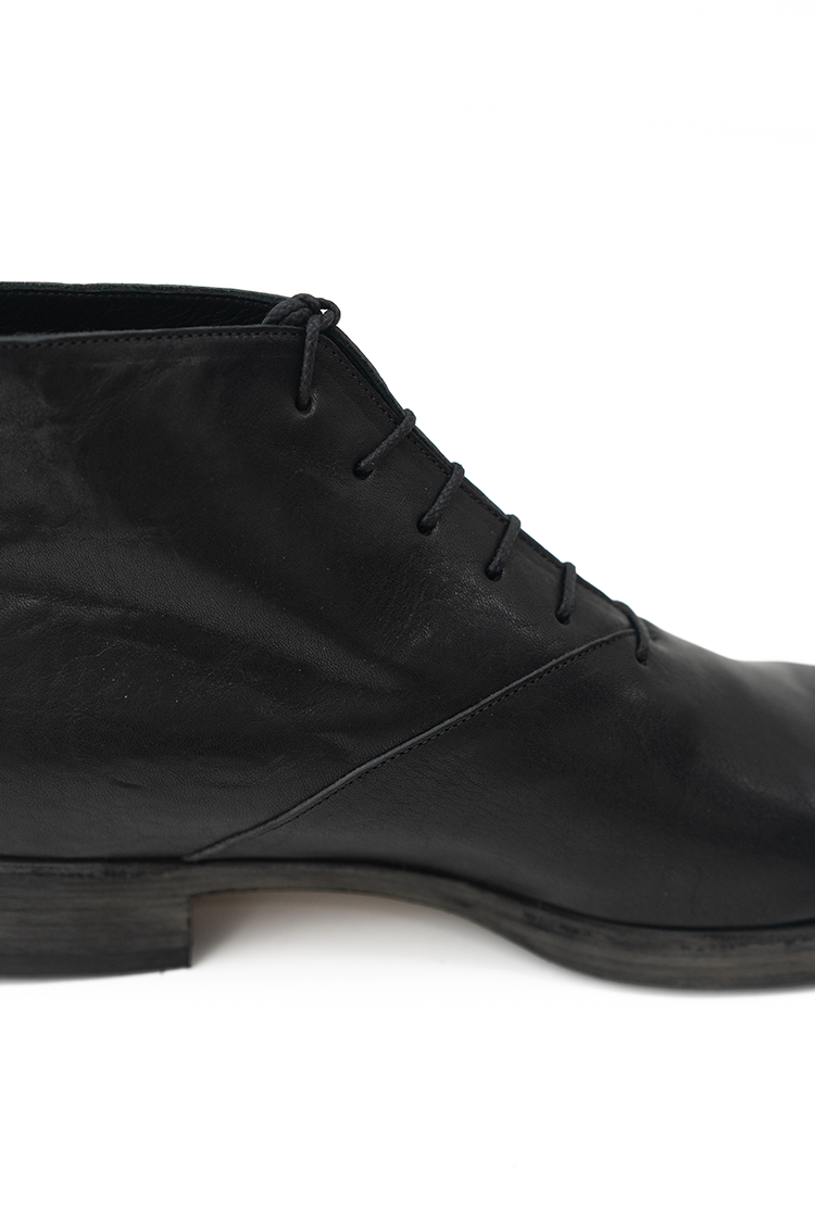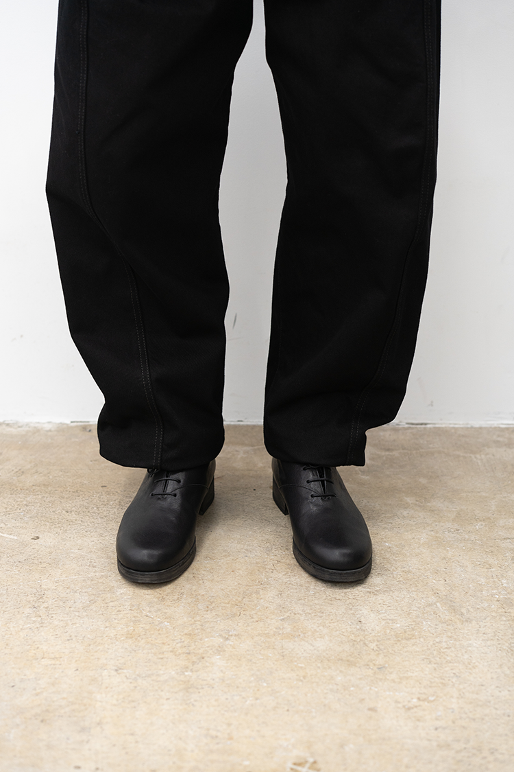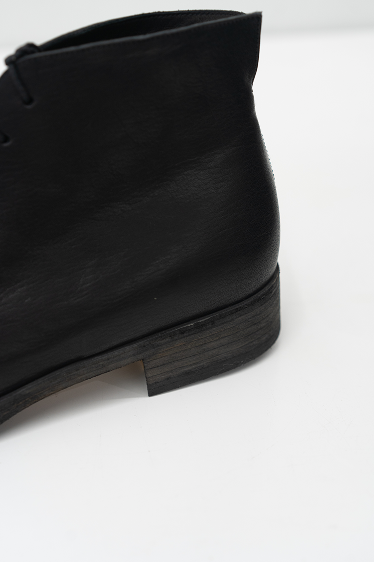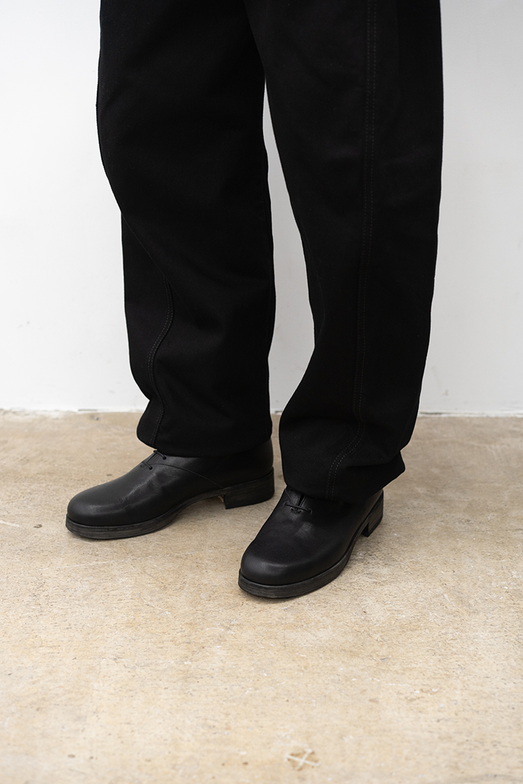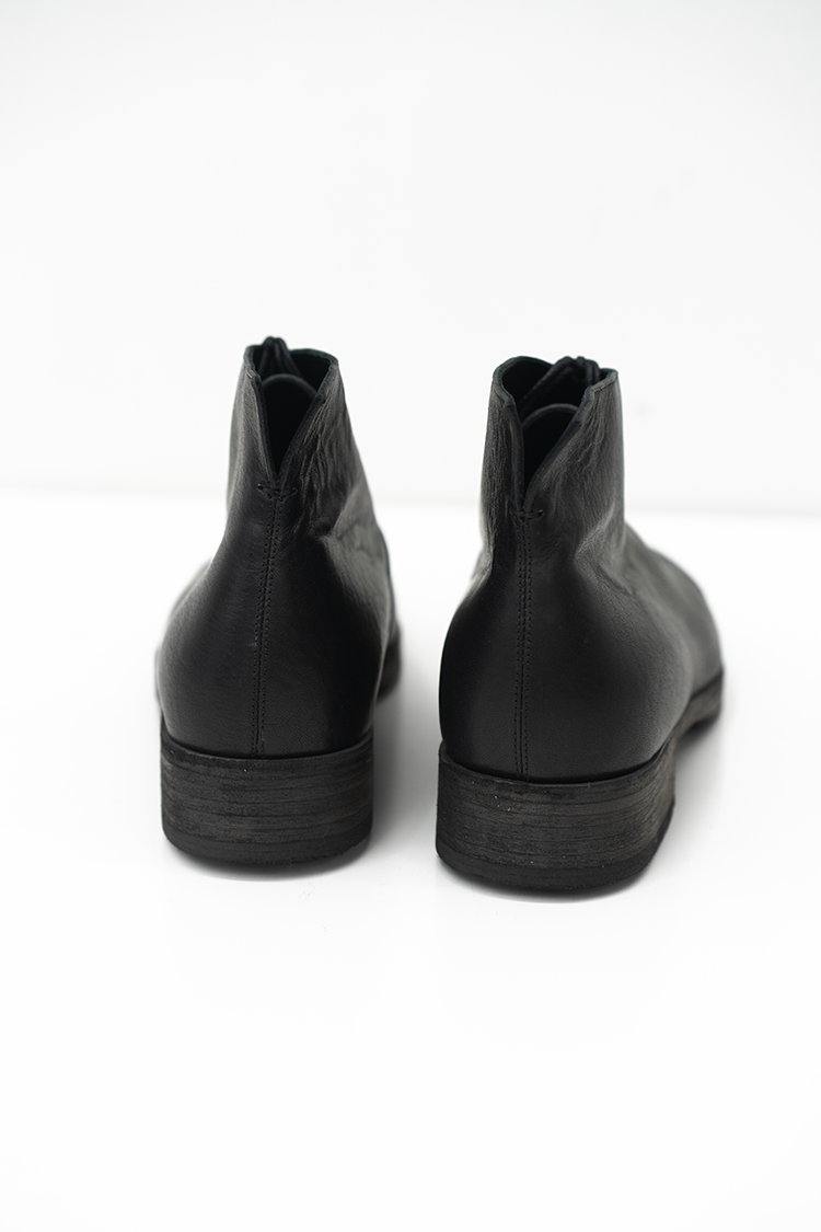 表情や質感が豊かなシュリンクレザーを使用、あらかじめワックスが塗布されており、自分の足の形が立体的に形成されていきます。後部の履き口に切り込んだスリットも特徴的。