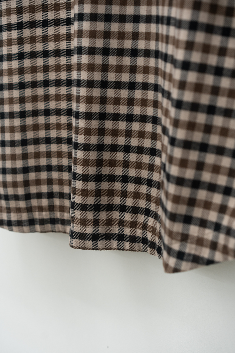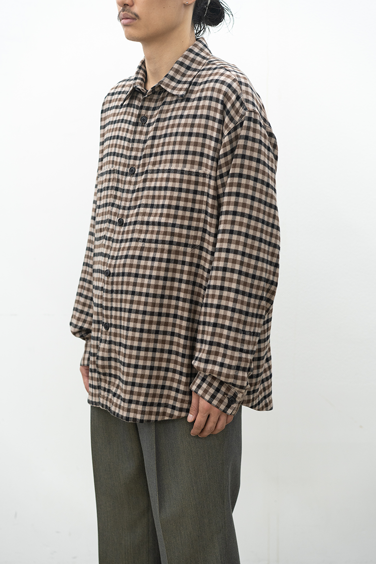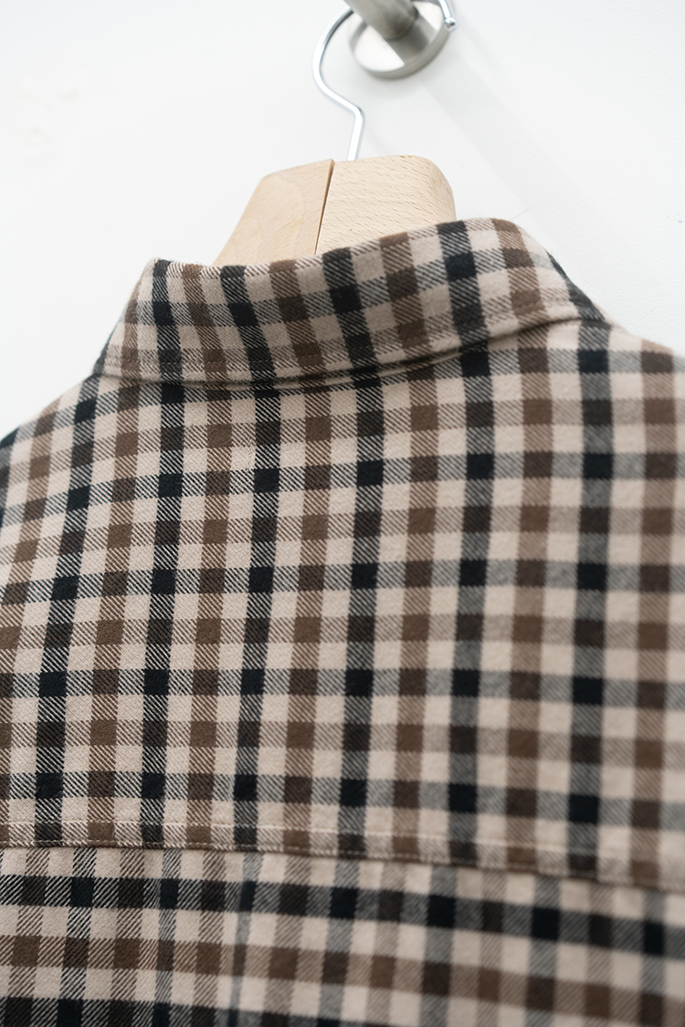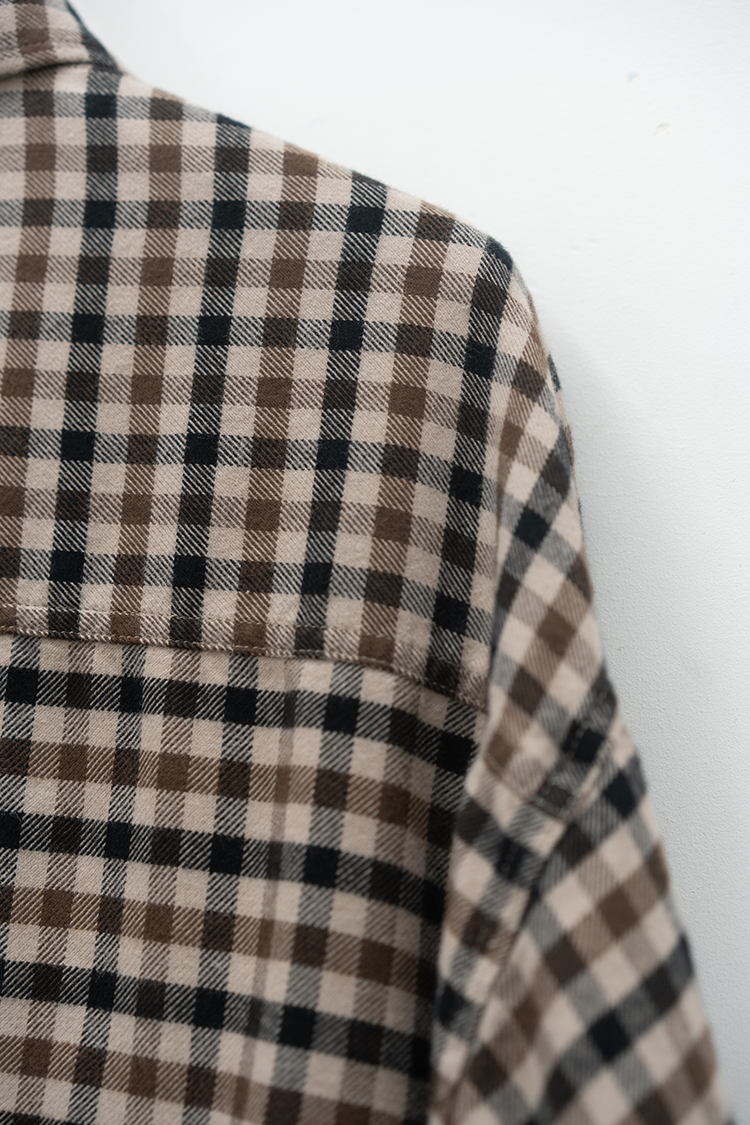 ドレスシャツをベースに仕立てたチェックシャツ。 上品な仕立てながら、両胸に配したパッチポケットによって程よくカジュアルダウンしたデザインが特徴。60双糸を経糸に使用したタッターソール、仕上にシルクプロテイン加工することで肌触りの良い上質なヌメリ感を出しております。 素材 COTTON 100% ※着用詳細 173cm / CHECK / SIZE M サイズスペック 【M】着丈‐78.0cm 身幅‐65.0cm 肩幅‐57.0cm 袖丈-61.0cm