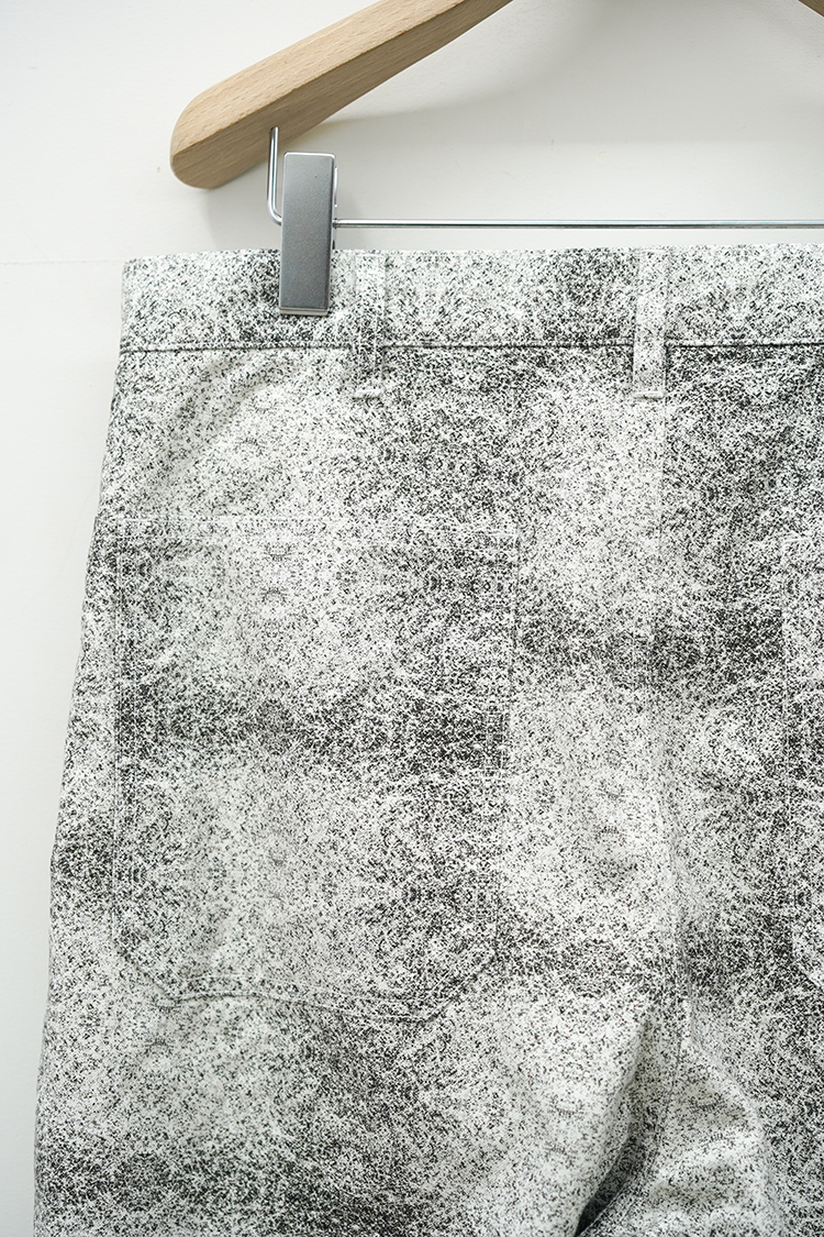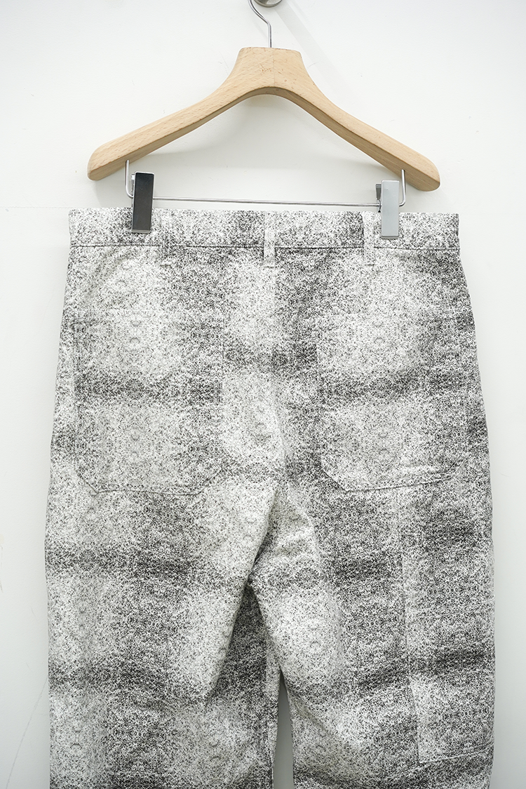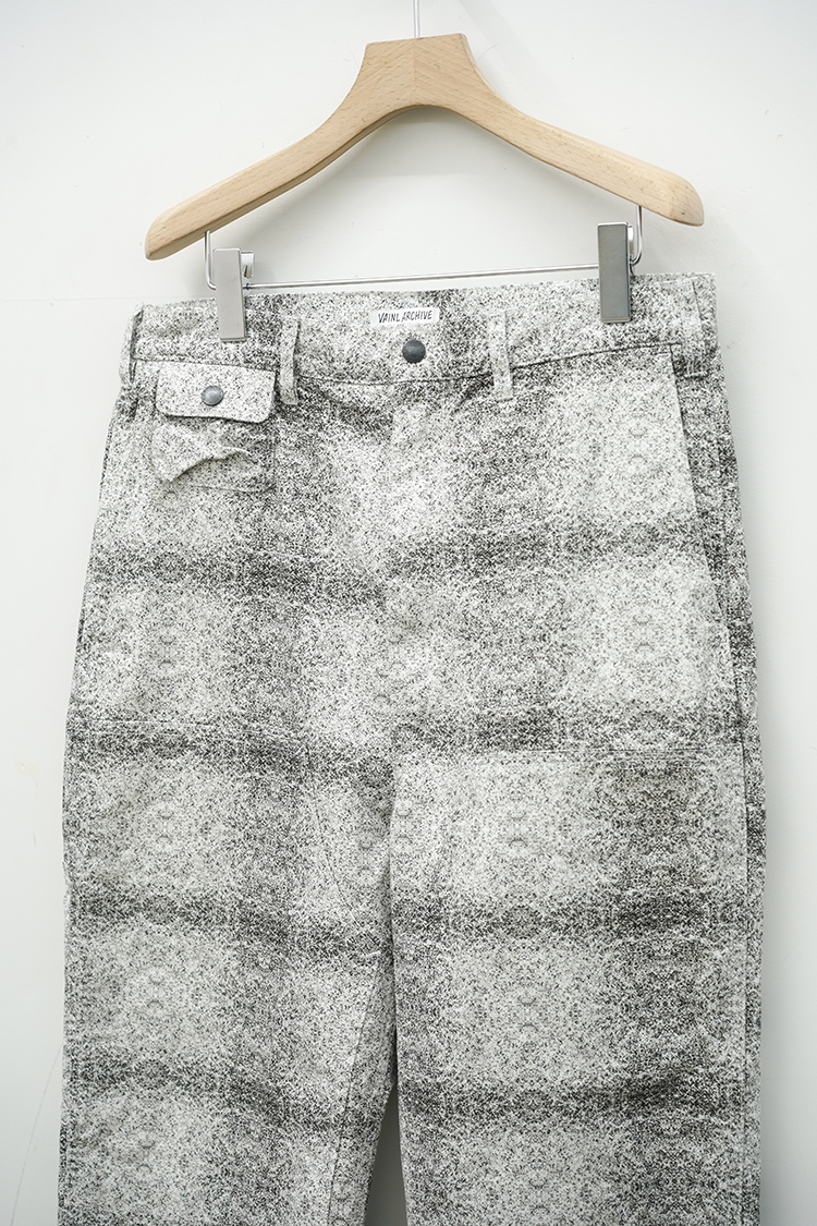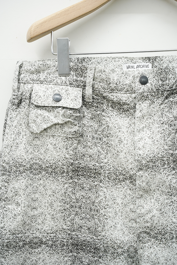 "VAINL ARCHIVE"オリジナルファブリックのダック生地にクラッシュプリントを施したワークパンツ。 膝に補強を入れたダブルニー仕様が印象的で、クラシックなワークディテールを踏襲しながらも、現代的なバランスで仕上げた新型モデルです。 シルエットは適度なゆとりを持たせたセミワイドのストレート。 裾にはドローコードを配し、気分に合わせてシルエット調整も可能です。 製品洗いによるこなれた風合いも魅力で、日常のスタイリングに自然と馴染みつつ、確かな存在感を添えてくれます。 素材 COTTON 100% ※着用詳細 cm / size サイズスペック 【M】ウエスト‐84.0cm 股上‐33.0cm 股下‐68.0cm 裾幅‐25.0cm