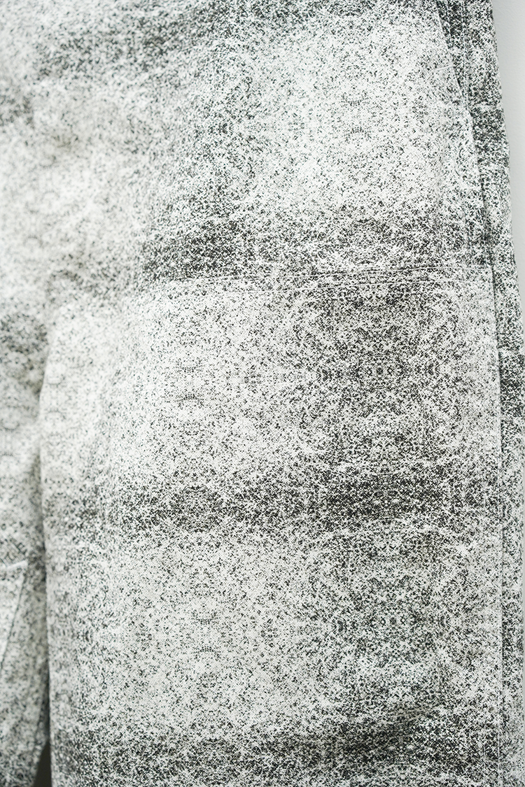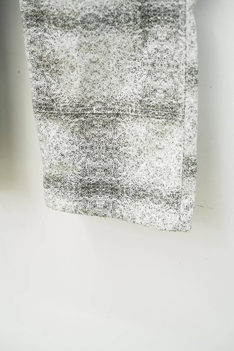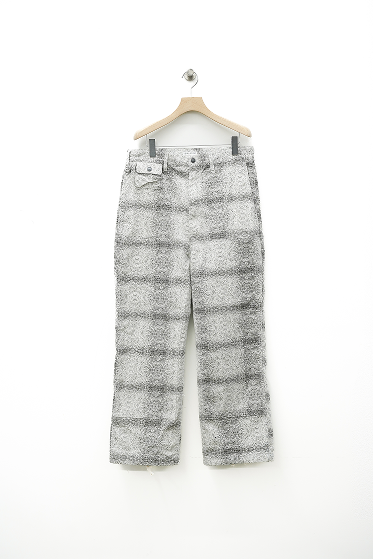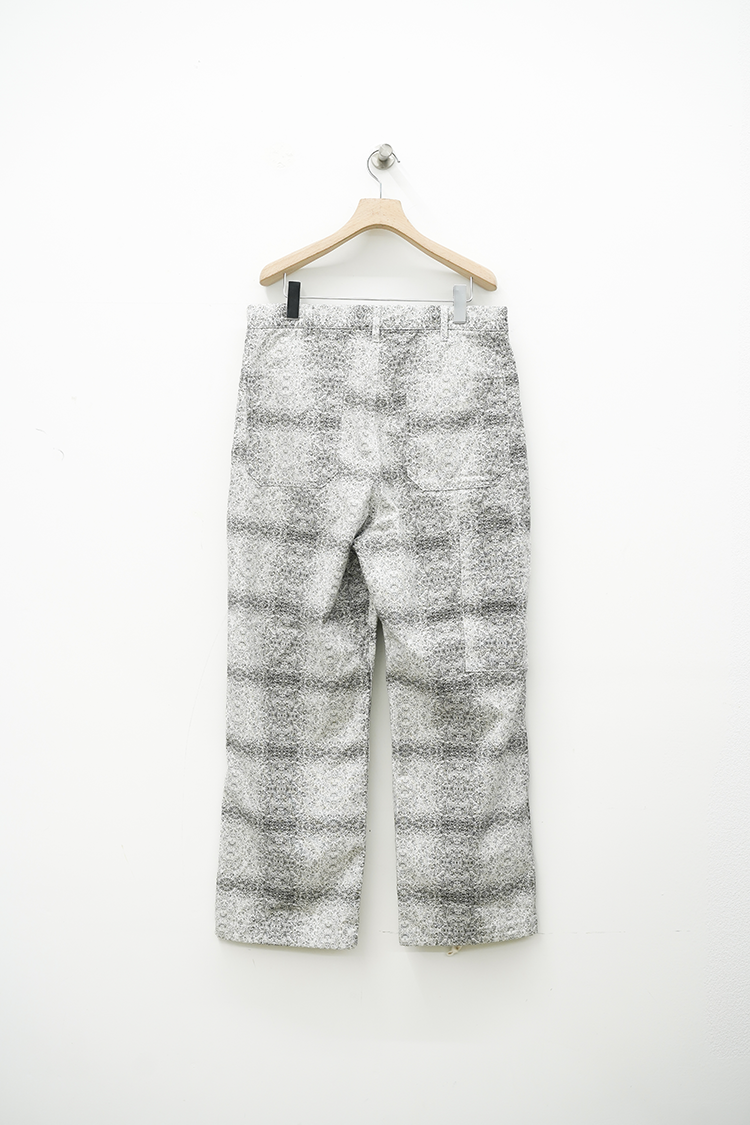 "VAINL ARCHIVE"オリジナルファブリックのダック生地にクラッシュプリントを施したワークパンツ。 膝に補強を入れたダブルニー仕様が印象的で、クラシックなワークディテールを踏襲しながらも、現代的なバランスで仕上げた新型モデルです。 シルエットは適度なゆとりを持たせたセミワイドのストレート。 裾にはドローコードを配し、気分に合わせてシルエット調整も可能です。 製品洗いによるこなれた風合いも魅力で、日常のスタイリングに自然と馴染みつつ、確かな存在感を添えてくれます。 素材 COTTON 100% ※着用詳細 cm / size サイズスペック 【M】ウエスト‐84.0cm 股上‐33.0cm 股下‐68.0cm 裾幅‐25.0cm