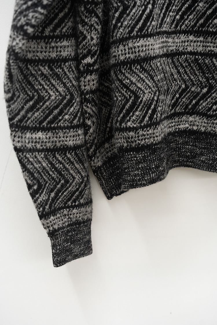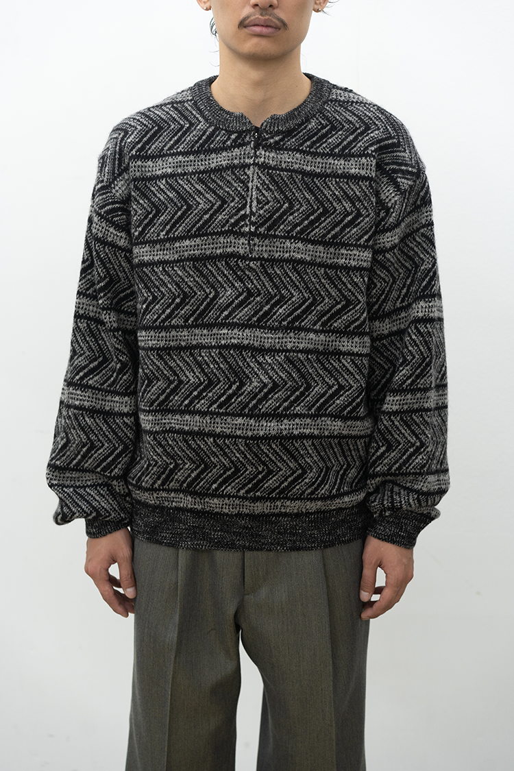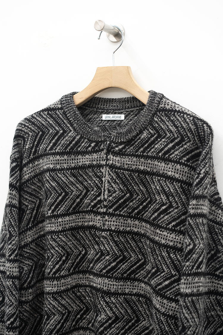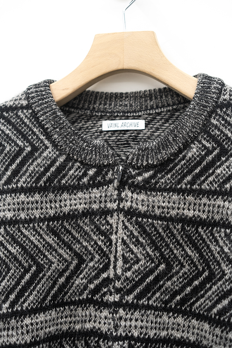 VAINL ARCHIVEのオリジナルテキスタイルを使用したハーフジップ仕様のニット。 杢ビーバー糸を使用して織り上げられ、幾何学模を2パターン採用したオリジナルテキスタイルにて仕上げられた厚手のウール地を使用。クルーネックのハーフジップ仕様、丈をやや短めに設定されたボックス型のルーズシルエットに仕上げられております。 素材 WOOL 100% ※着用詳細 173cm / BEIGE&BLACK / SIZE S サイズスペック 【S】着丈‐60.0cm 身幅‐62.0cm 肩幅‐51.0cm 袖丈-61.0cm 【M】着丈‐64.0cm 身幅‐63.0cm 肩幅‐52.0cm 袖丈-62.0cm