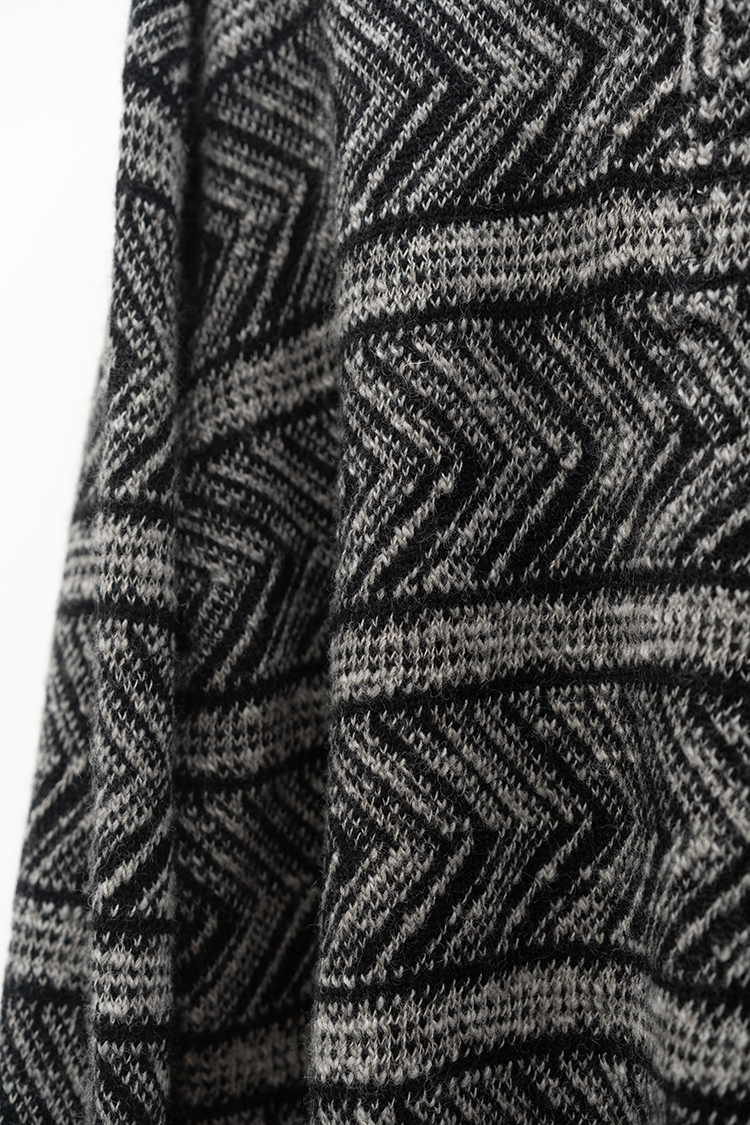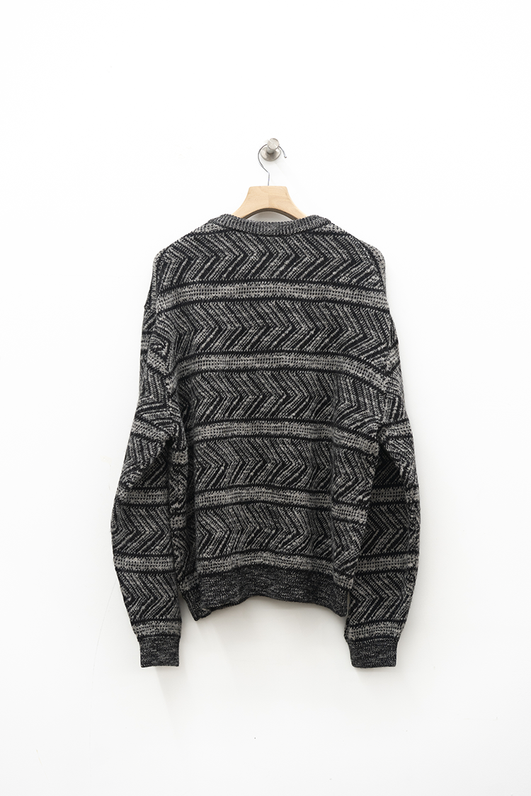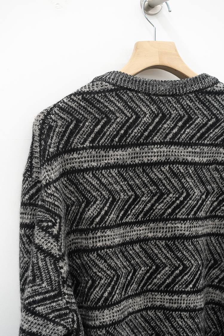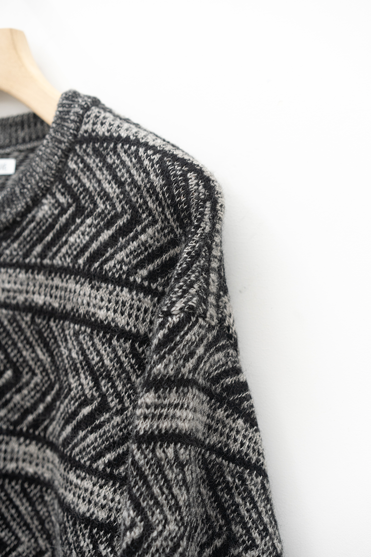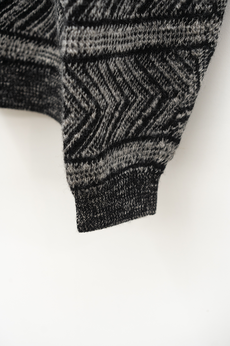VAINL ARCHIVEのオリジナルテキスタイルを使用したハーフジップ仕様のニット。 杢ビーバー糸を使用して織り上げられ、幾何学模を2パターン採用したオリジナルテキスタイルにて仕上げられた厚手のウール地を使用。クルーネックのハーフジップ仕様、丈をやや短めに設定されたボックス型のルーズシルエットに仕上げられております。 素材 WOOL 100% ※着用詳細 173cm / BEIGE&BLACK / SIZE S サイズスペック 【S】着丈‐60.0cm 身幅‐62.0cm 肩幅‐51.0cm 袖丈-61.0cm 【M】着丈‐64.0cm 身幅‐63.0cm 肩幅‐52.0cm 袖丈-62.0cm