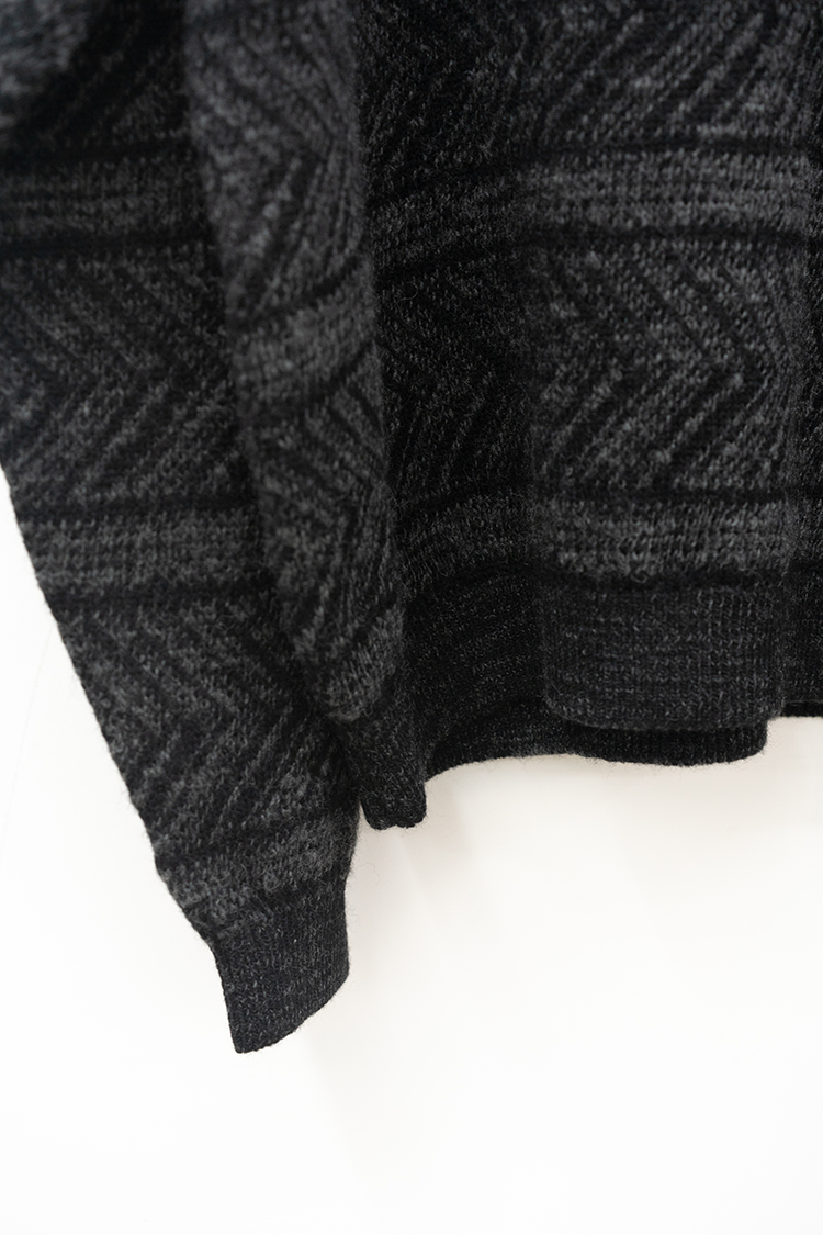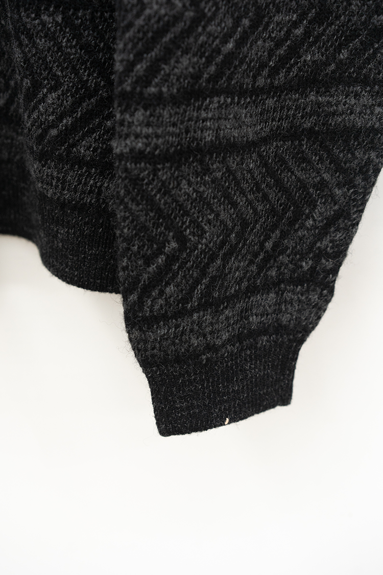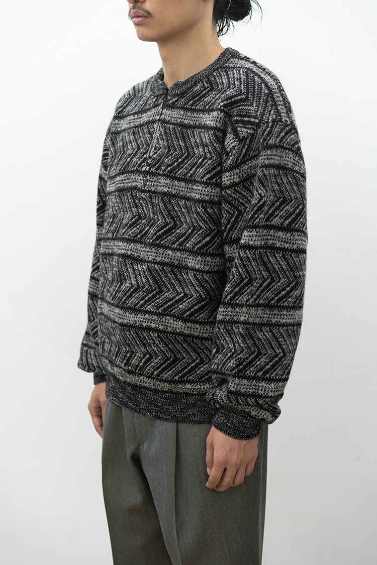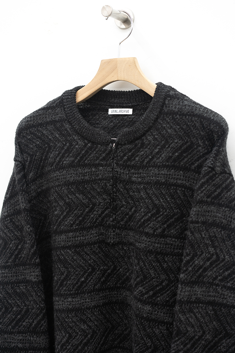 VAINL ARCHIVEのオリジナルテキスタイルを使用したハーフジップ仕様のニット。 杢ビーバー糸を使用して織り上げられ、幾何学模を2パターン採用したオリジナルテキスタイルにて仕上げられた厚手のウール地を使用。クルーネックのハーフジップ仕様、丈をやや短めに設定されたボックス型のルーズシルエットに仕上げられております。 素材 WOOL 100% ※着用詳細 173cm / BEIGE&BLACK / SIZE S サイズスペック 【M】着丈‐64.0cm 身幅‐63.0cm 肩幅‐52.0cm 袖丈-62.0cm
