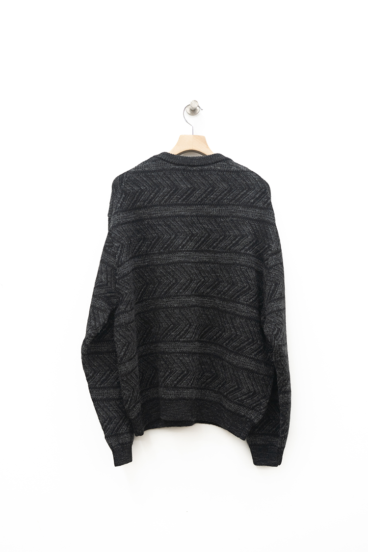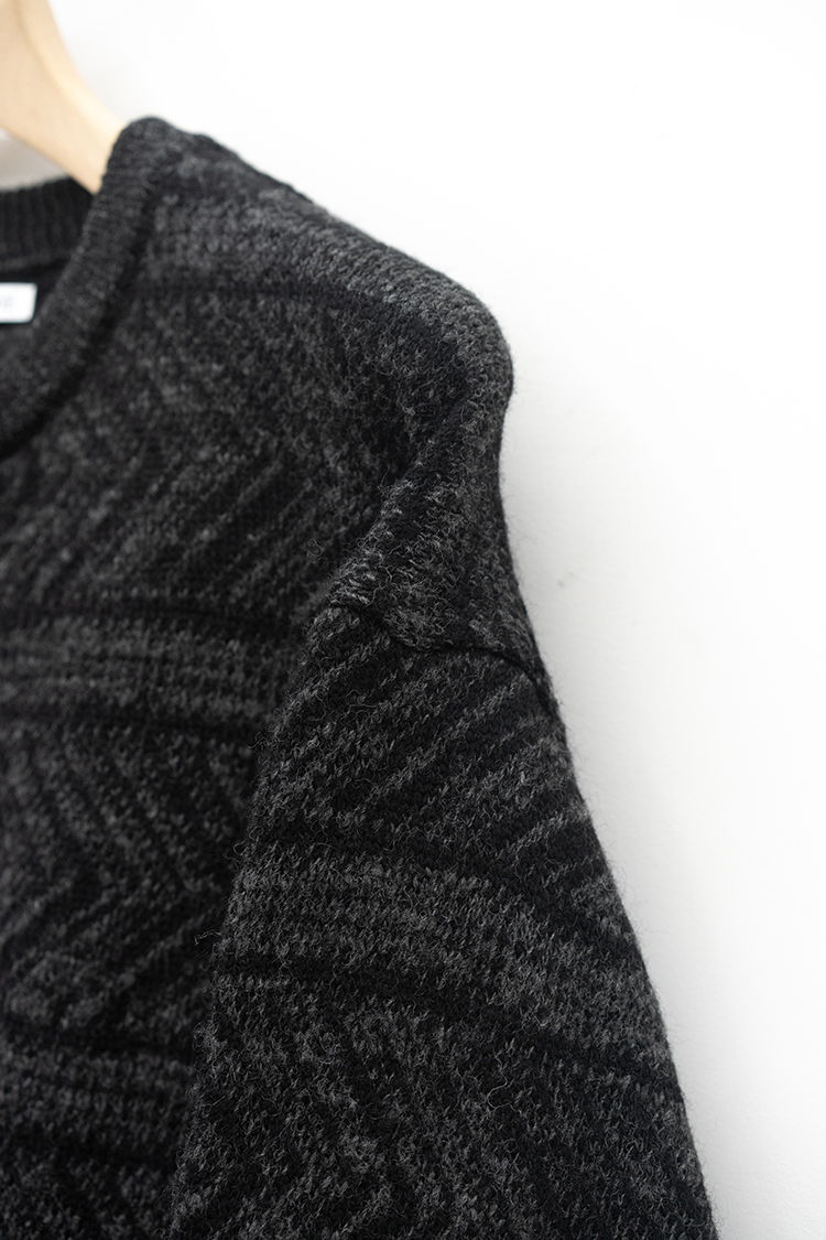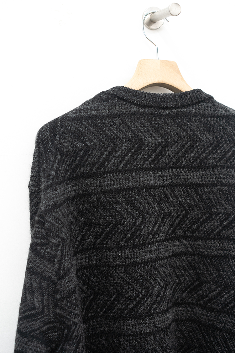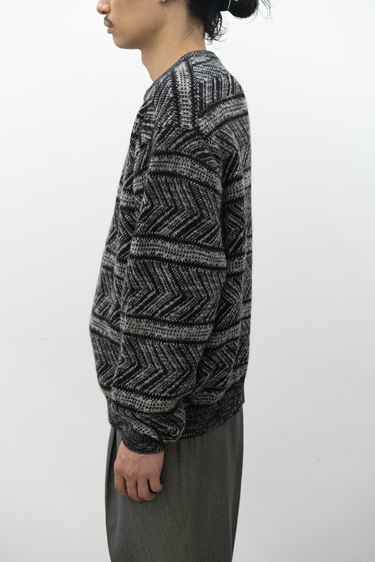 VAINL ARCHIVEのオリジナルテキスタイルを使用したハーフジップ仕様のニット。 杢ビーバー糸を使用して織り上げられ、幾何学模を2パターン採用したオリジナルテキスタイルにて仕上げられた厚手のウール地を使用。クルーネックのハーフジップ仕様、丈をやや短めに設定されたボックス型のルーズシルエットに仕上げられております。 素材 WOOL 100% ※着用詳細 173cm / BEIGE&BLACK / SIZE S サイズスペック 【M】着丈‐64.0cm 身幅‐63.0cm 肩幅‐52.0cm 袖丈-62.0cm