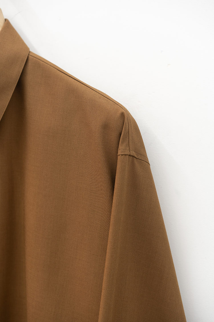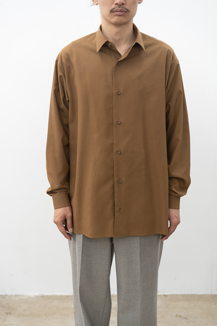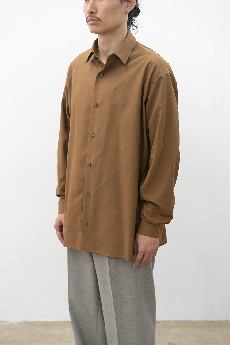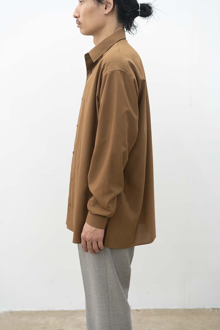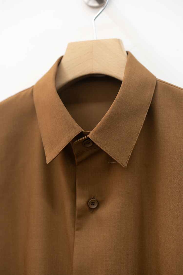 スーパーライトのスパンブロード素材を使用したレギュラーカラーシャツです。 前立ては裏前立て仕様で、シンプルな無駄のない洗練された仕上がりに。身頃のストレートに落ちるシルエットを強調しないラインと、全体的にゆとりを持たせたパターン設計にすることで、フォーマルにもカジュアルにも着用できる現代的なデザインです。ドロップショルダーの設計は重力に対し自然に直下し、アームホールに無駄なシワが入ることなくバストの抱きも美しく見えるように計算されており、袖を少し長めの設計にすることでカフスがブラウジングされ、袖口のタックによりボリュームをもたせています。計算し尽くされた衿の形状やパターン寸法・仕様は「パーフェクトシャツ」という名にふさわしいデザイン設計となっております。