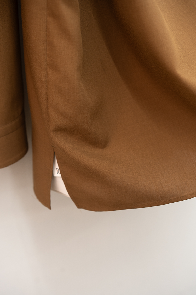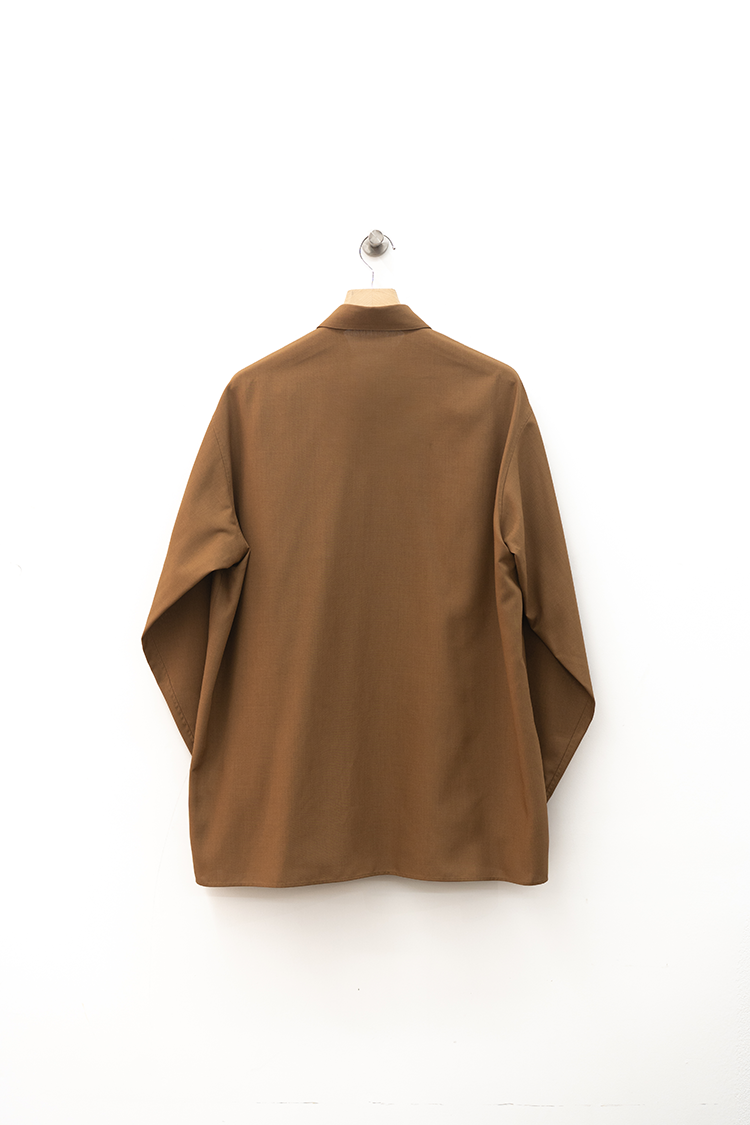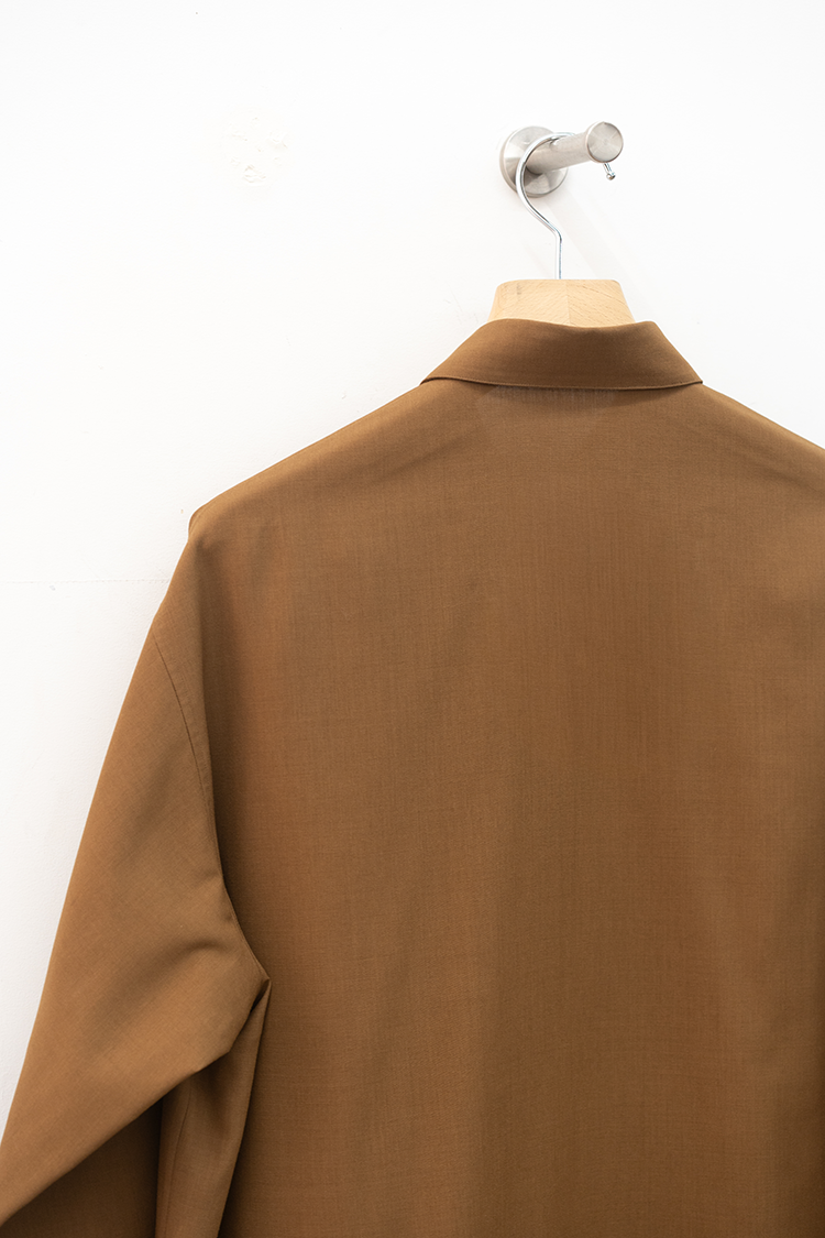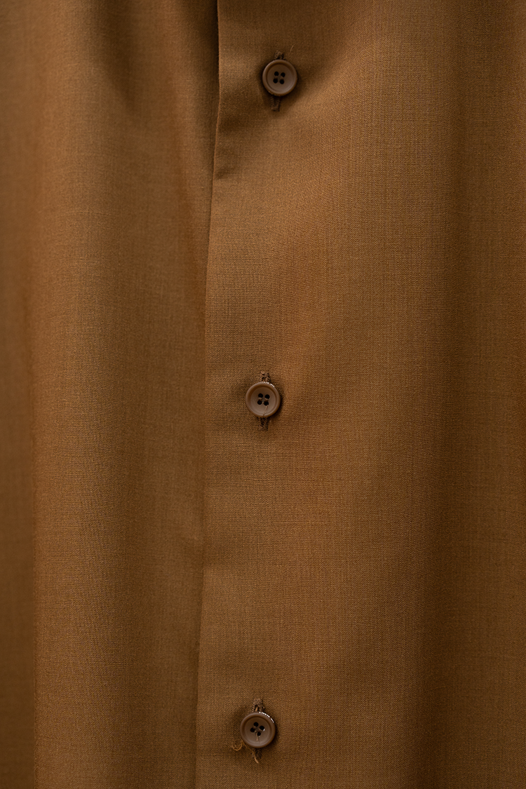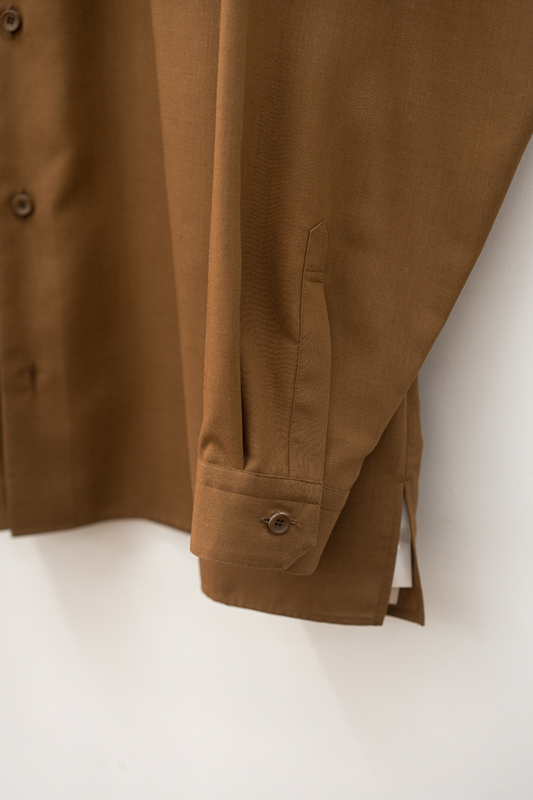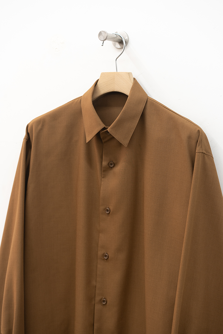 スーパーライトのスパンブロード素材を使用したレギュラーカラーシャツです。 前立ては裏前立て仕様で、シンプルな無駄のない洗練された仕上がりに。身頃のストレートに落ちるシルエットを強調しないラインと、全体的にゆとりを持たせたパターン設計にすることで、フォーマルにもカジュアルにも着用できる現代的なデザインです。ドロップショルダーの設計は重力に対し自然に直下し、アームホールに無駄なシワが入ることなくバストの抱きも美しく見えるように計算されており、袖を少し長めの設計にすることでカフスがブラウジングされ、袖口のタックによりボリュームをもたせています。計算し尽くされた衿の形状やパターン寸法・仕様は「パーフェクトシャツ」という名にふさわしいデザイン設計となっております。