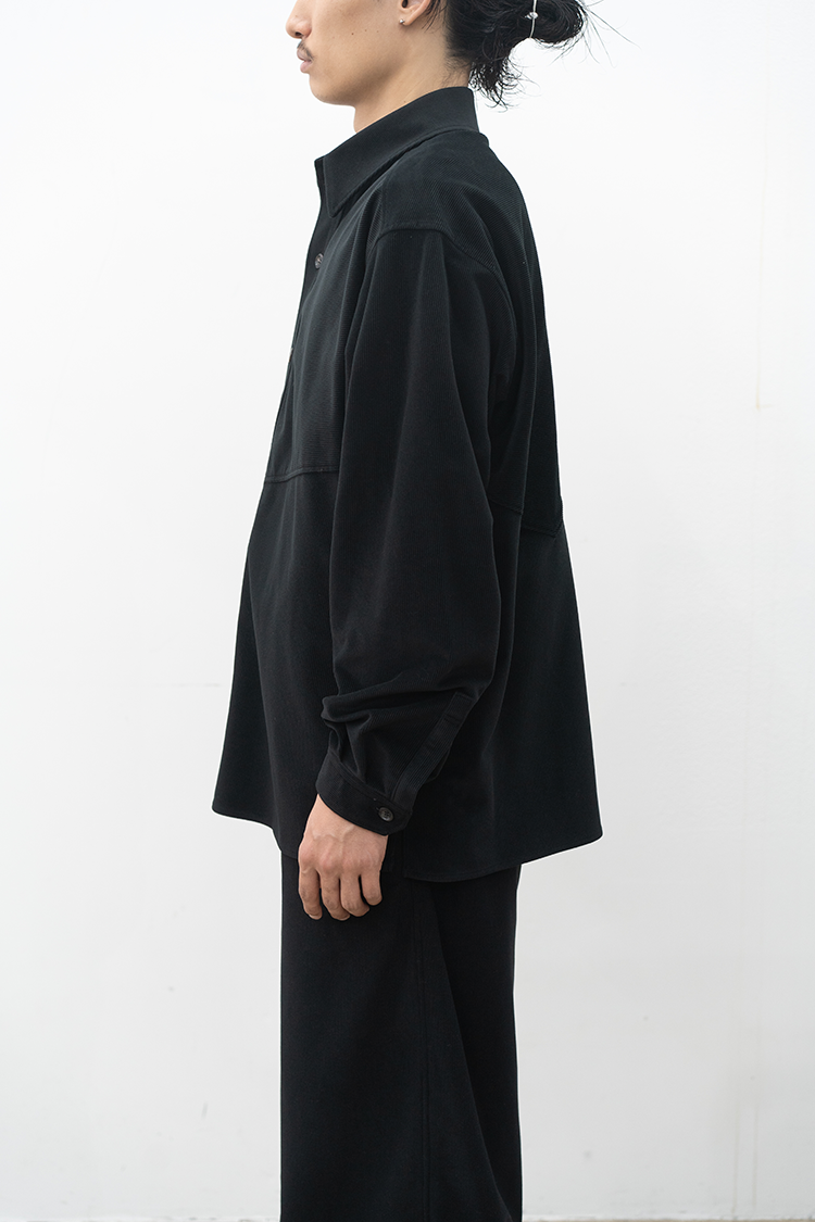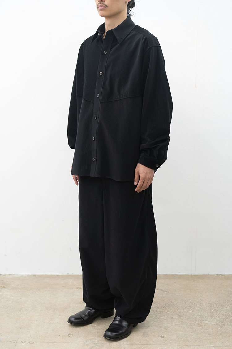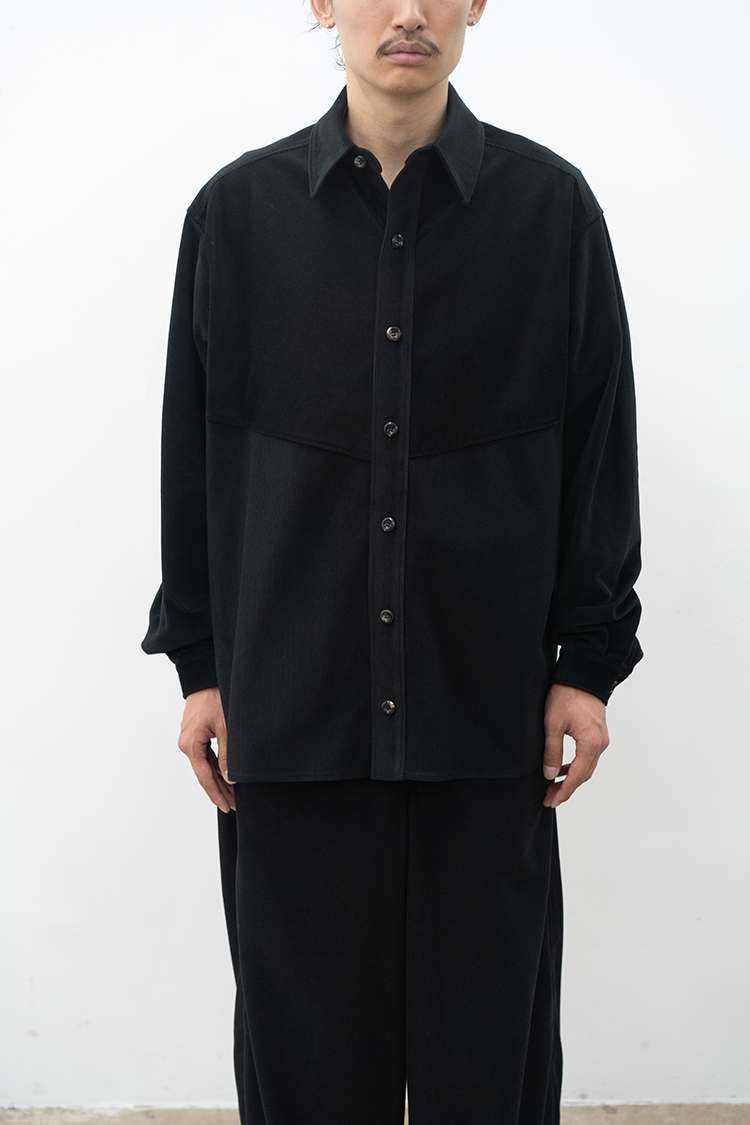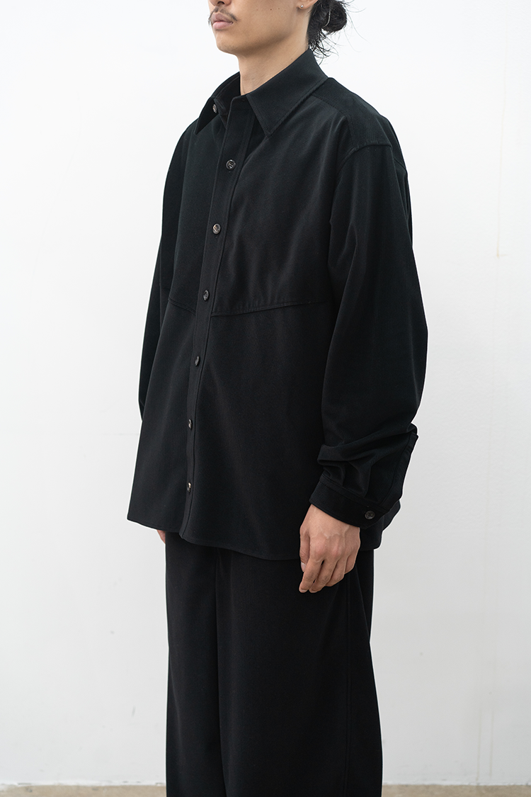 特徴的な肩のヨークが切り返しデザインはそのままに、ウエスタンシャツをコーデュロイ素材でRERACSらしくモダンにアップデートした一着。ポリエステル素材を使用する事で、形状安定性と綺麗な光沢感を失う事なく、コーデュロイ素材のデメリットを解消した風合いとなっております。蓄熱機能がありインナーでの使用にも適しており、生地表面の凹凸感が美しい光沢のコントラストを生み出しています。全体的にゆとりを持たせ、切り替えデザインが目を引く身頃はシェイプがなく重力に沿ってストレートに落ちる美しいシルエット、緻密な計算によって生み出されたドロップショルダーは、独特の設計でアームホールに無駄なしわがなくバストの抱きが美しく見えるパターンとなっています。極力デザインを削ぎ落したシンプルで洗練されたディテールに仕上げています。