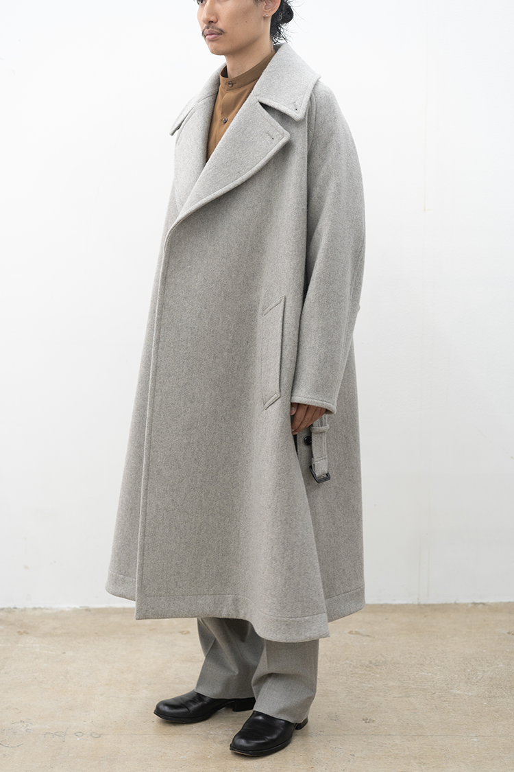 フロントのボタンは表から見えない比翼仕立てになっており洗練された印象を付与しています。また、大きく設定された襟ぐりがアクセントとなっております。襟は折り返して着用する以外に、襟を立たせてボタンを留めることでスタンドカラーとしても着用できる設計です。両脇裾の高めのスリットはボタンで開閉でき、パンツのポケットにスムーズに手を入れられるようになっており、また足元に動きをもたせるなど実用性とデザイン性を兼ね備えた設計となっております。ドレスの様に完全に1枚で仕立て、THE RERACS独自の解釈にて構築した今期を象徴する一着となっております。