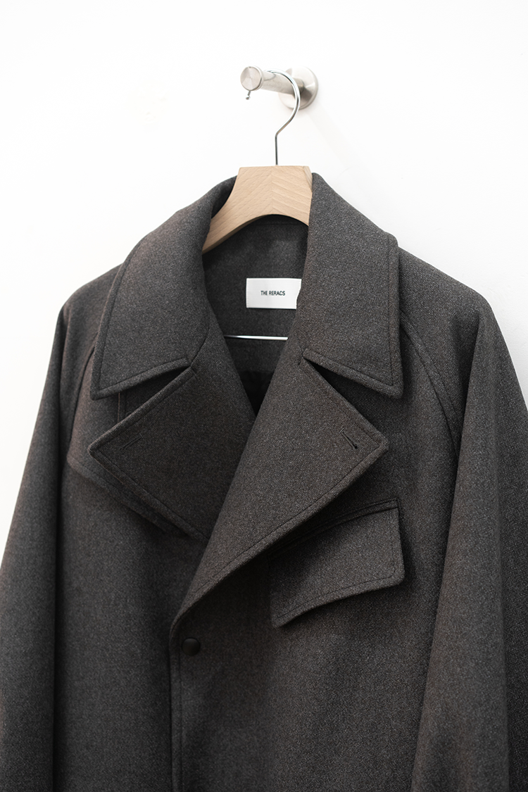 SUPER140のオリジナル梳毛をベースに使用し、梳毛の糸の持つ光沢感、紡毛の糸の持つ膨らみの良い所取りをし、ハリ感、光沢感、ヌメリ感などSUPER140の原料の良さを最大限に引き出したメルトン素材です。一般的にスーパー原料を使用すると下がってしまう強度を、手間のかかる工程と高度な設計により、経年劣化に強い高密度に仕上げています。通常のメルトンで使用しないレベルの糸を贅沢に使用したTHE RERACSオリジナルの最高峰の素材。