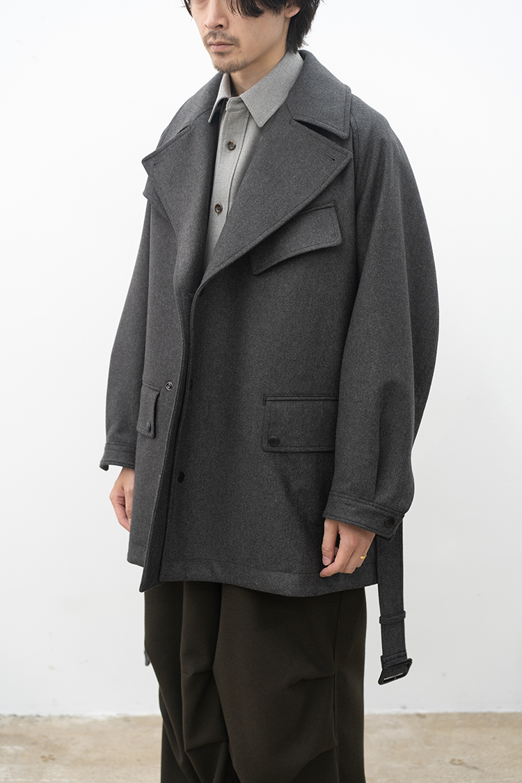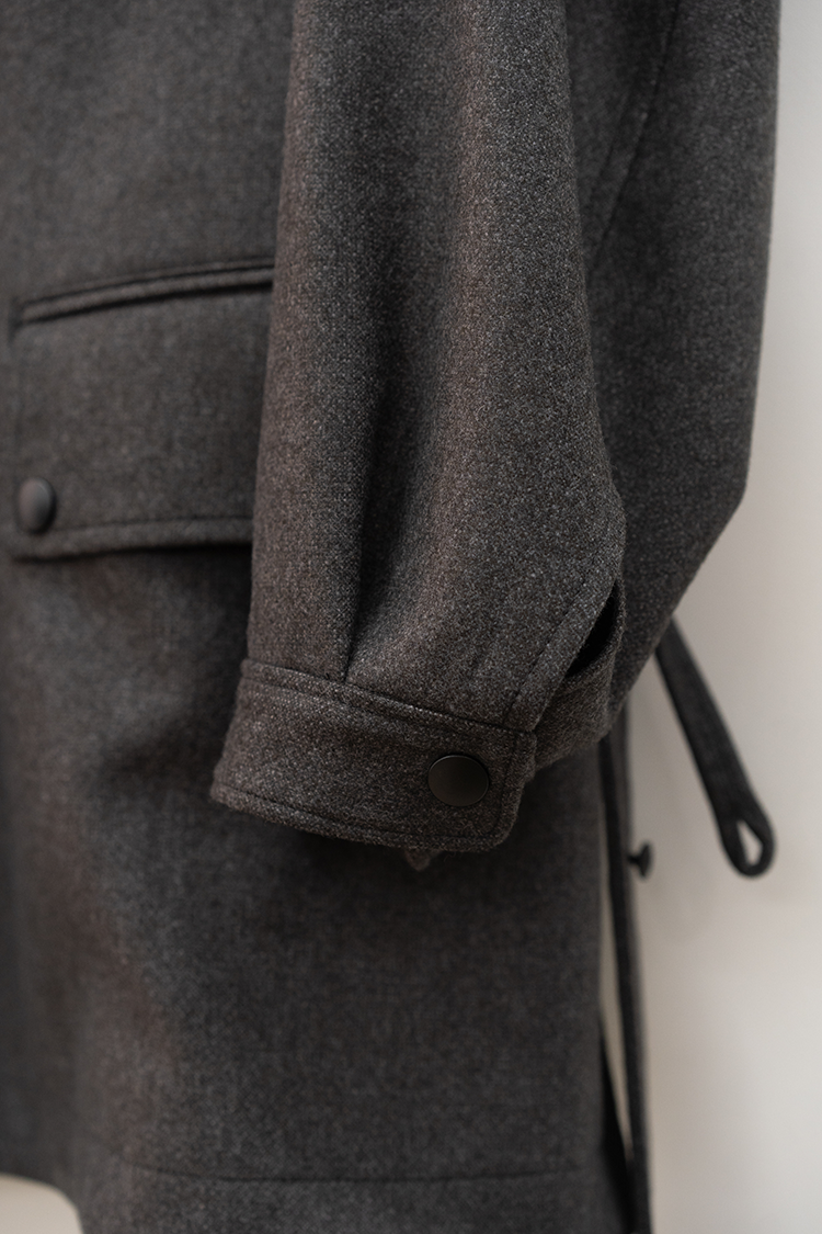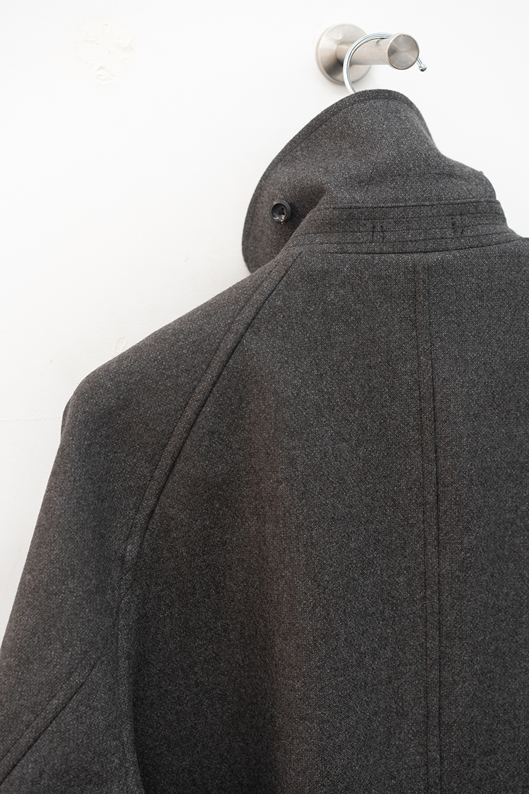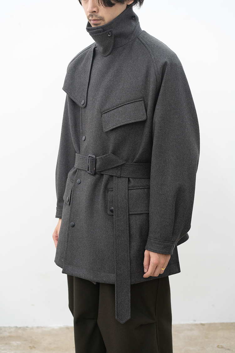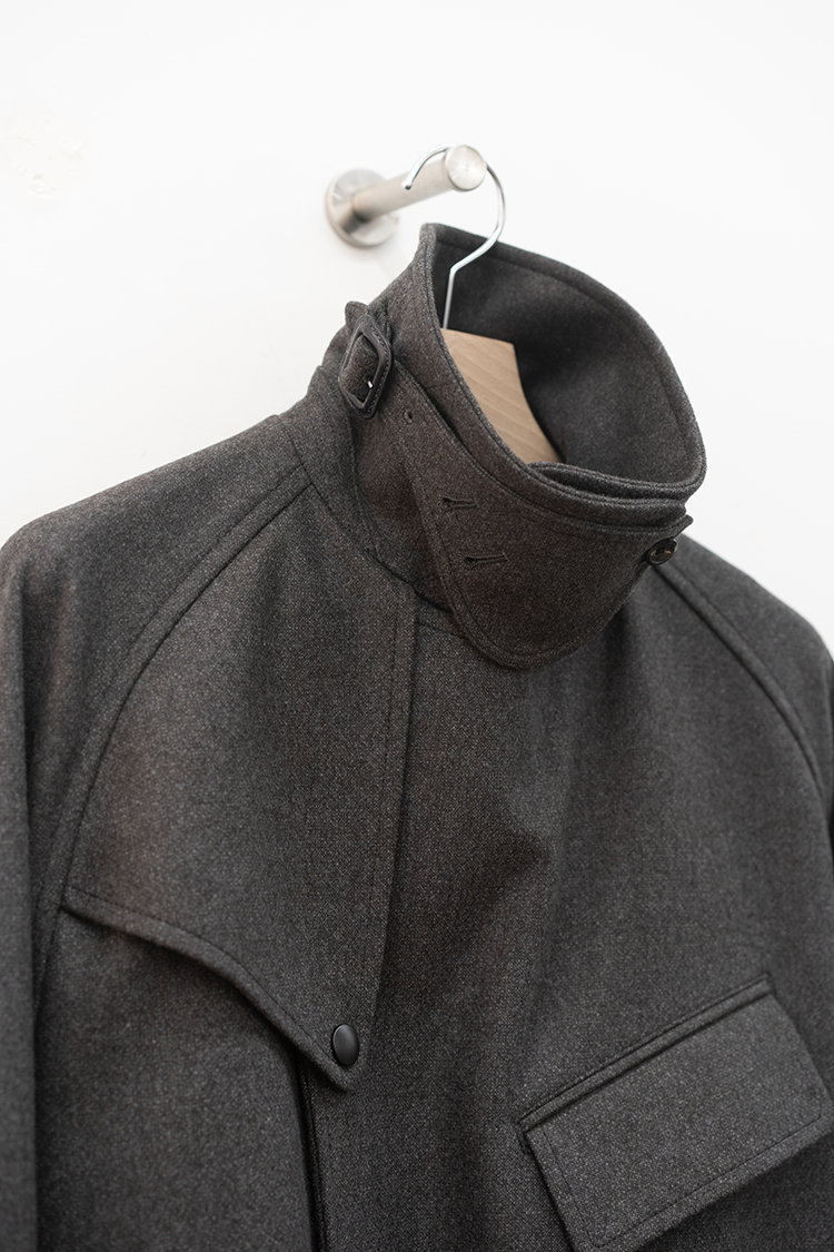 また、モーターサイクルコートを象徴するマップポケットやチンストラップ、フロントの左右に配置されたフラップ付きのパッチポケットなど現代的でありながらミリタリーの要素を踏襲したパターン設計となっております。襟は通常通り折り返して着用する以外に、襟を立たせてストラップを留めることでスタンドカラーとしても着用できる設計です。両脇の高めのスリットは釦で開閉でき、パンツのポケットにスムーズに手を入れられる仕様になっています。 トラディショナルな仕様と洗練されたデザインを感じられる佇まいで、今季を象徴する完成されたコートです。