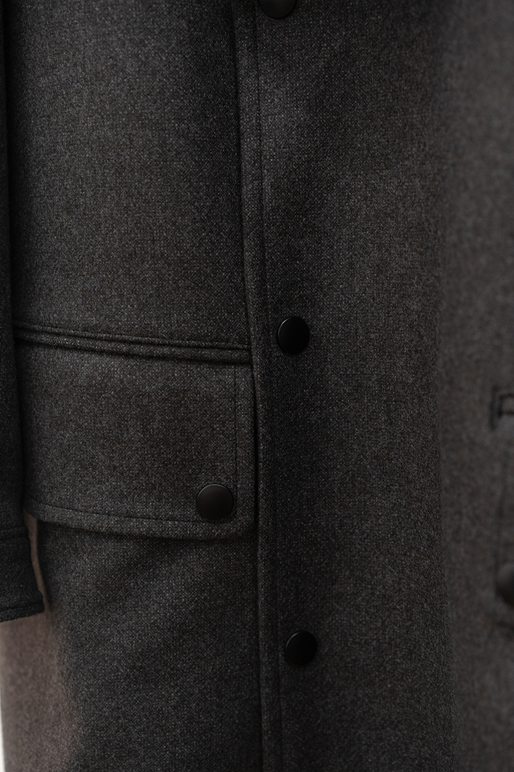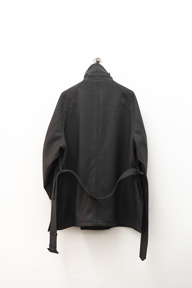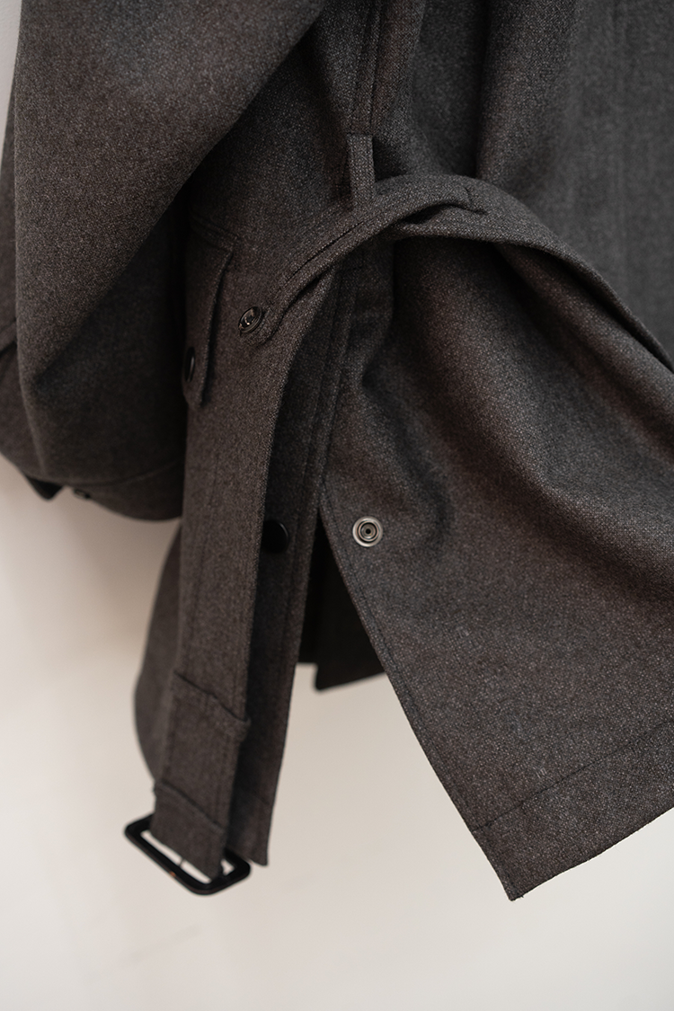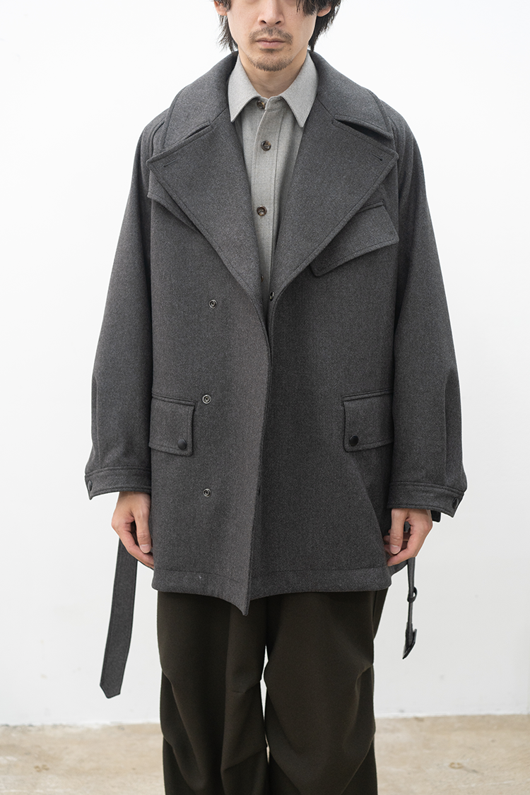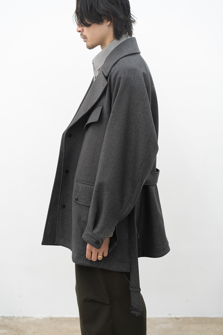 また、モーターサイクルコートを象徴するマップポケットやチンストラップ、フロントの左右に配置されたフラップ付きのパッチポケットなど現代的でありながらミリタリーの要素を踏襲したパターン設計となっております。襟は通常通り折り返して着用する以外に、襟を立たせてストラップを留めることでスタンドカラーとしても着用できる設計です。両脇の高めのスリットは釦で開閉でき、パンツのポケットにスムーズに手を入れられる仕様になっています。 トラディショナルな仕様と洗練されたデザインを感じられる佇まいで、今季を象徴する完成されたコートです。