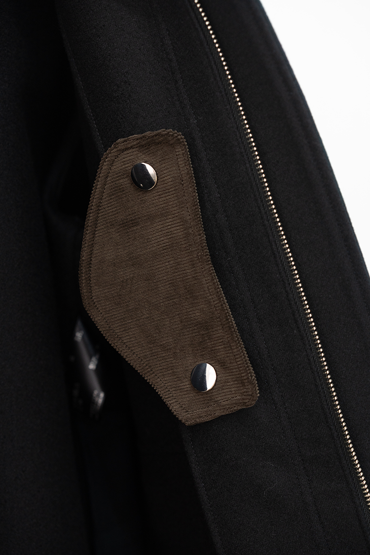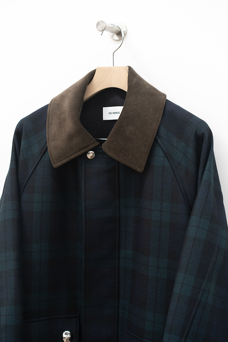 フロント前立てはドットボタンとファスナーで開閉ができる仕様となっております。オリジナルファスナーは、引手が引きやすいように0.7mmの傾斜をつけて設計しています。緩やかなAラインシルエットと前後差をつけた裾回りによってシルエットがより立体的になり、全体のバランスを構築しています。伝統的な素材と現代的なデザイン要素が融合したTHE RERACSらしい上品な一着です。