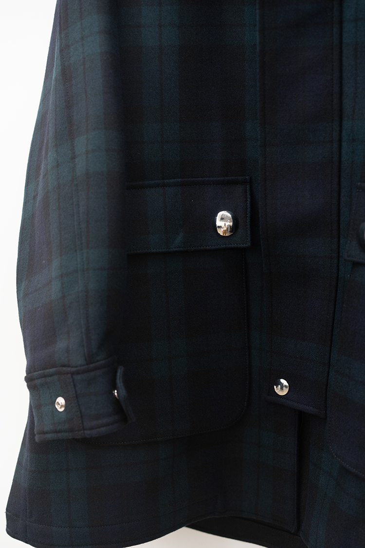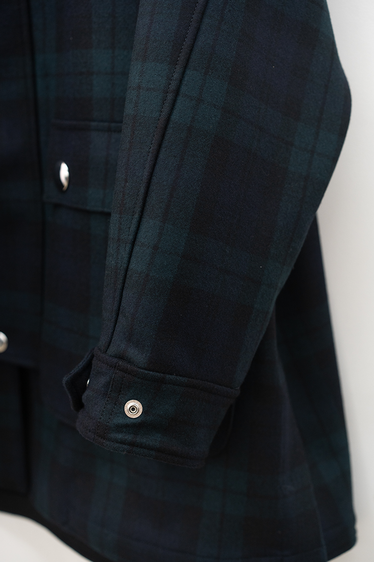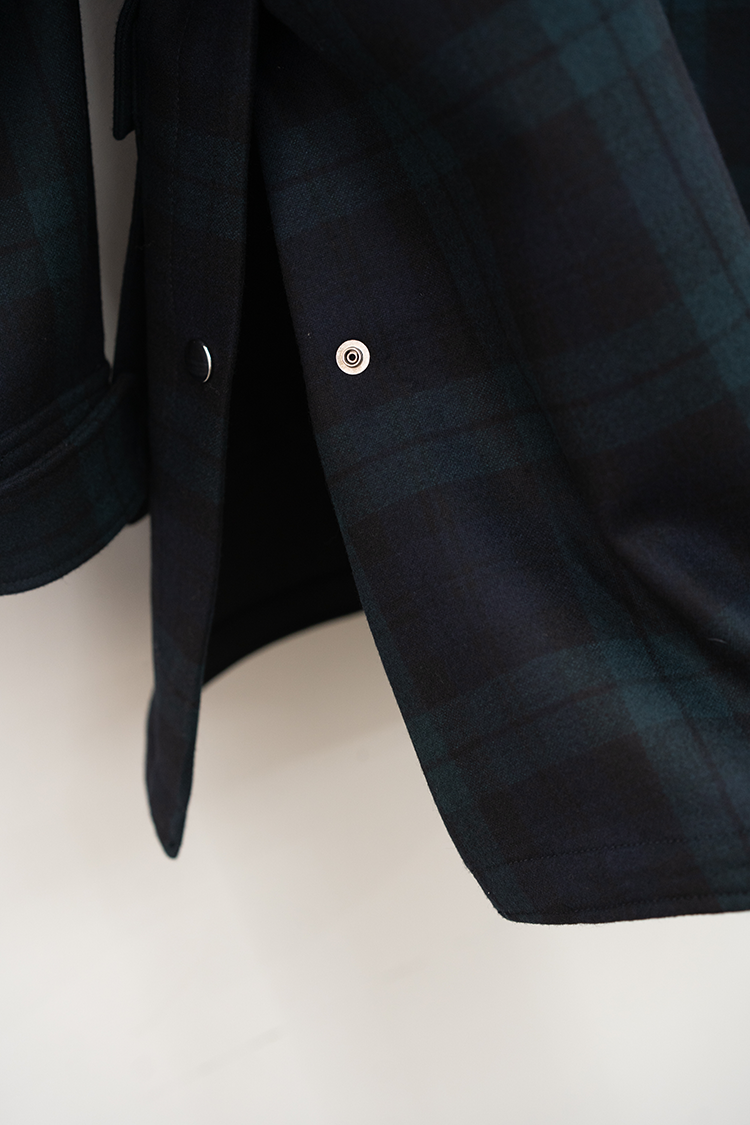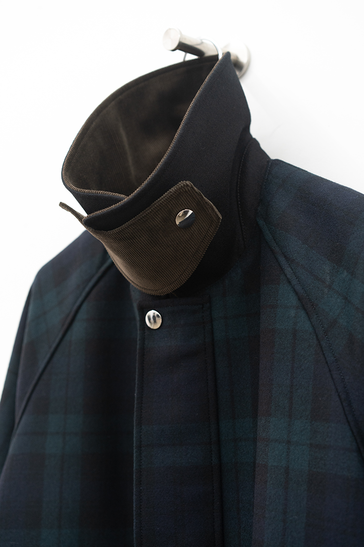 美しい形状の大きな衿とフロント左右のアコーディオンポケットが印象的なディテールで、ドットボタンは大きめの25.4mmサイズを使用。ラグランスリーブで肩回りと袖はゆったりとした設計。裏地のない一重仕立てで縫い代は折伏せで裏側から見ても美しくかつ軽さを生かした設計となっています。袖を少し長めの設計にすることでカフスがブラウジングされ、袖口のタックにより更にボリュームを持たせています。また、襟を立てて付属のストラップを留めれば首周りをぐるりと覆うハイネック仕様に。