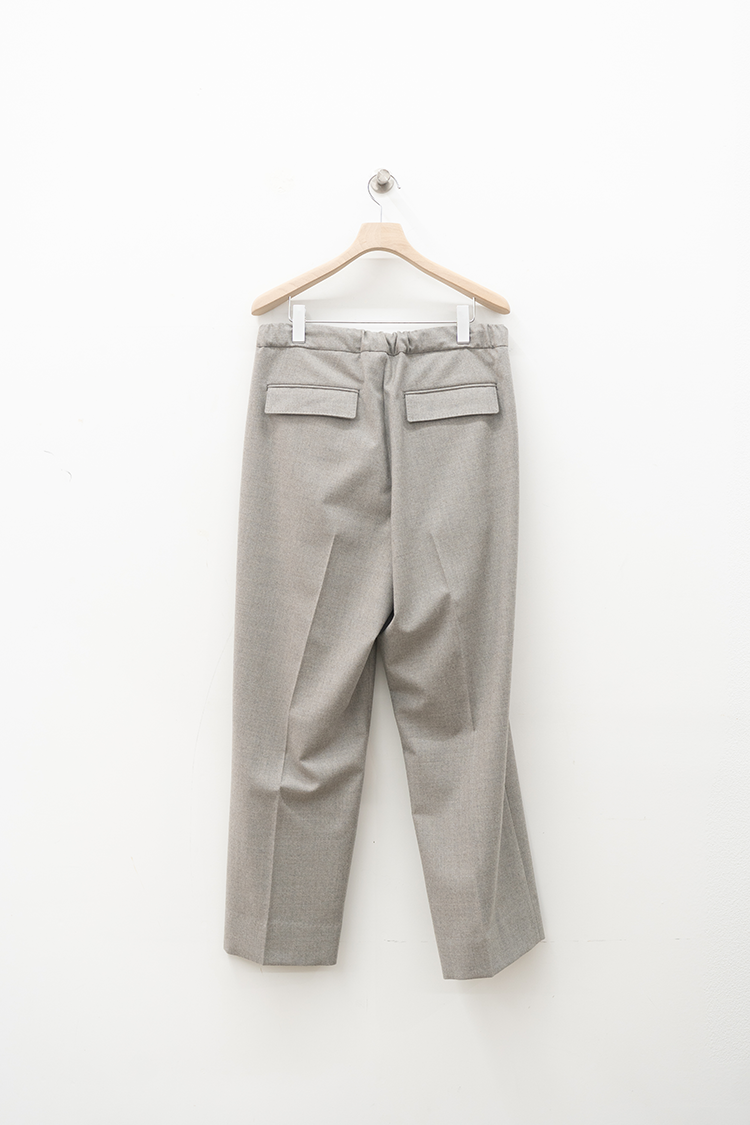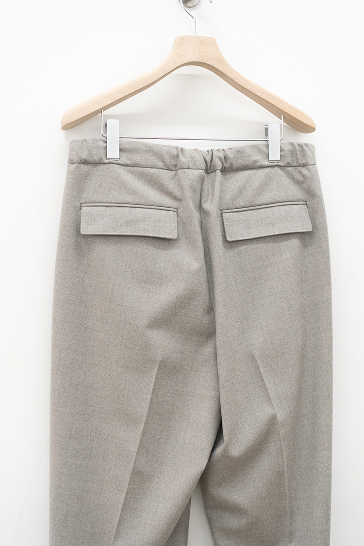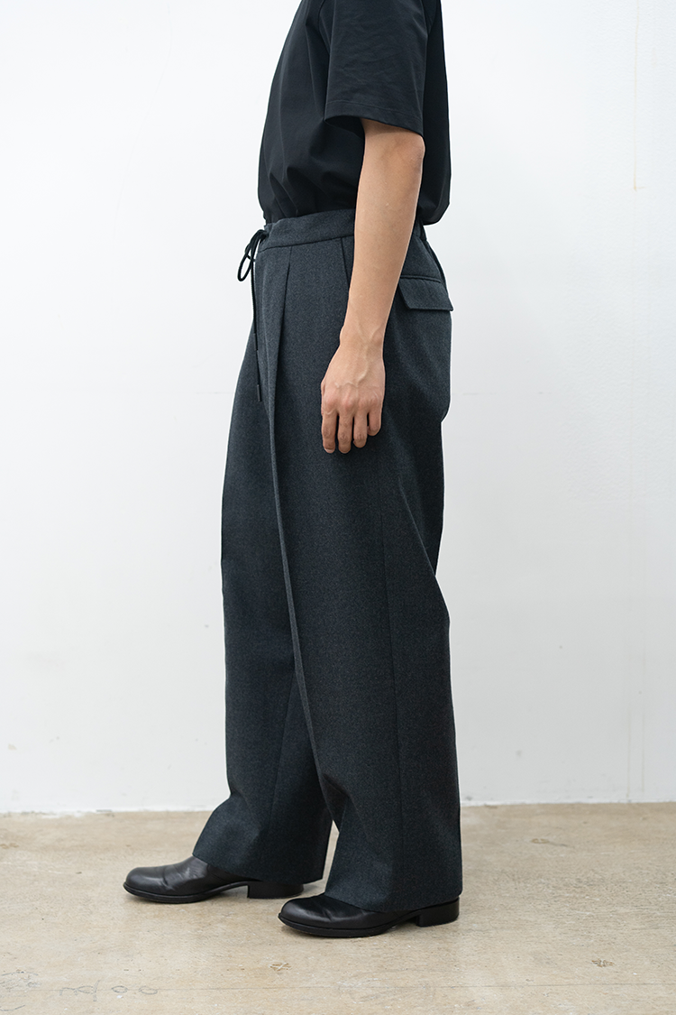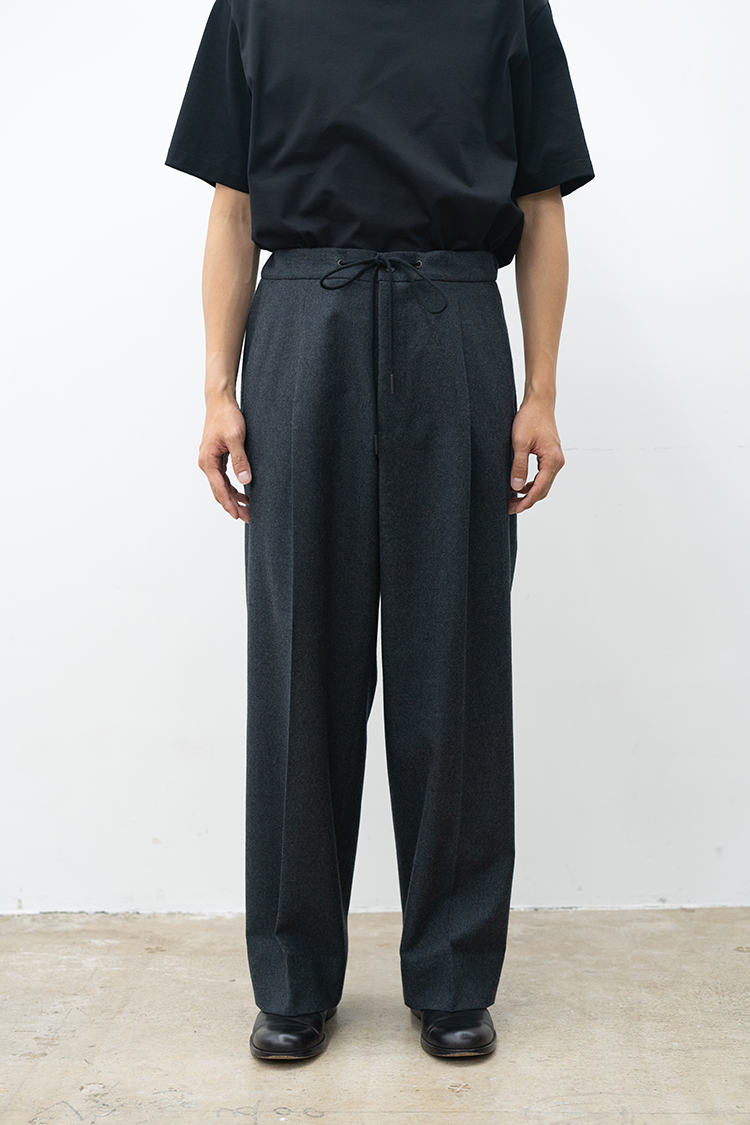 カレッジフランネル素材を使用したイージースラックス。伝統的なスラックスをベースに、ウエストからワンタックを入れ、裾にかけてストレートのラインを出し、クセのないワイドシルエットのパンツに仕上げました。ウエストはスピンドルで絞る仕様で後ろにはゴムを通し、履き心地の良さを実現。ウエスト位置の調整が可能な為、スタイリングにも取り入れやすい一着。ディテールには伝統的なポイントも仕込んだTHE RERACSならではのイージーパンツです。 素材 WOOL 100% ※ 着用詳細 173cm / CHARCOAL GRAY / size 46 サイズスペック 【46】ウエスト‐ ~80.0~cm 股上‐30.0cm 股下‐73.0cm 裾幅‐25.5cm