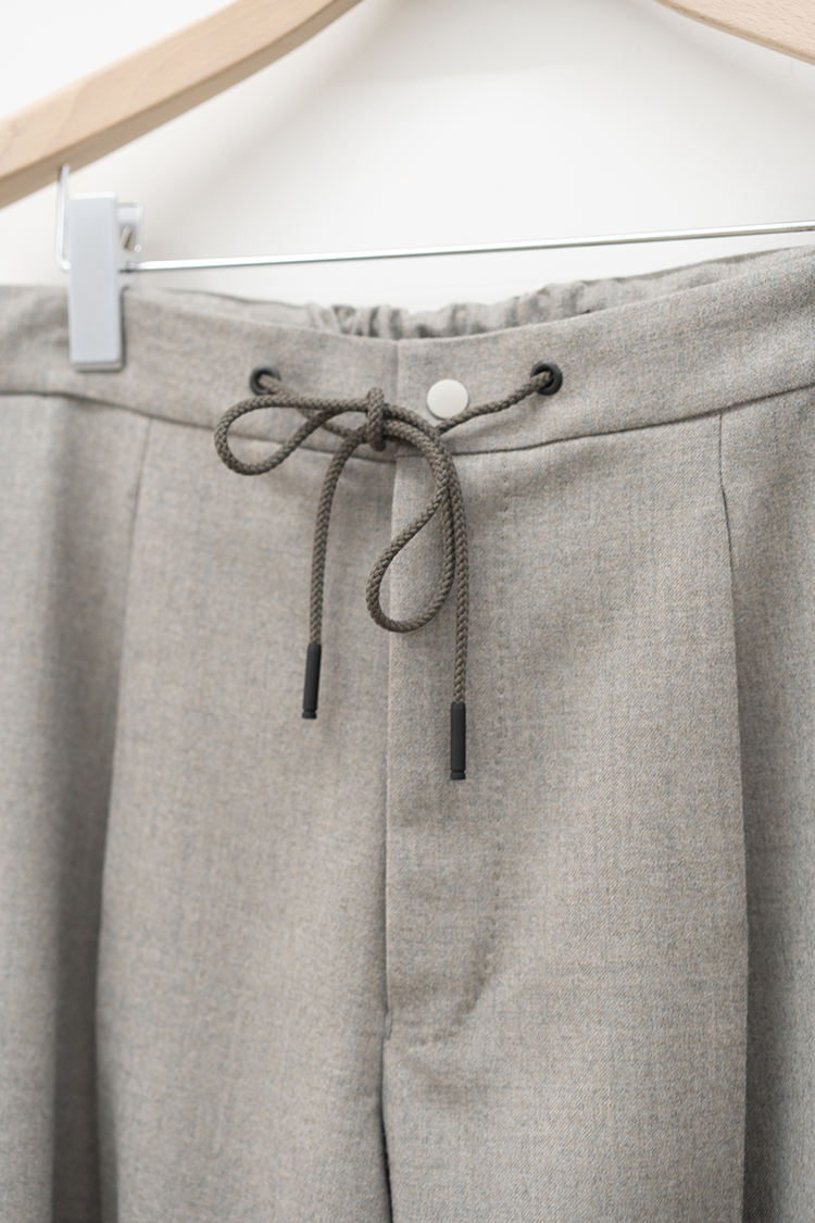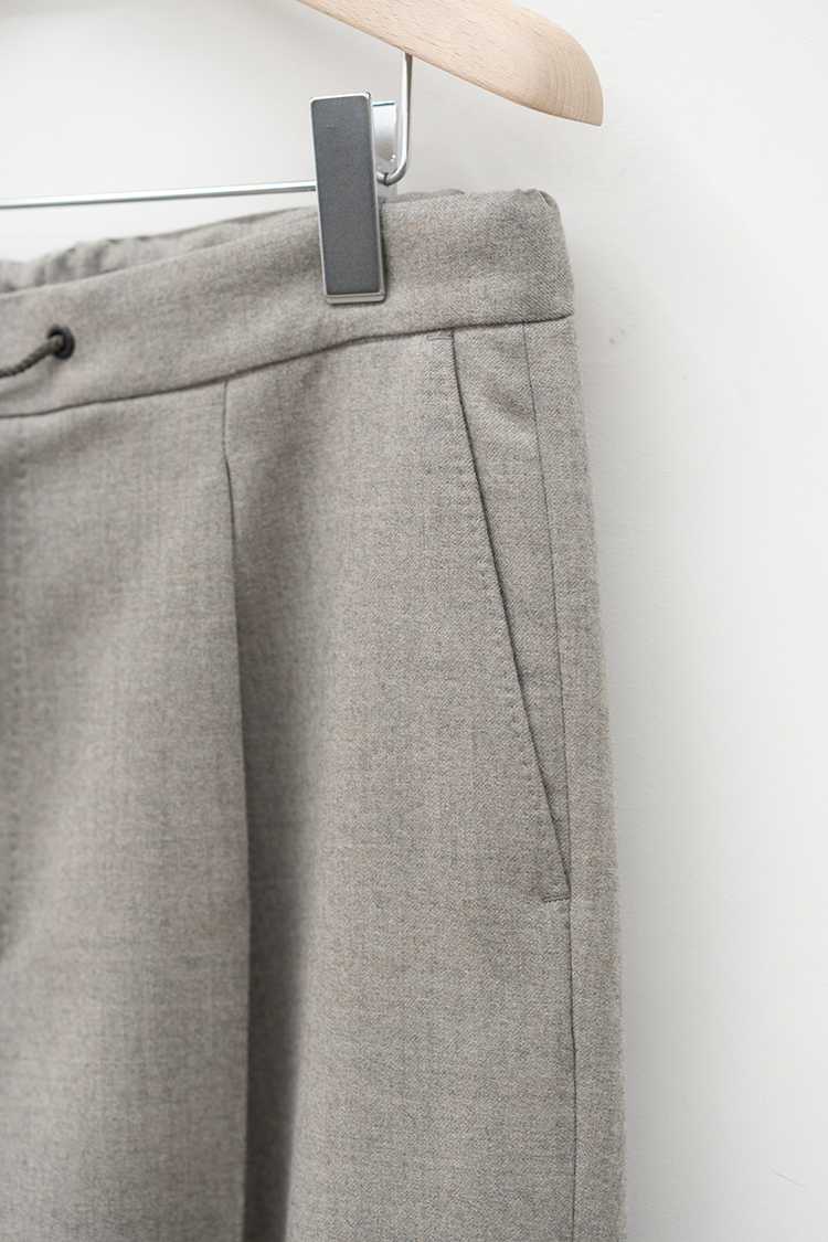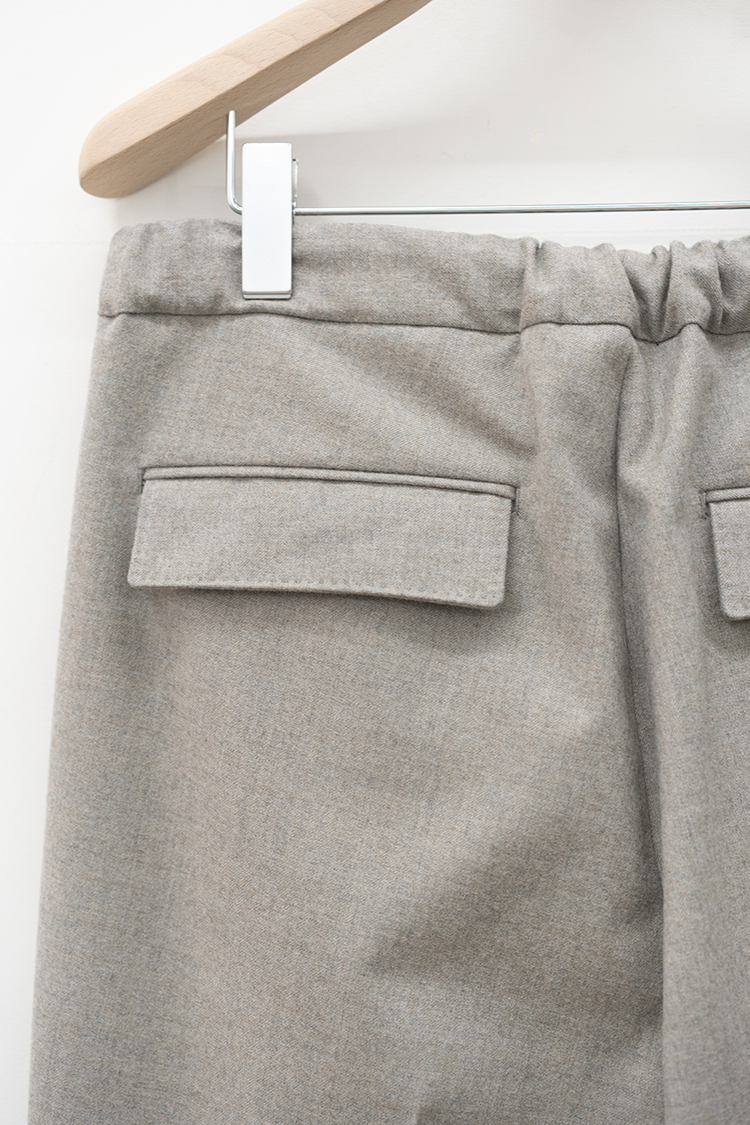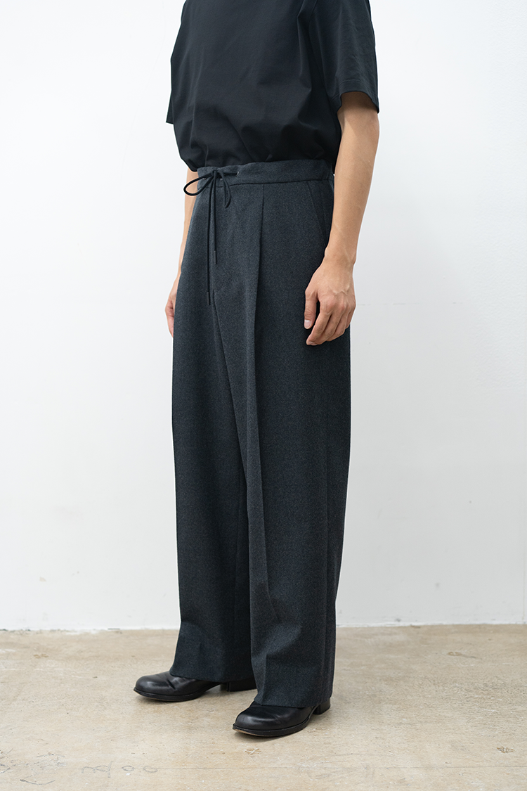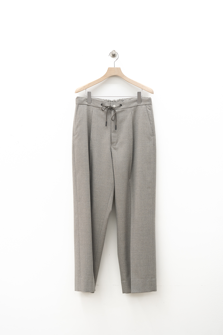 カレッジフランネル素材を使用したイージースラックス。伝統的なスラックスをベースに、ウエストからワンタックを入れ、裾にかけてストレートのラインを出し、クセのないワイドシルエットのパンツに仕上げました。ウエストはスピンドルで絞る仕様で後ろにはゴムを通し、履き心地の良さを実現。ウエスト位置の調整が可能な為、スタイリングにも取り入れやすい一着。ディテールには伝統的なポイントも仕込んだTHE RERACSならではのイージーパンツです。 素材 WOOL 100% ※ 着用詳細 173cm / CHARCOAL GRAY / size 46 サイズスペック 【46】ウエスト‐ ~80.0~cm 股上‐30.0cm 股下‐73.0cm 裾幅‐25.5cm