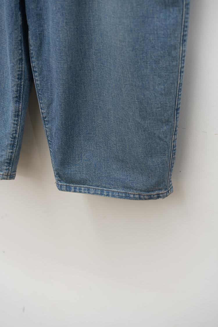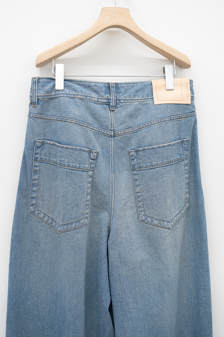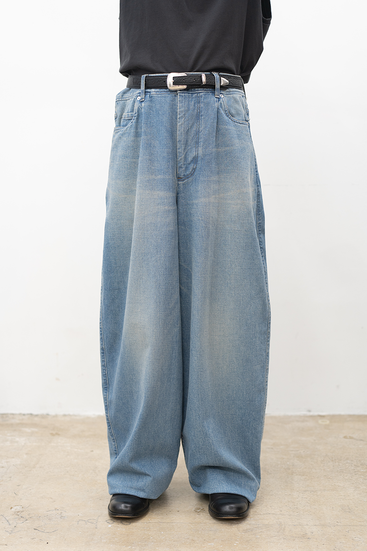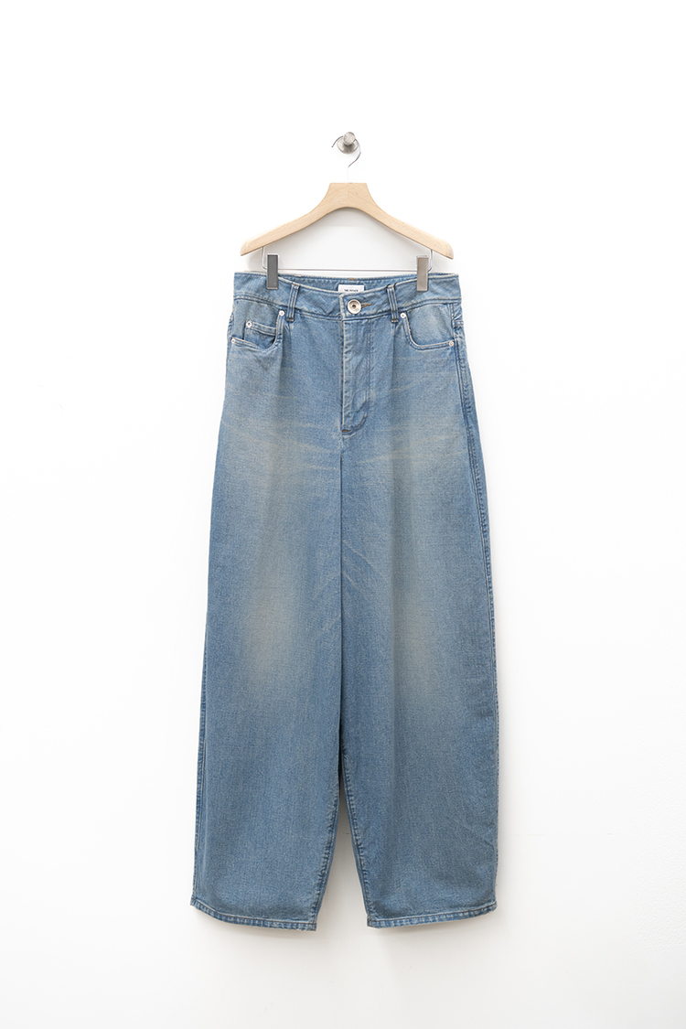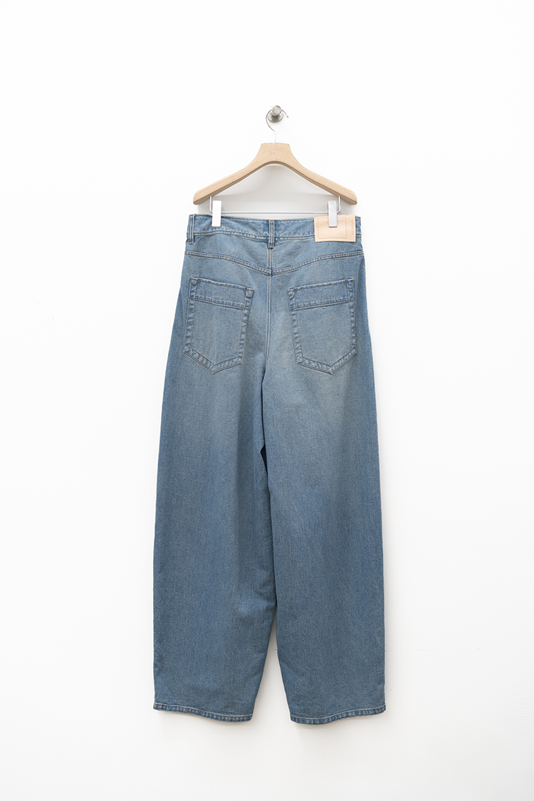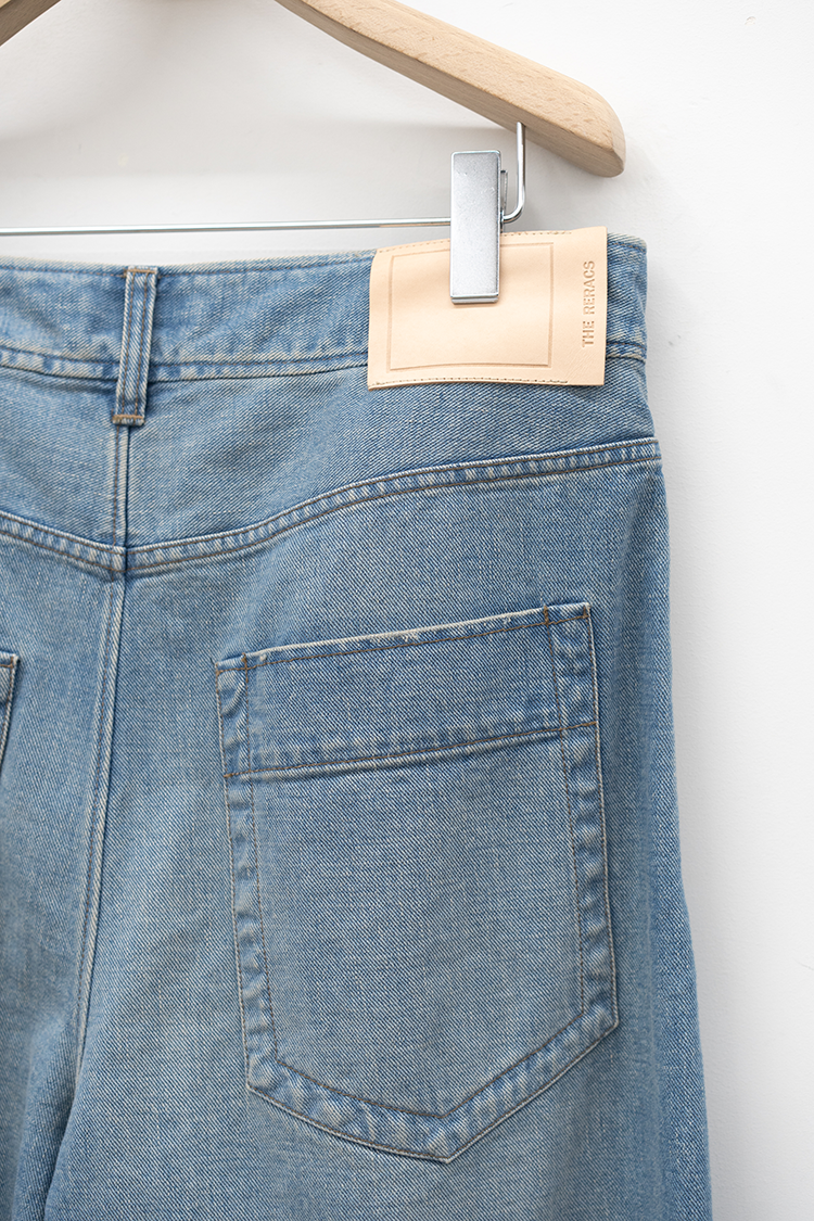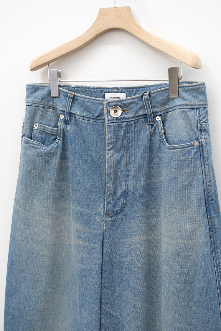 通常のデニム生地とは逆向き、左上がりに織り上げたオリジナルデニム素材レフトハンドデニムを使用したワイドバレルパンツ。光沢感とソフトで軽やかな履き心地が特徴です。ヒップから裾にかけてやや丸みのあるデザインとなっており、ダイナミックで立体感のあるシルエットを生み出しています。ウエストはベルトループの仕様で腰回りが安定した構築的な設計。パッチ部分はレザーを使用しクラシカルな印象にしています。フロントはシルバーのタックボタンを使用。THE RERACSらしい細かなこだわりを感じられ、履き込むほどに経年変化を楽しめる一着です。
