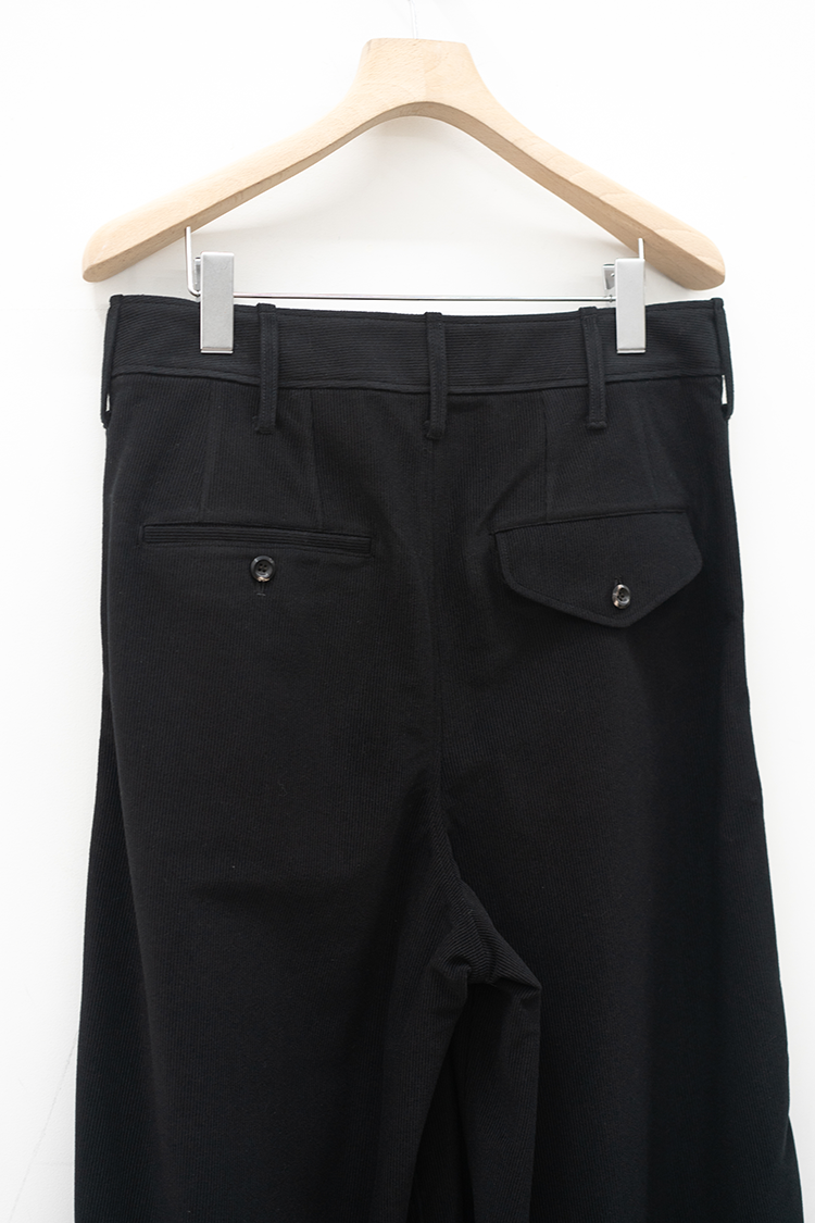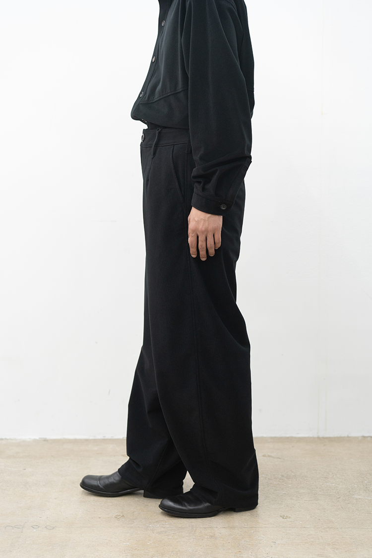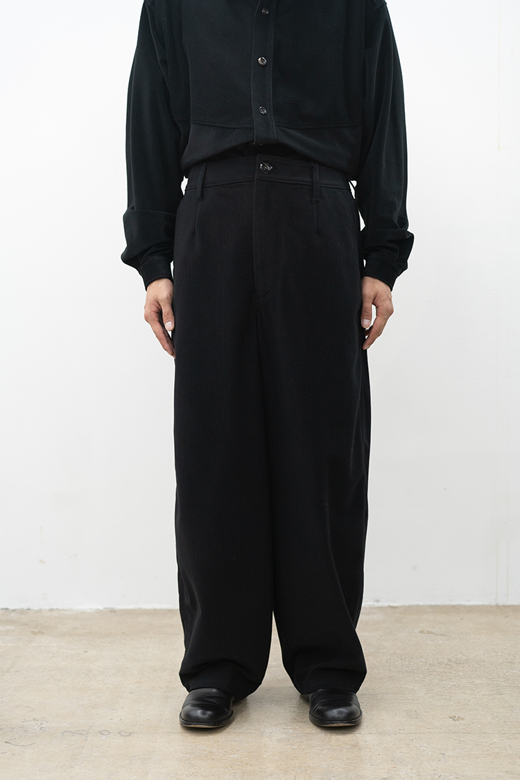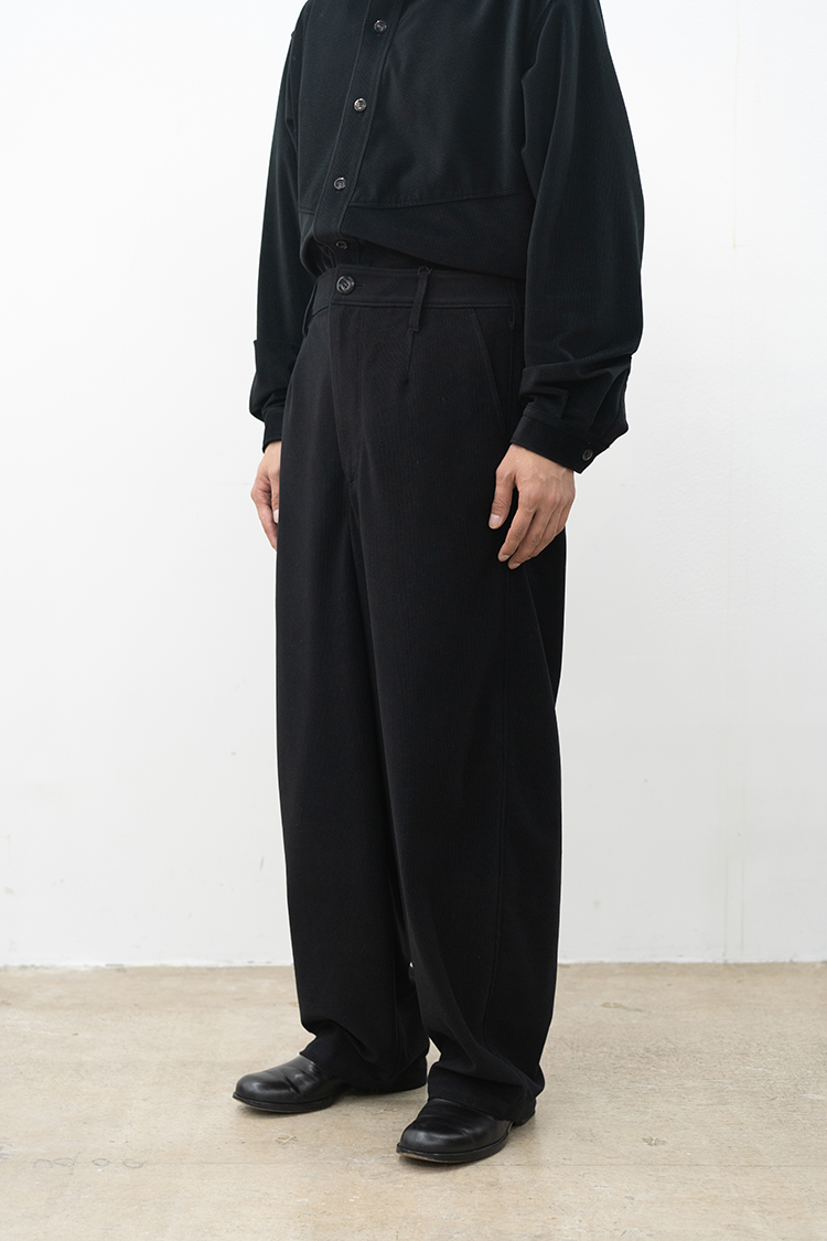 蓄熱機能のあるコーデュロイ素材を使用したワイドバレルパンツ。ポリエステル素材を使用する事で、形状安定性と綺麗な光沢感を失う事なく、コーデュロイ素材のデメリットを解消した風合いを実現。ヒップから裾にかけてやや丸みのあるデザインとなっており、ダイナミックで立体感のあるシルエット。現代的なシルエットをTHE RERACSらしく上品に仕上げています。 素材 POLYESTER 100% ※ 着用詳細 173cm / BLACK / size 46 サイズスペック 【46】ウエスト‐ 80.0cm 股上‐33.0cm 股下‐74.0cm 裾幅‐24.0cm 【48】ウエスト‐ 86.0cm 股上‐34.0cm 股下‐75.0cm 裾幅‐25.0cm
