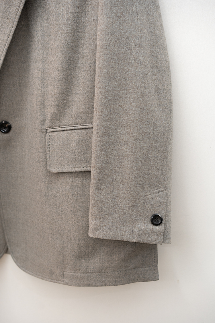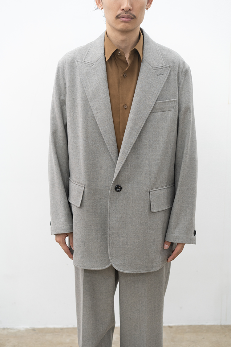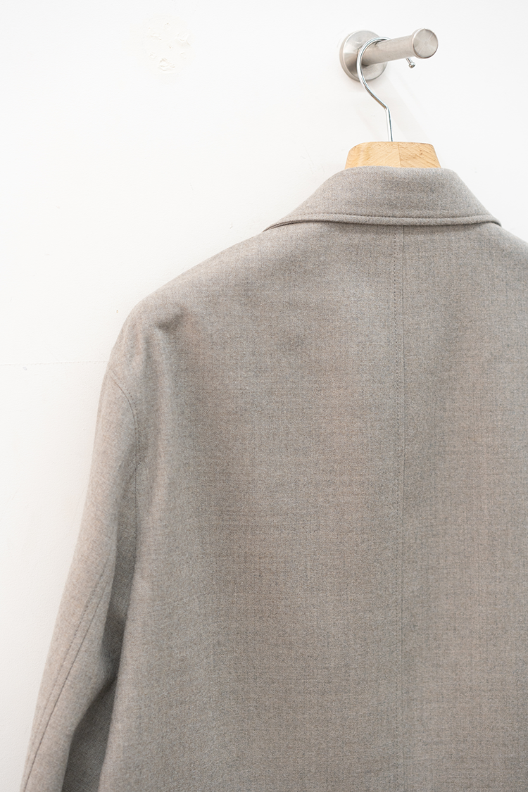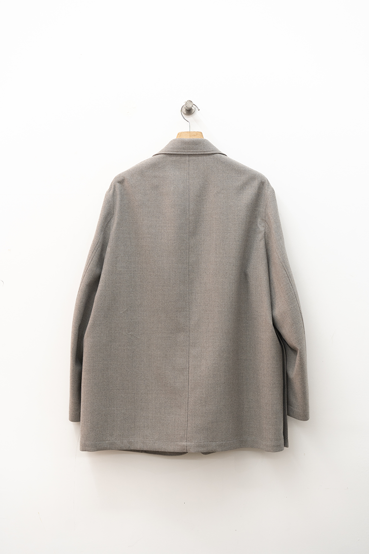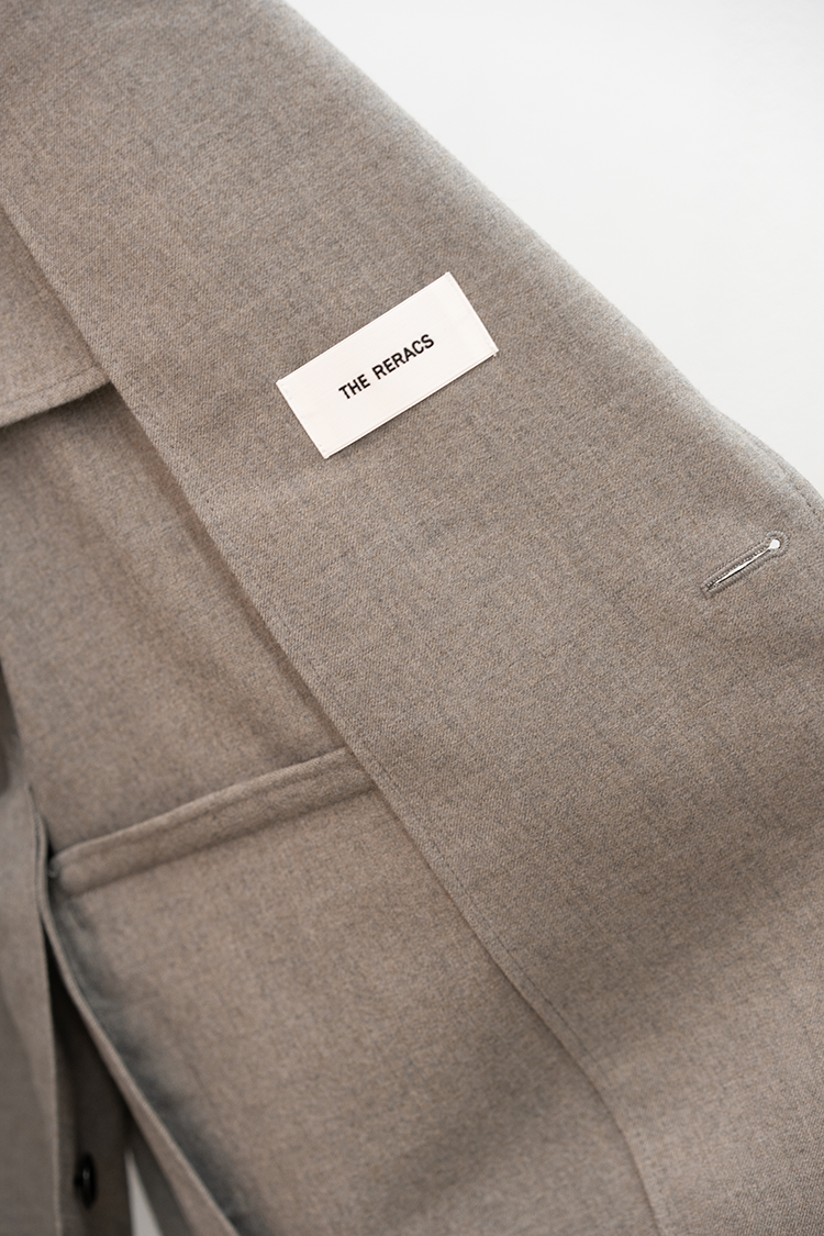 カレッジフランネル素材を使用したミドル丈のイージージャケット。リラックス感のある軽い着心地でありながら、テーラード工場の技術が詰まったピークドラペルや、セットインのショルダー、直線的なボックスシルエットがスタイリッシュな印象を引き立たせます。裏地は付けず折り伏せや袋縫いを施し、軽量かつ美しい仕上がりに。テーラリングの美しさを感じられる佇まいでありながら、温かみのある風合いでカーディガン感覚でも着用ができる、THE RERACSらしい一着に仕上げています。 素材 WOOL 100% ※着用詳細 173cm / GREGE / size 46 サイズスペック 【46】着丈-80.0cm 身幅‐65.0cm 肩幅-50.0cm 袖幅-59.0cm