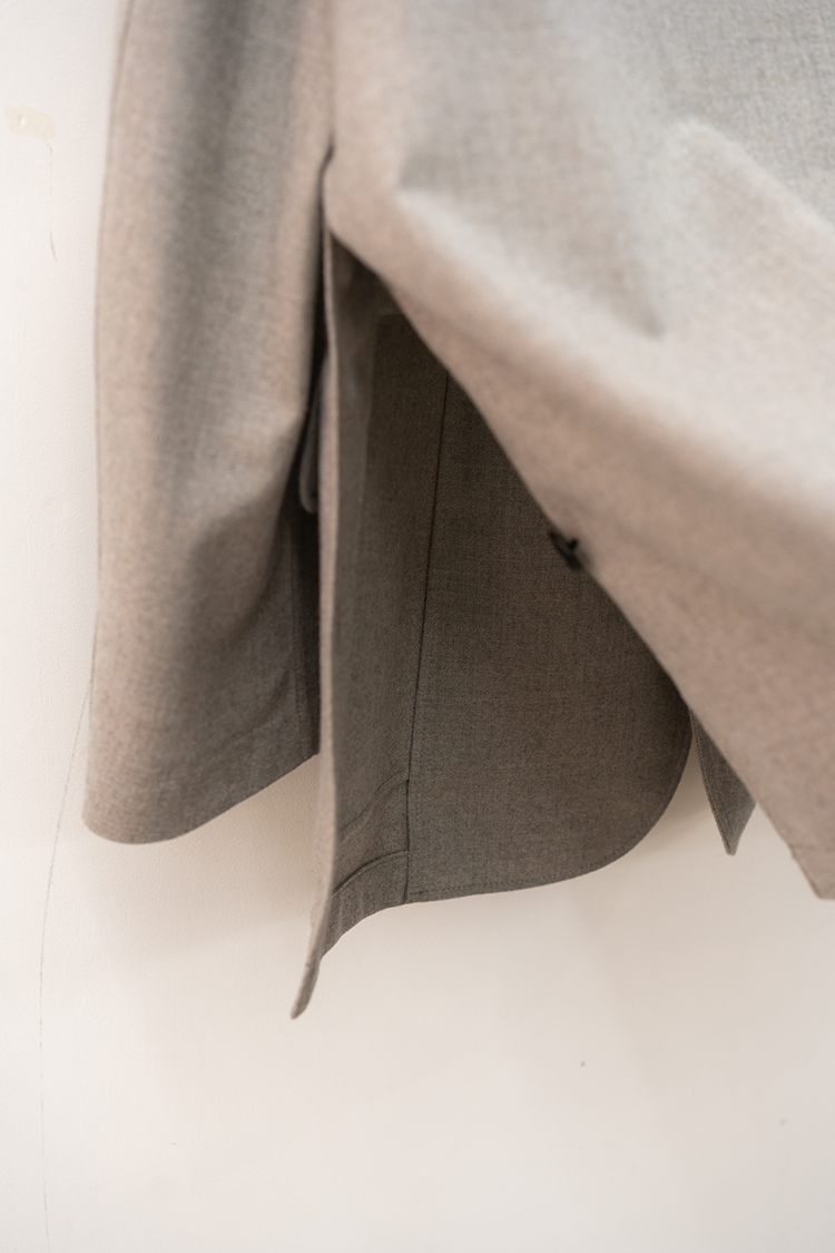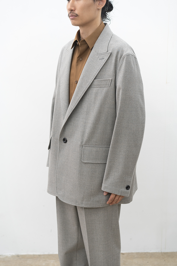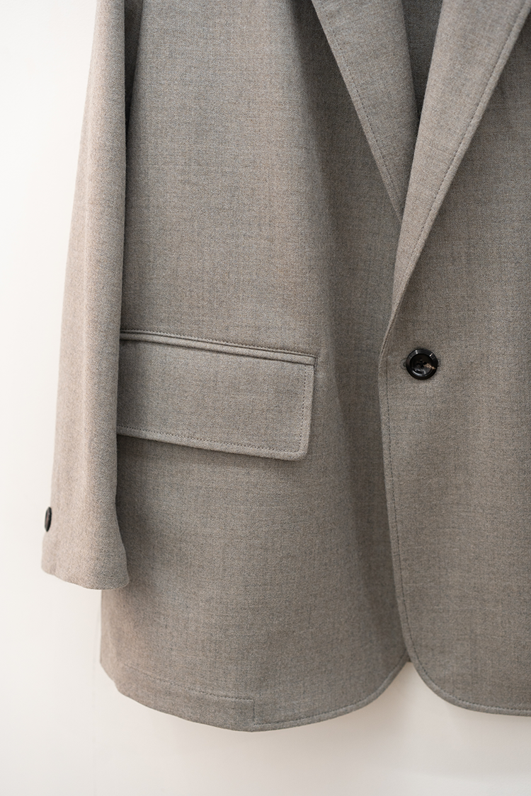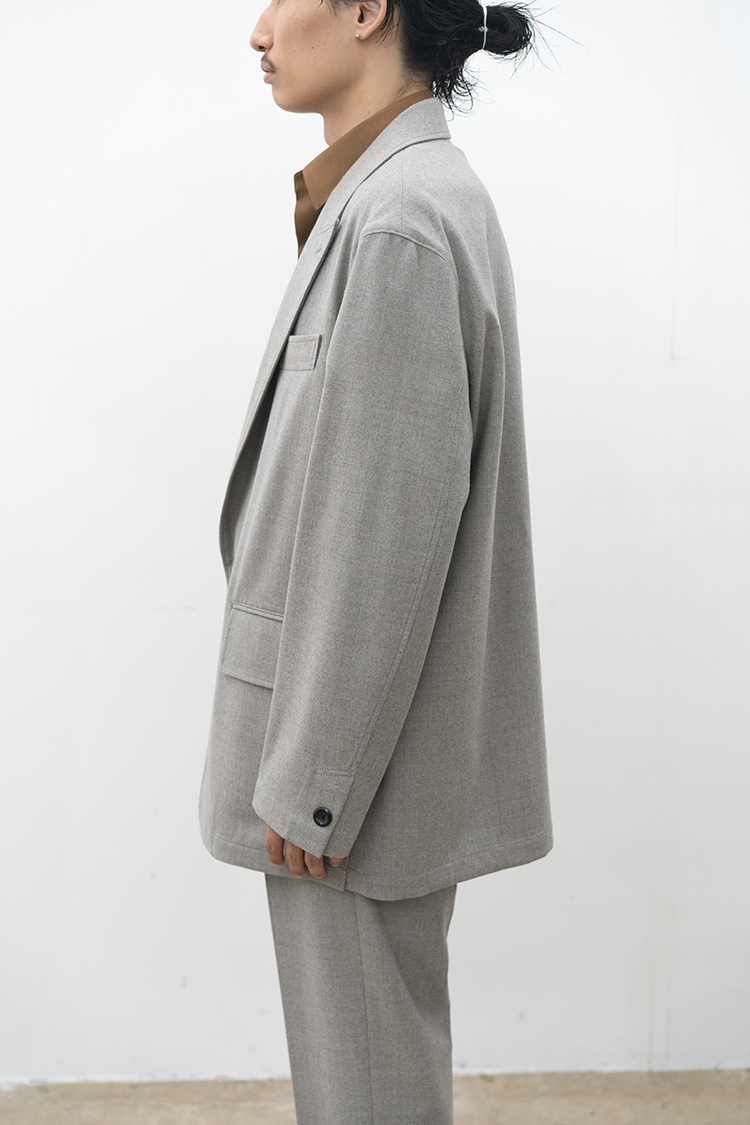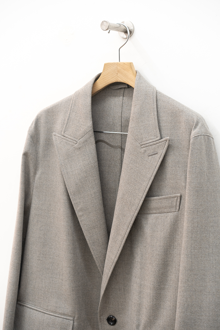 カレッジフランネル素材を使用したミドル丈のイージージャケット。リラックス感のある軽い着心地でありながら、テーラード工場の技術が詰まったピークドラペルや、セットインのショルダー、直線的なボックスシルエットがスタイリッシュな印象を引き立たせます。裏地は付けず折り伏せや袋縫いを施し、軽量かつ美しい仕上がりに。テーラリングの美しさを感じられる佇まいでありながら、温かみのある風合いでカーディガン感覚でも着用ができる、THE RERACSらしい一着に仕上げています。 素材 WOOL 100% ※着用詳細 173cm / GREGE / size 46 サイズスペック 【46】着丈-80.0cm 身幅‐65.0cm 肩幅-50.0cm 袖幅-59.0cm