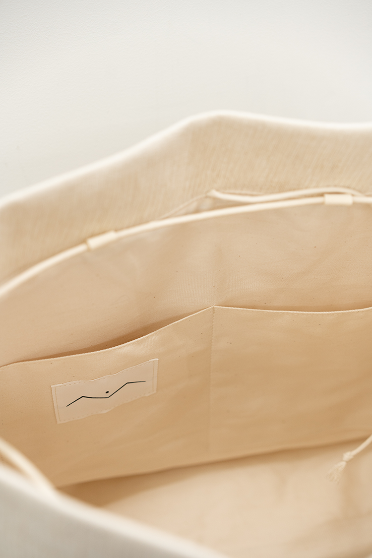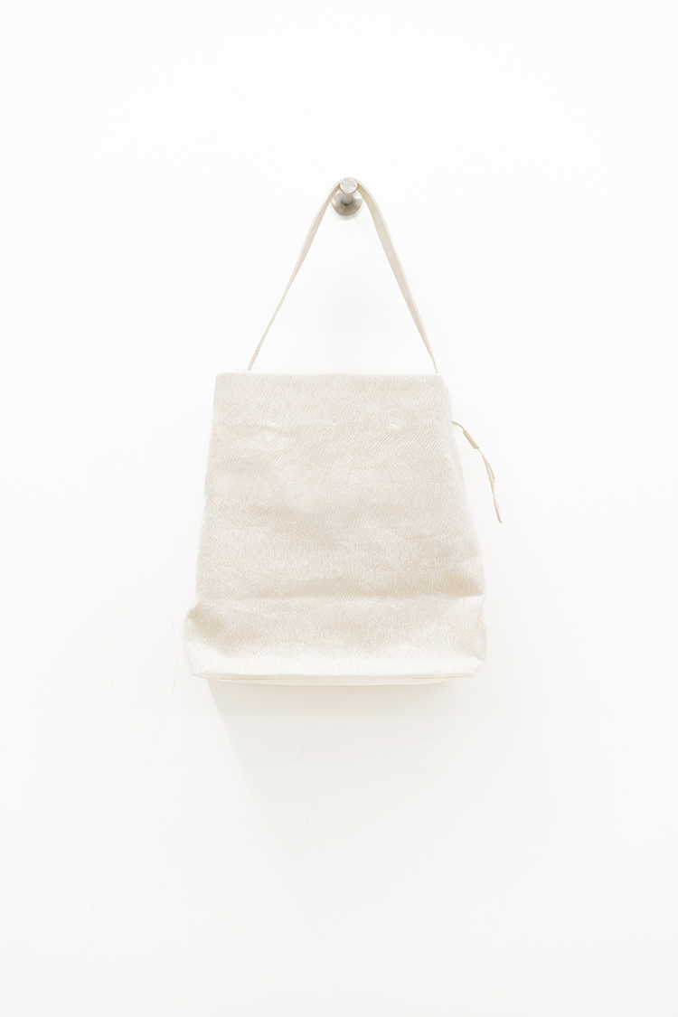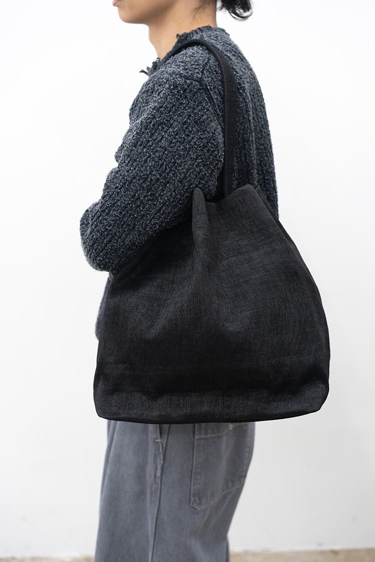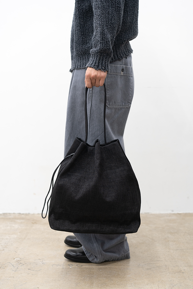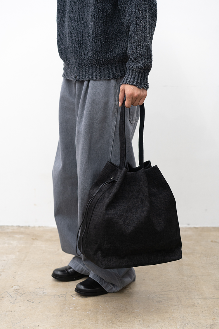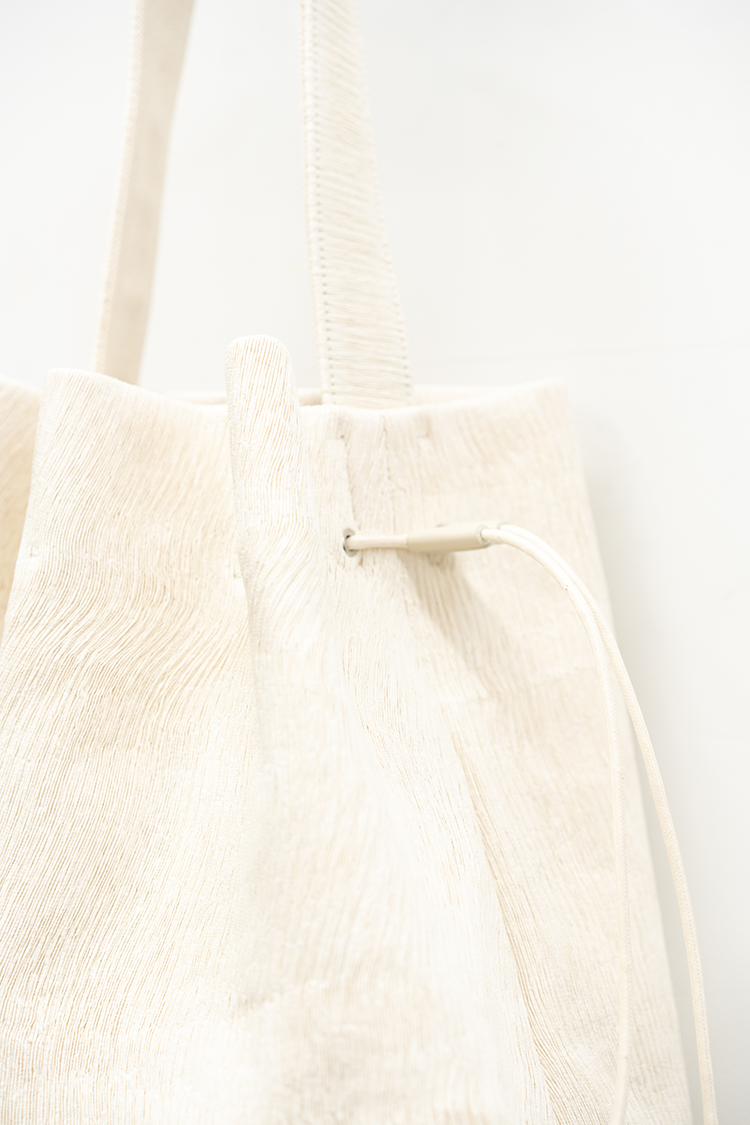 巾着型BAG。 機械編みで可能な限界の極太の糸(和紙)で織られたオリジナル素材。 生地目がうねるような独特な表情が工芸的な素材感も楽しめます。 裏から帆布素材を張り合わせ強度のある素材に仕上げております。 ミニマルなワンショルダーBAGから巾着BAGに表情を変えれる2WAYで内側に2ポケットと収納力も備えたアイテム。 サイズ H37.0cm × W32.0cm × D20.0cm 素材 OUTER MATERIAL / 表地 : PAPER 80% , CUPRO 20% LINING / 裏地 : COTTON 100%