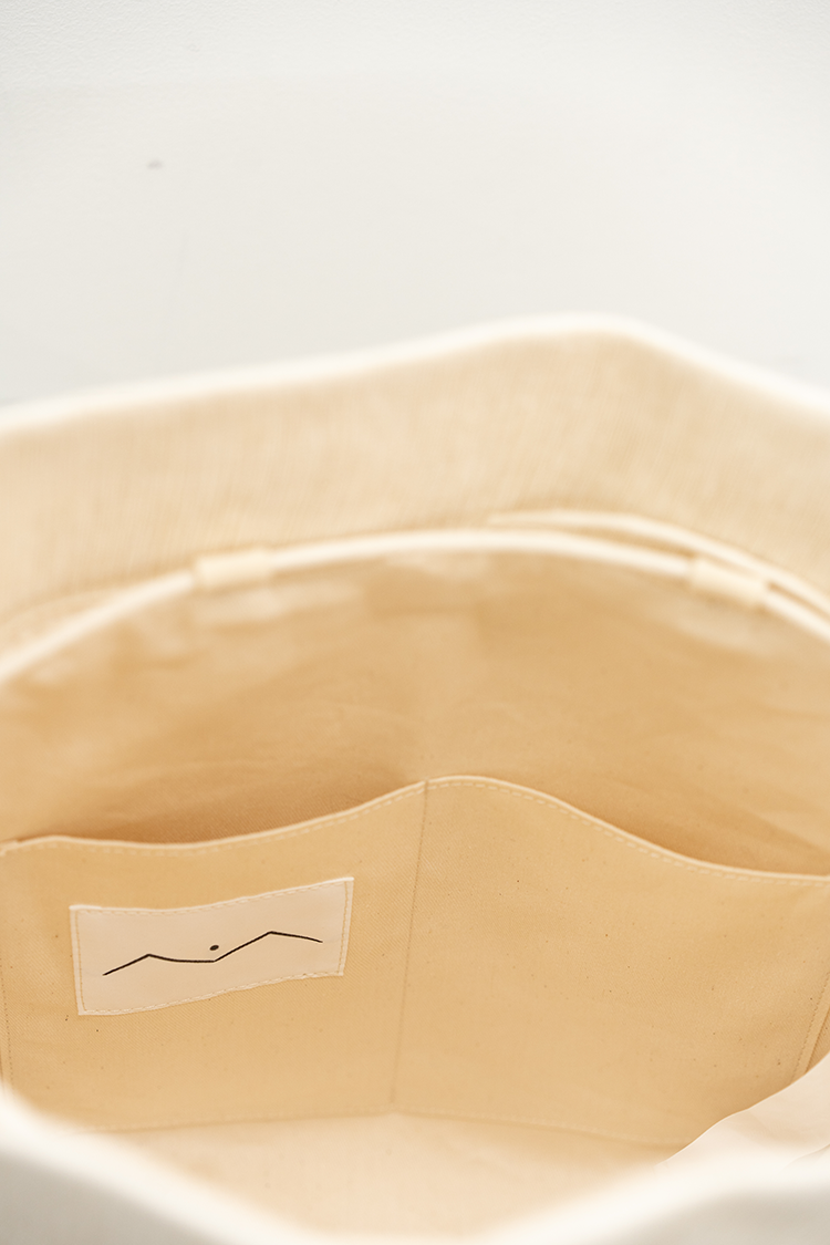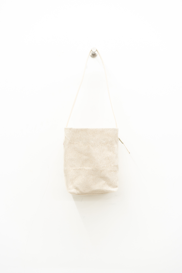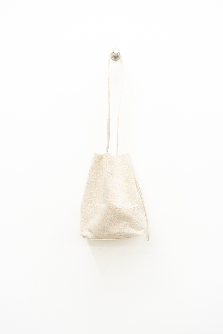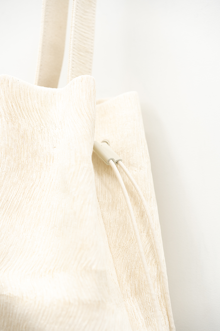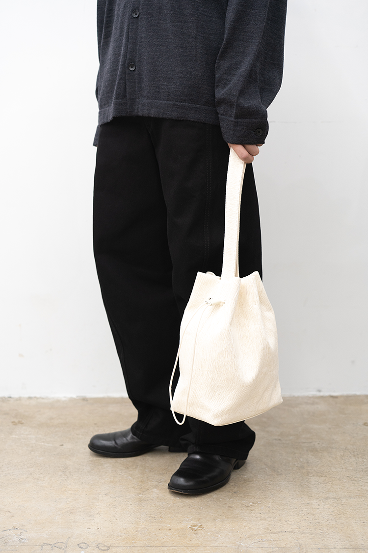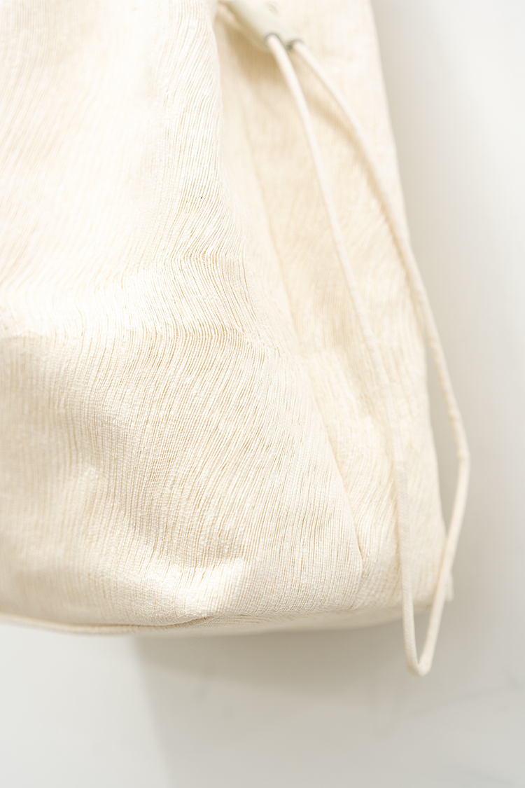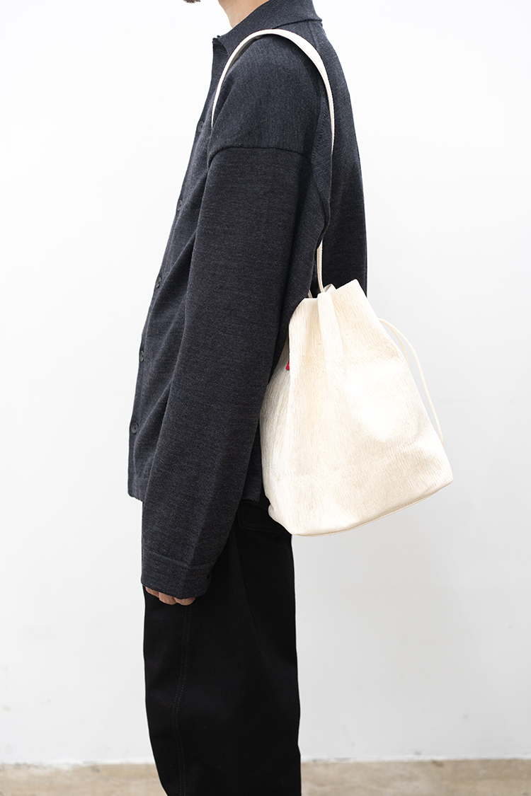 巾着型BAG。 機械編みで可能な限界の極太の糸(和紙)で織られたオリジナル素材。 生地目がうねるような独特な表情が工芸的な素材感も楽しめます。 裏から帆布素材を張り合わせ強度のある素材に仕上げております。 ミニマルなワンショルダーBAGから巾着BAGに表情を変えれる2WAYで内側に2ポケットと収納力も備えたアイテム。 サイズ H30.0cm × W22.0cm × D12.0cm 素材 OUTER MATERIAL / 表地 : PAPER 80% , CUPRO 20% LINING / 裏地 : COTTON 100%